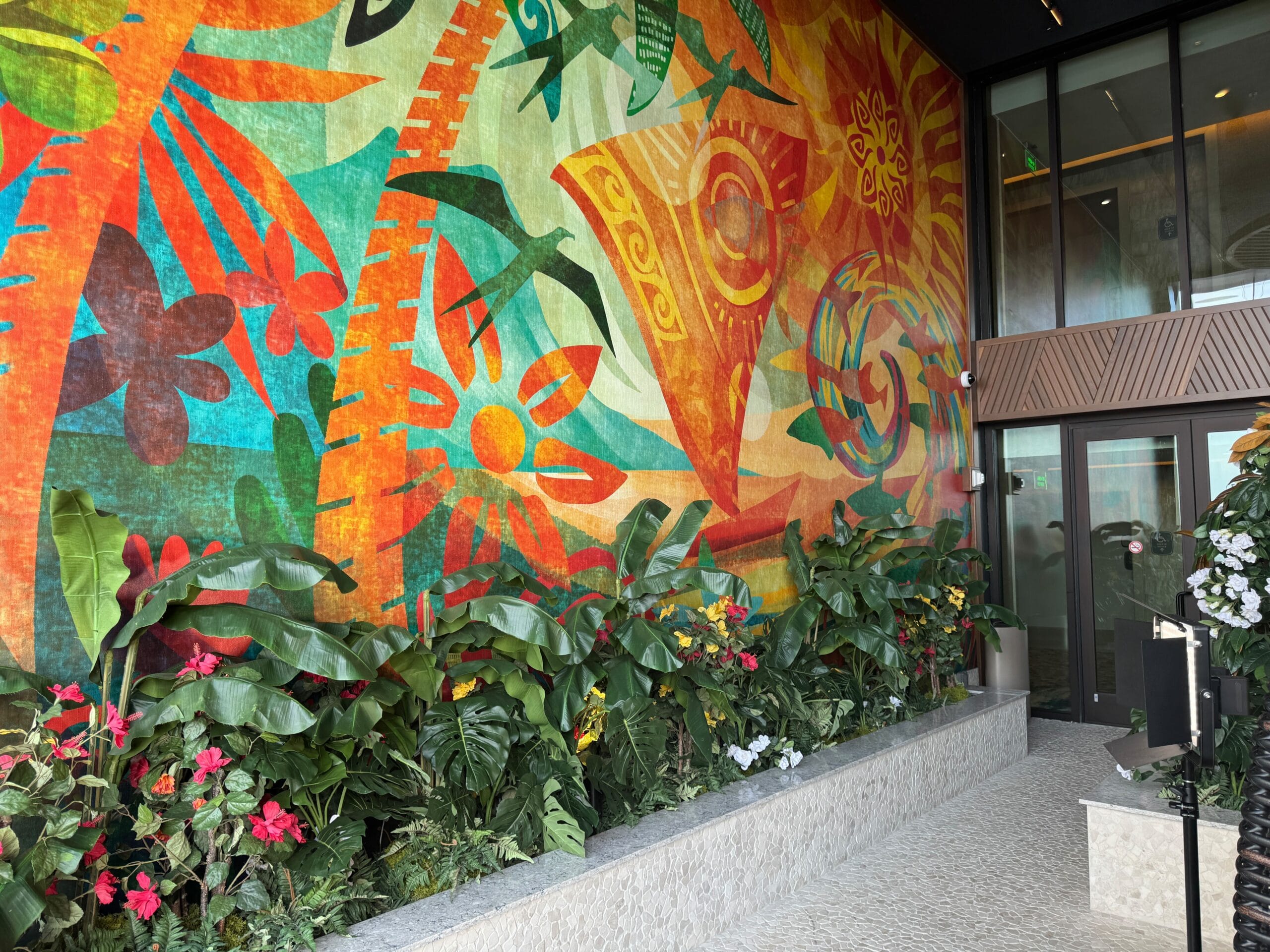 A vibrant, colorful mural with abstract floral patterns decorates a wall above lush green plants near an entrance, reminiscent of the enchanting vibes of Disney's Polynesian Villas.