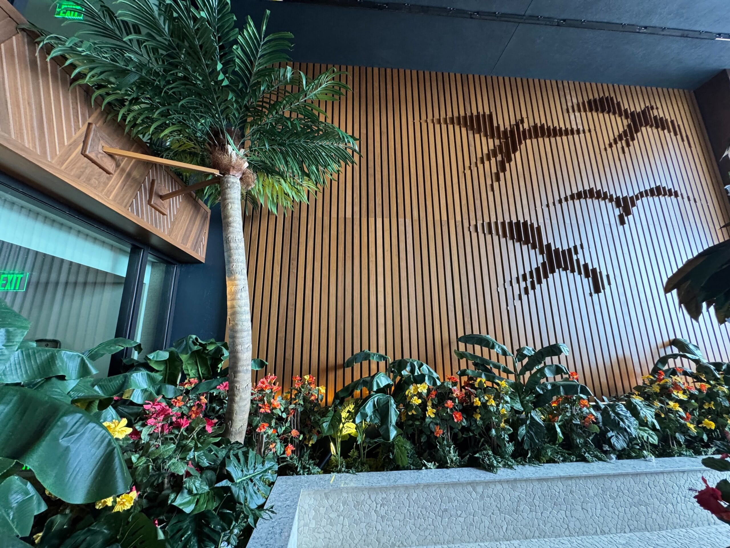 The indoor garden at Disney's Polynesian Villas features a tall palm tree, colorful flowers, and wall art of birds in flight on wooden paneling, evoking the serene charm of bungalows.