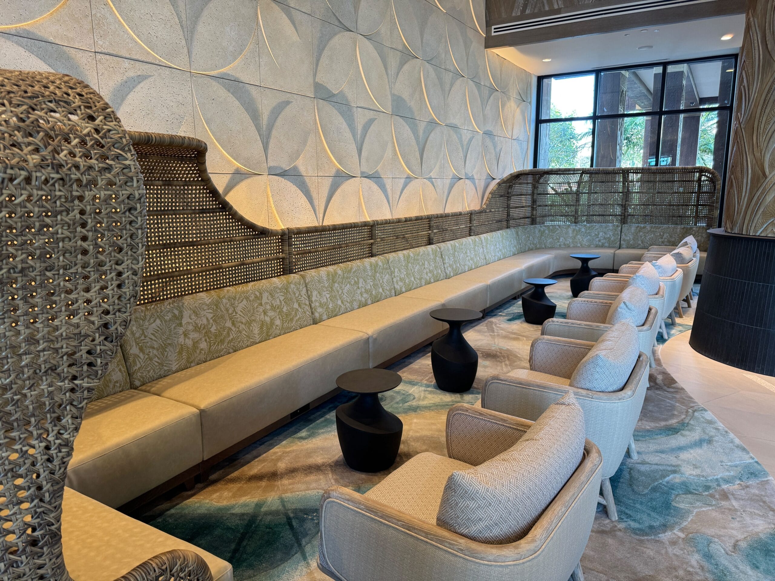 The lobby’s seating includes light-colored armchairs and long benches. The benches have curved wicker backs.