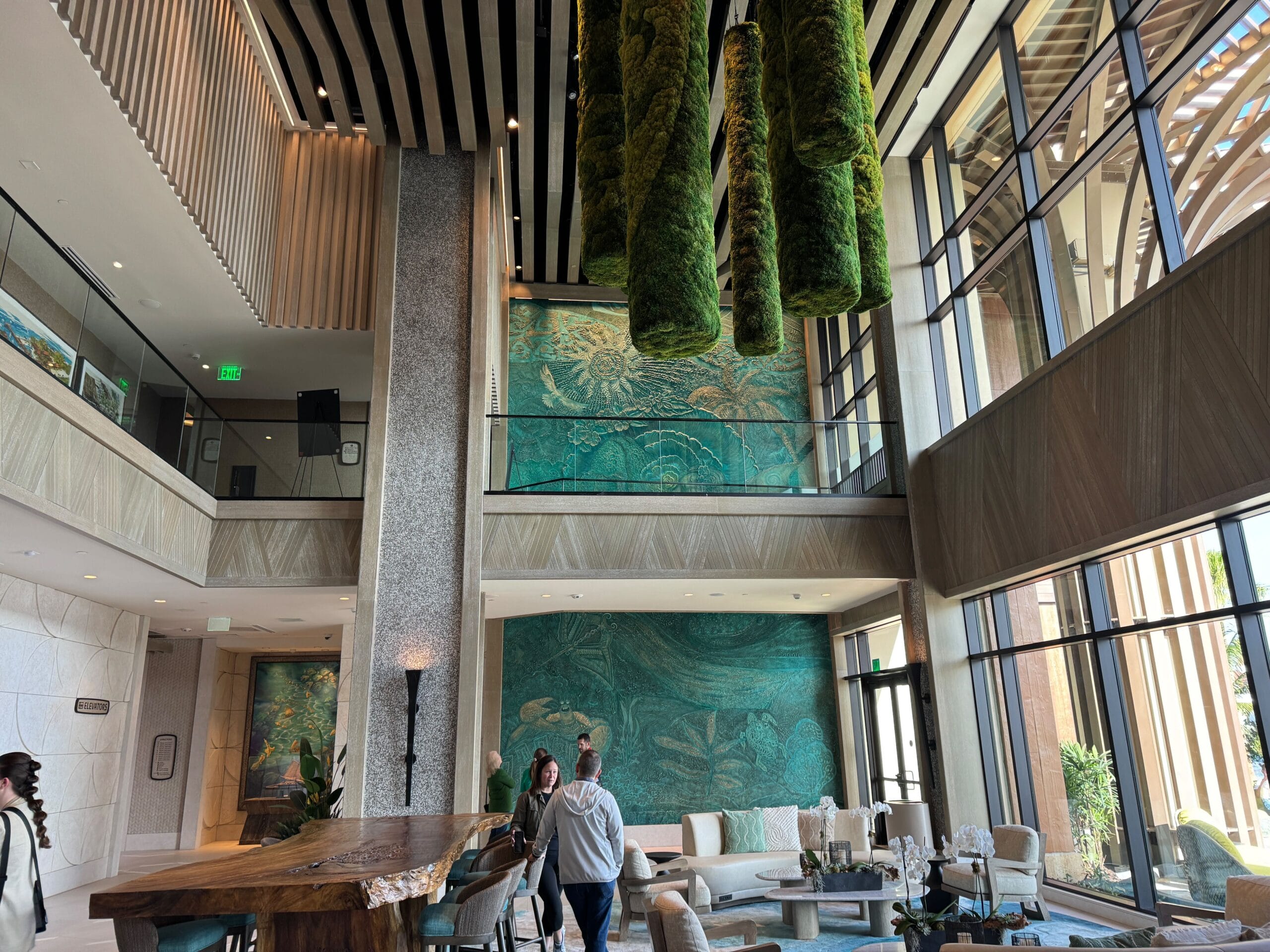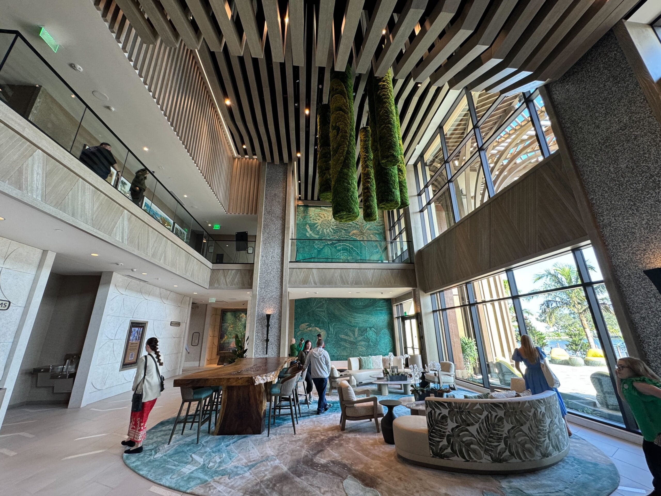 Spacious hotel lobby with high ceilings, hanging green plants, large windows, wooden accents, seating areas, and people walking around.