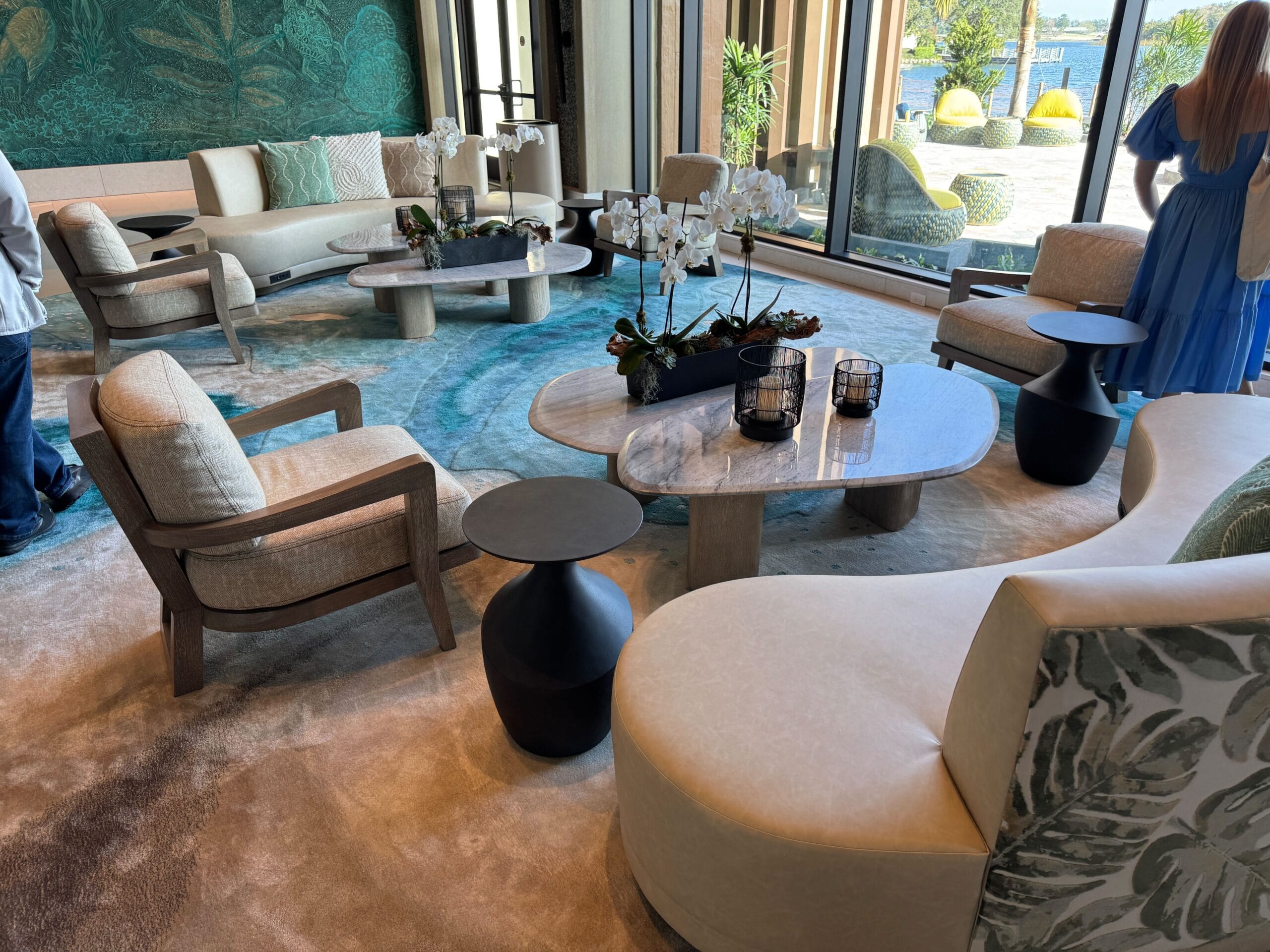 Coffee tables in this area have white marble tops. There are also small black tables between the armchairs and couches. The backs of the couches have leaf patterns.