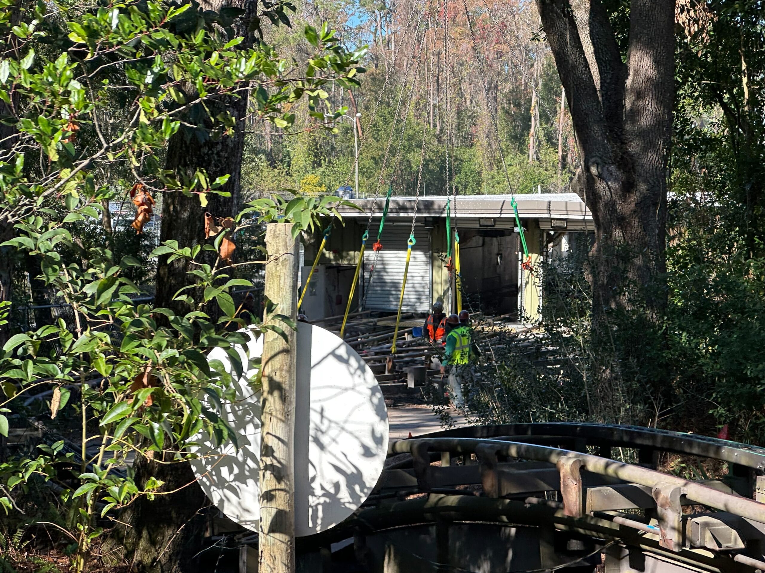 First, we caught a glimpse of construction crew members standing near the attraction’s maintenance barn. A large section of metal track is being lowered from a crane.