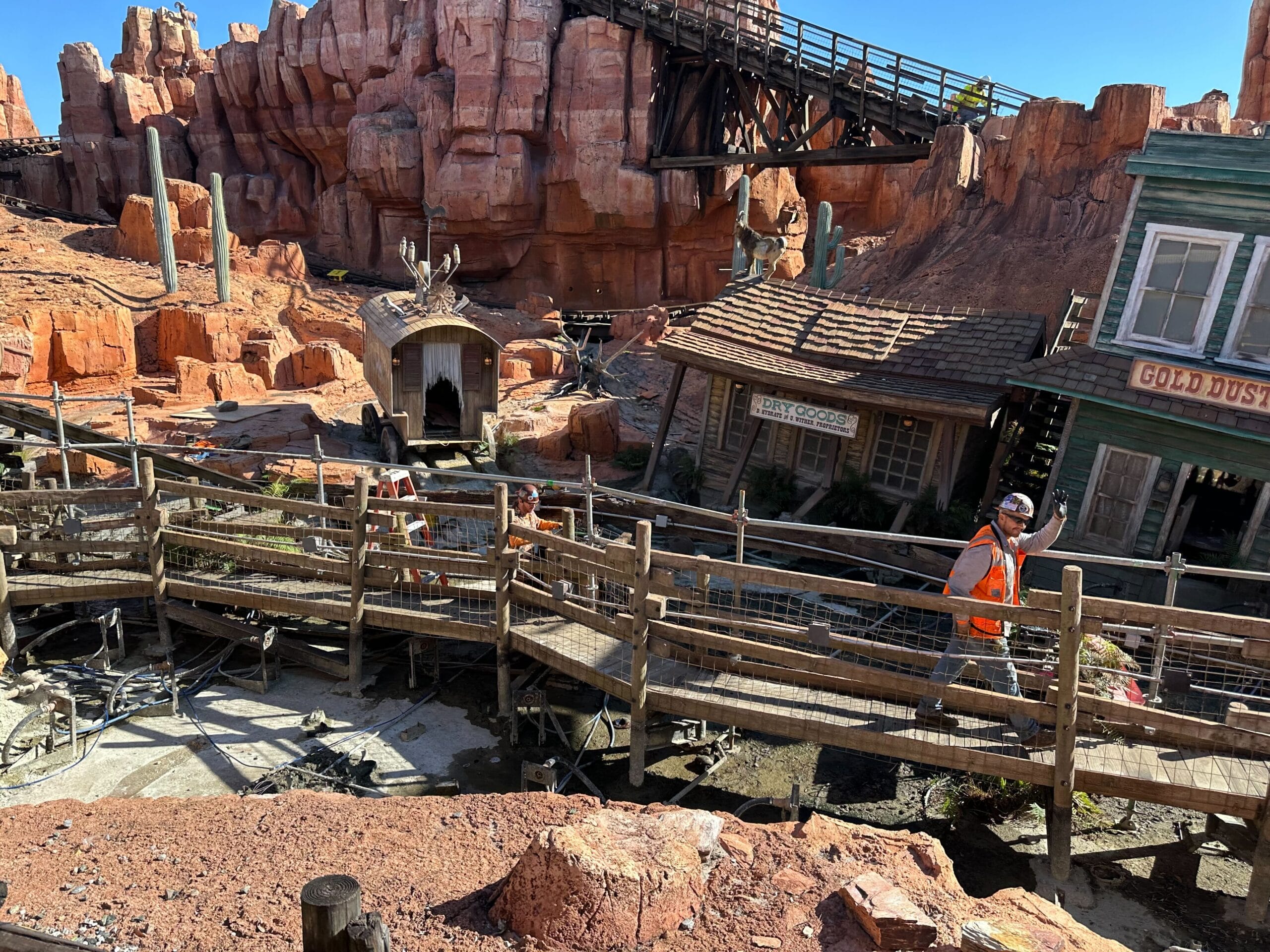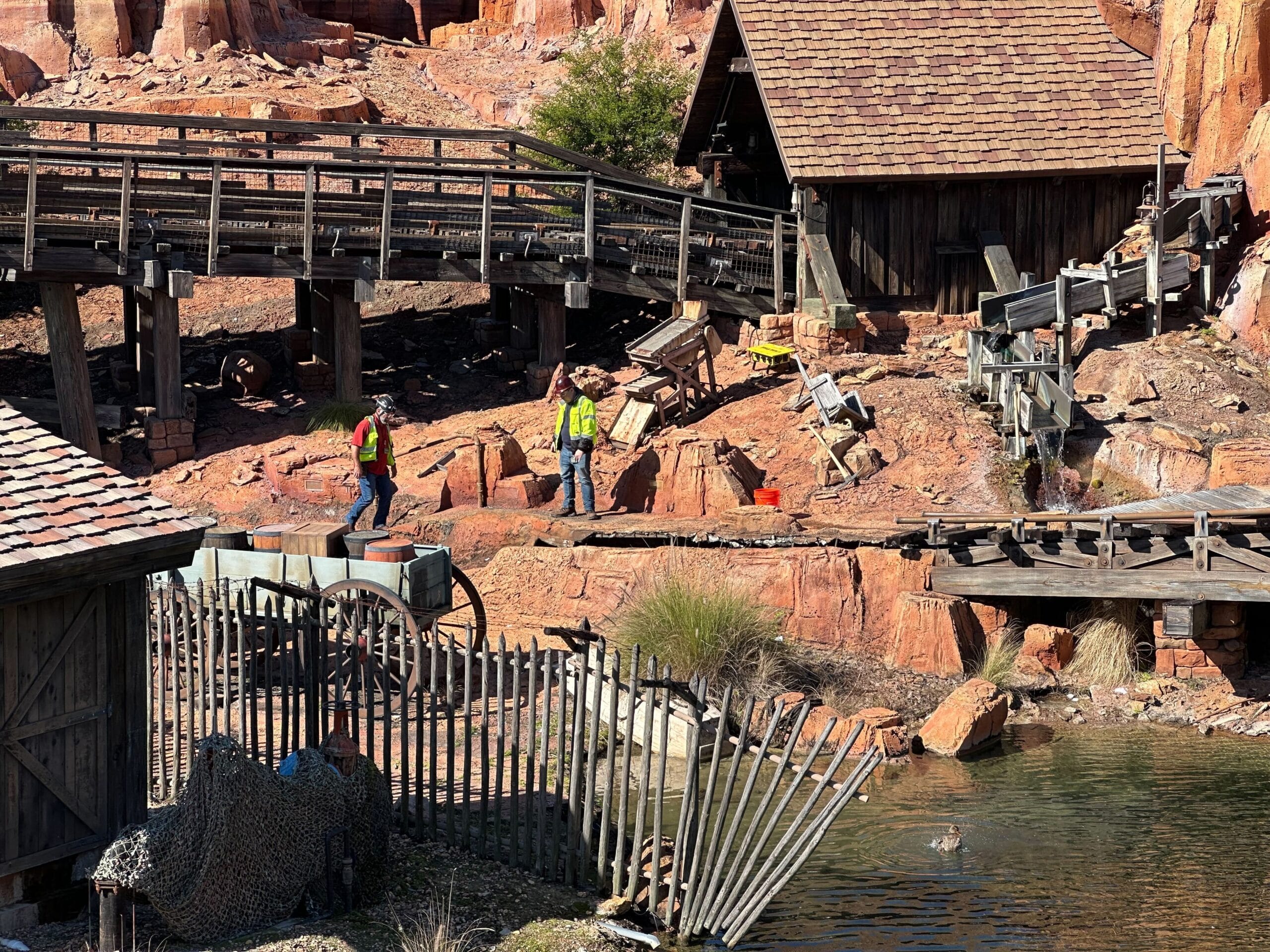 Two workers in safety vests stand near a wooden cart and old mining equipment beside a dirt path and bridge, capturing the essence of a construction update underway at Big Thunder Mountain Railroad.