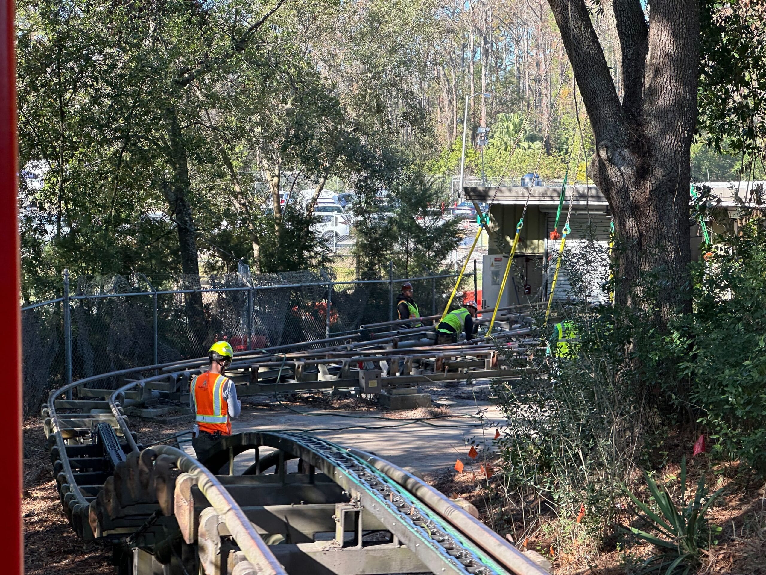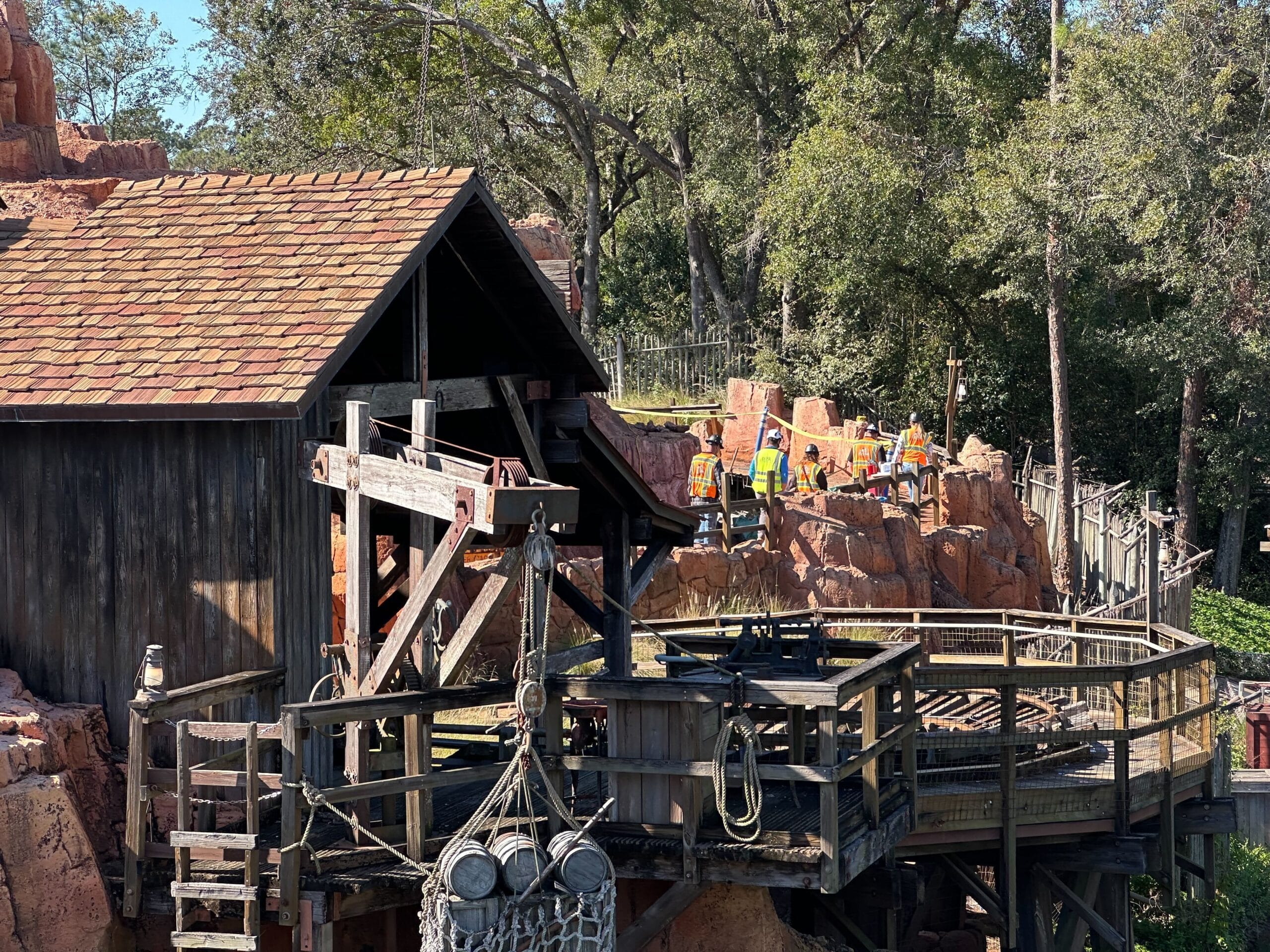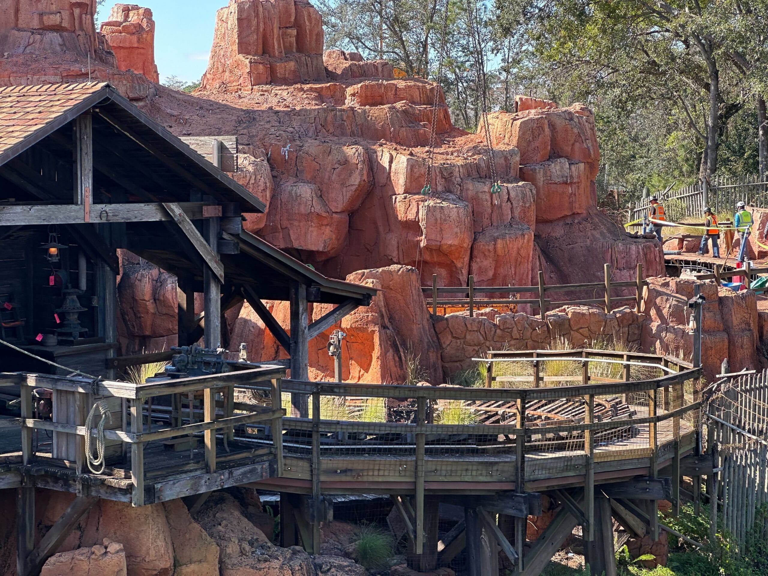 Workers in safety gear inspect and work on the Big Thunder Mountain Railroad roller coaster track, surrounded by trees and fencing. This latest construction update offers a glimpse into the meticulous maintenance process.