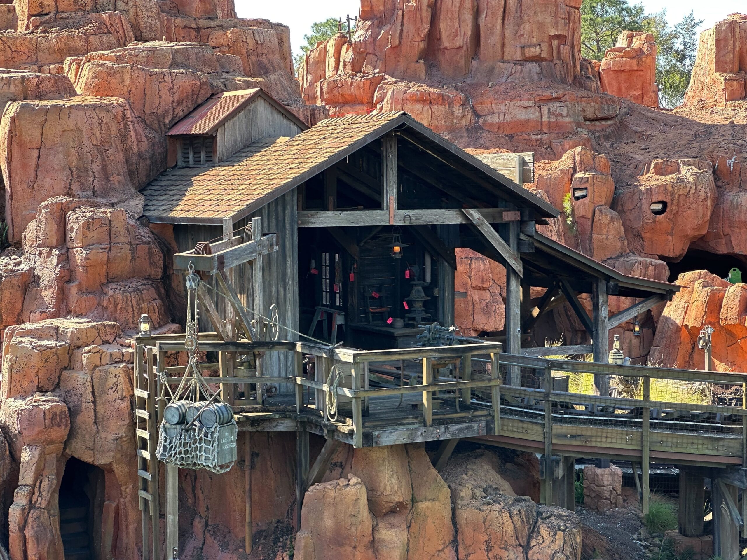 Perched on a rocky outcrop, the wooden cabin offers a sweeping view of the rugged terrain, reminiscent of Big Thunder Mountain Railroad. A suspended rope basket adds to its rustic charm, while recent construction updates enhance its blend with nature.