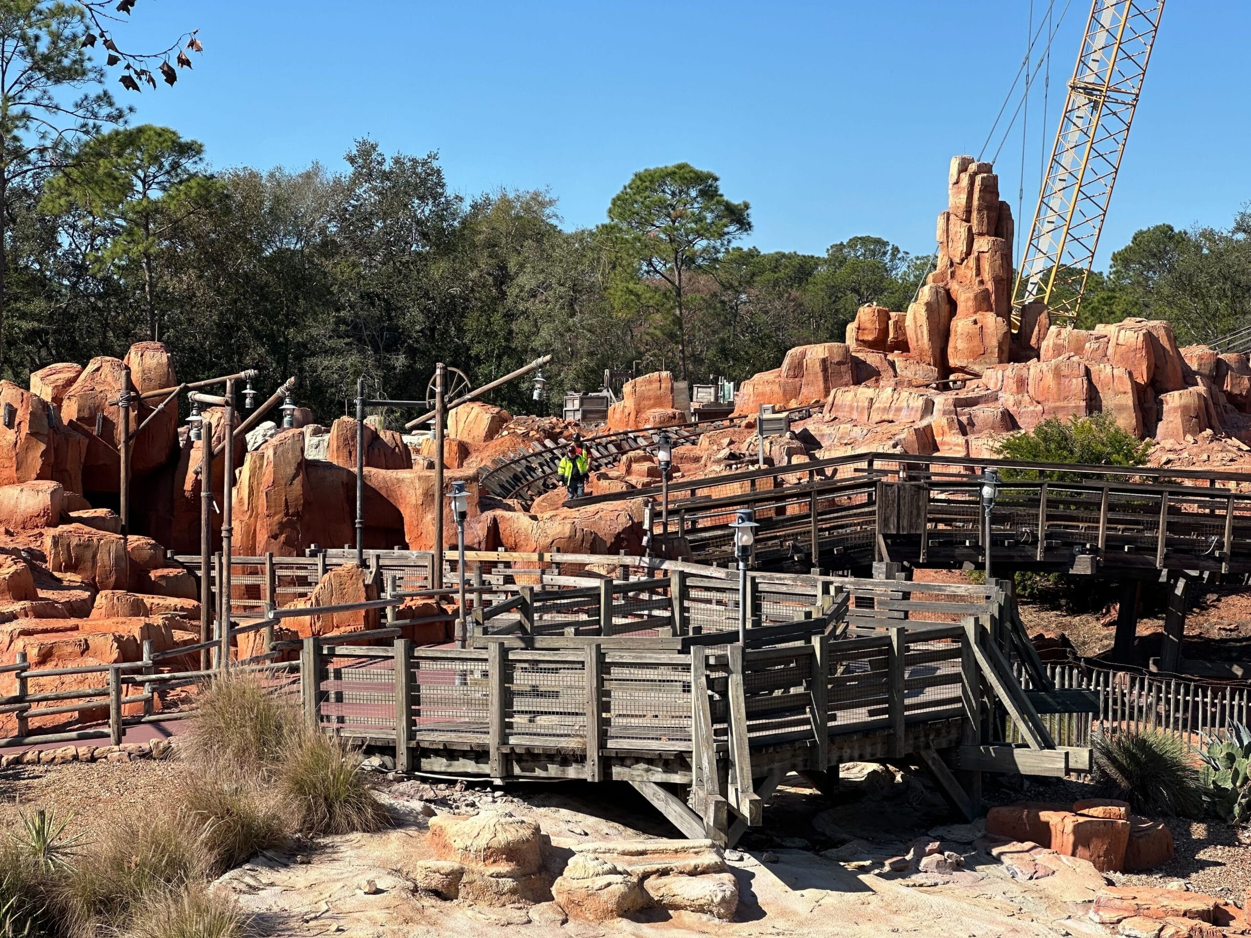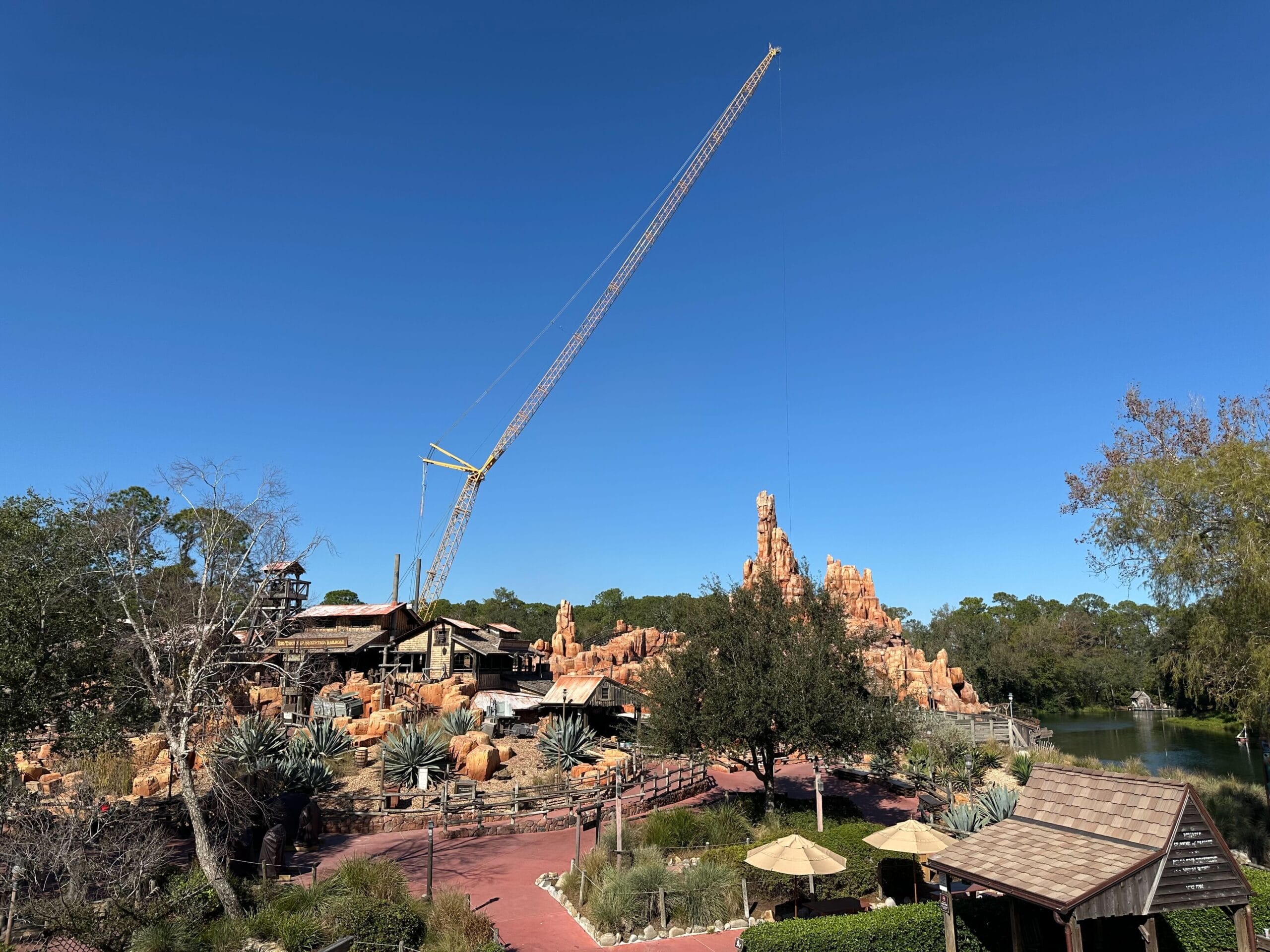 A construction crane towers over the theme park, its silhouette enhancing the desert-like landscape near Big Thunder Mountain Railroad. Lush greenery complements the scene's rugged charm against a clear blue sky, with photos capturing every detail of this enchanting construction update.