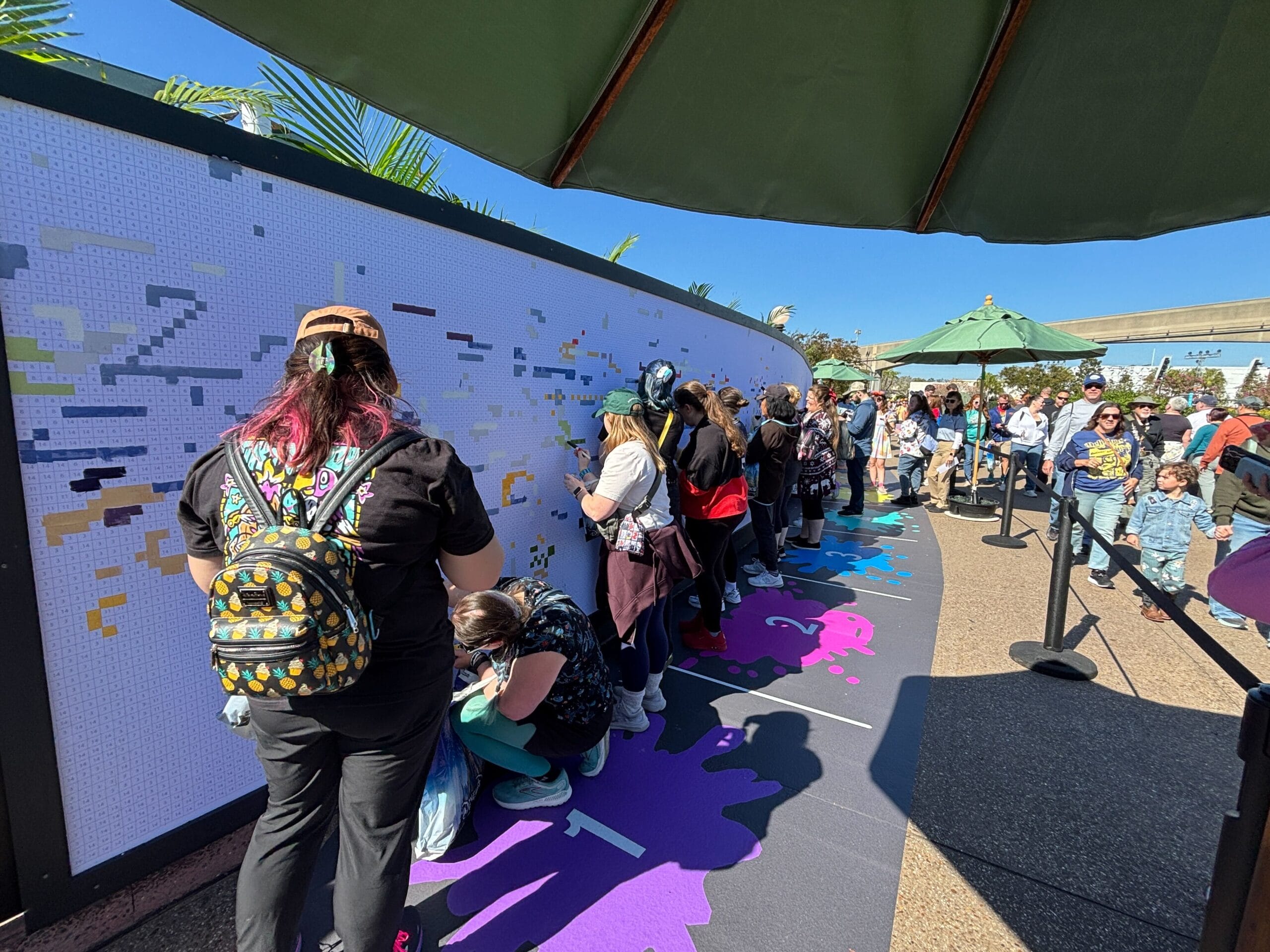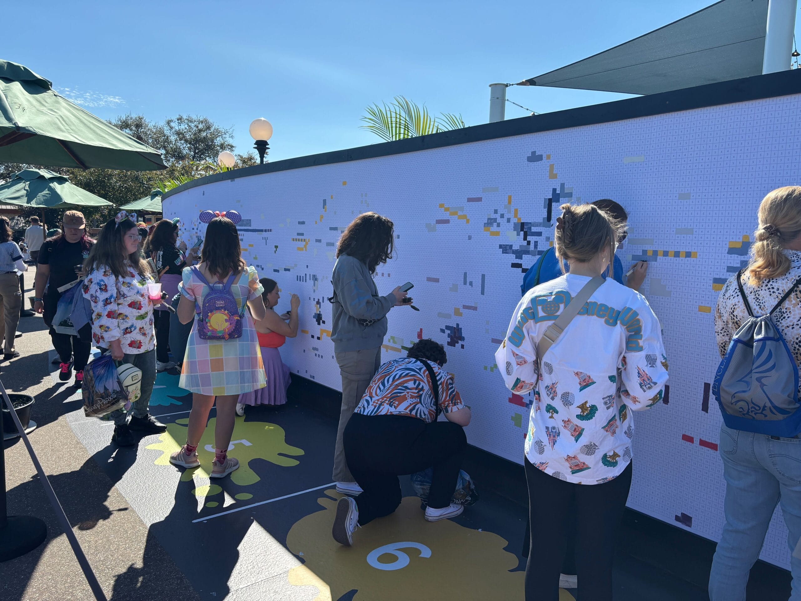 A Cast Member assigns each party to one of the sections numbered on the ground. Cast Members ask that each guest paint just five squares on the mural to make sure the largest number of guests can participate each day.