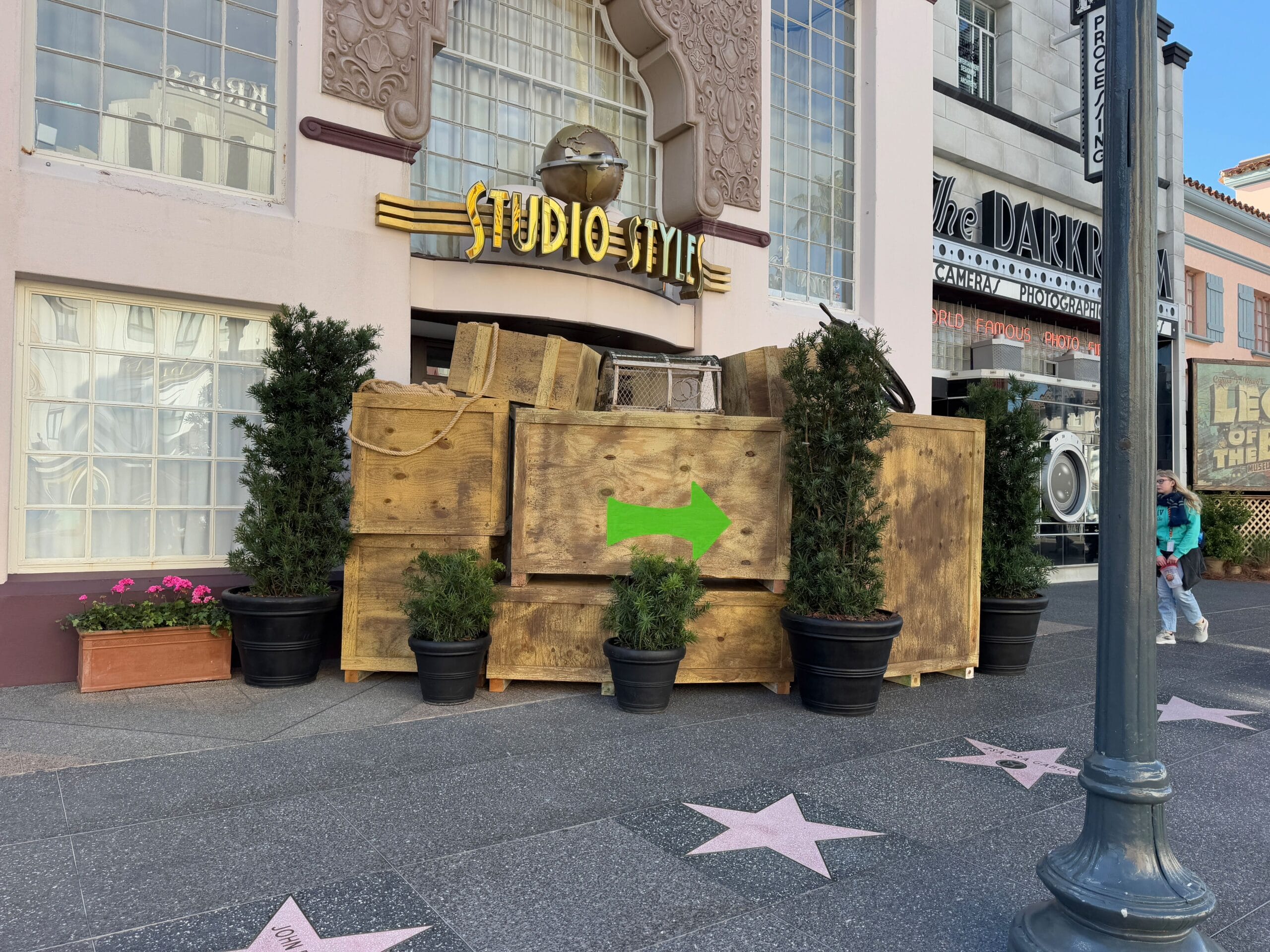Outside of Studio Style are various planters of different shapes and sizes. Behind those are stacked shipping crate boxes. The top, middle crate has a green arrow pointing guests down the streets of Hollywood toward a new marquee and entrance at Williams of Hollywood. The crates are similar those present last year in the same location.