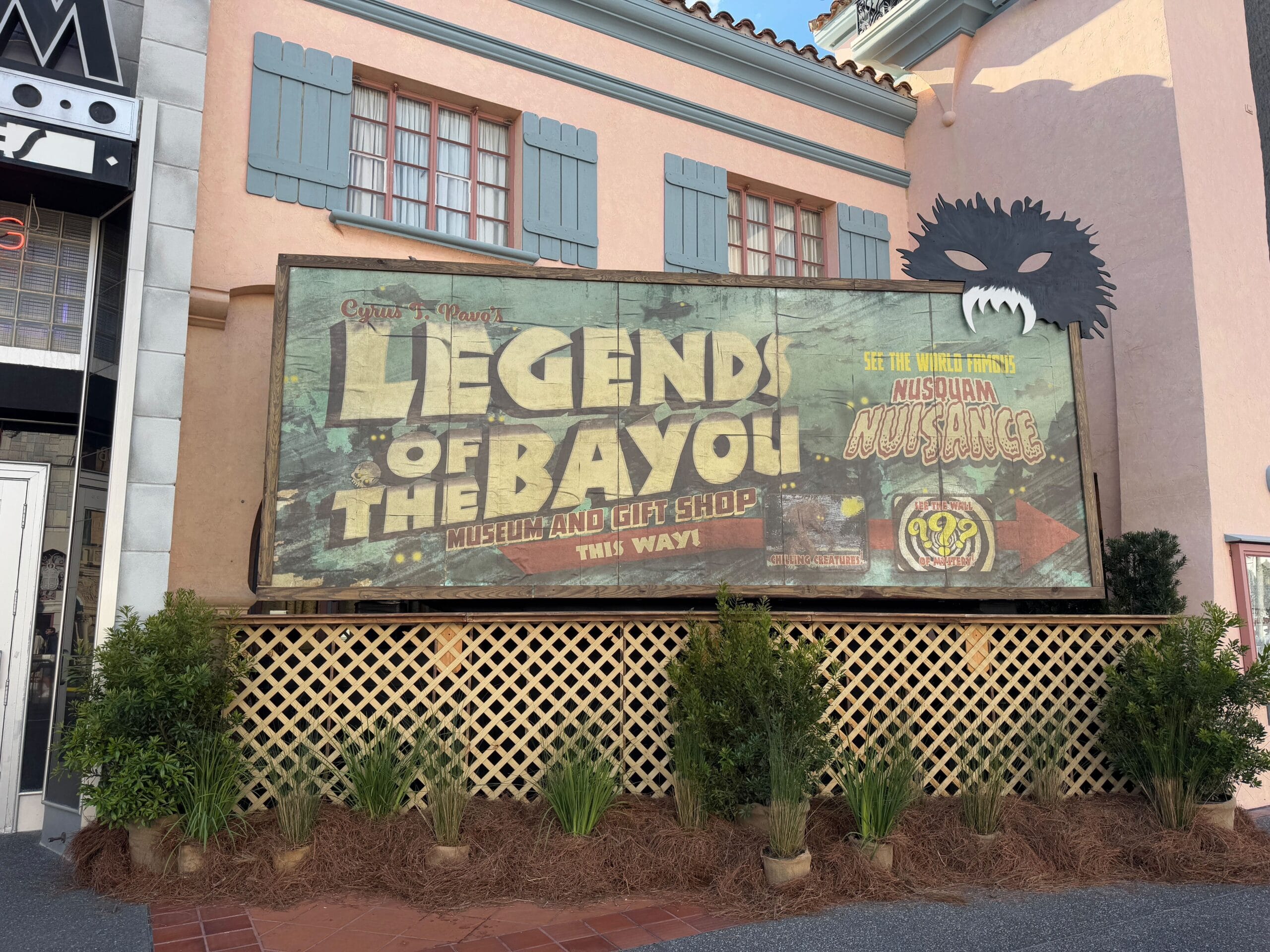 The new marquee is faded and worn with shades of yellow, green, and red. It reads “Cyrus T. Pavo’s Legends of the Bayou, Museum and Gift Shop This Way.” In a smaller graphic, it reads “See the World Famous Nusquam Nuisance” and “Chilling Creatures” along with a red arrow and sign alerting quests to “See the Wall of Mystery!” This arrow points directly to the entrance of Williams of Hollywood.