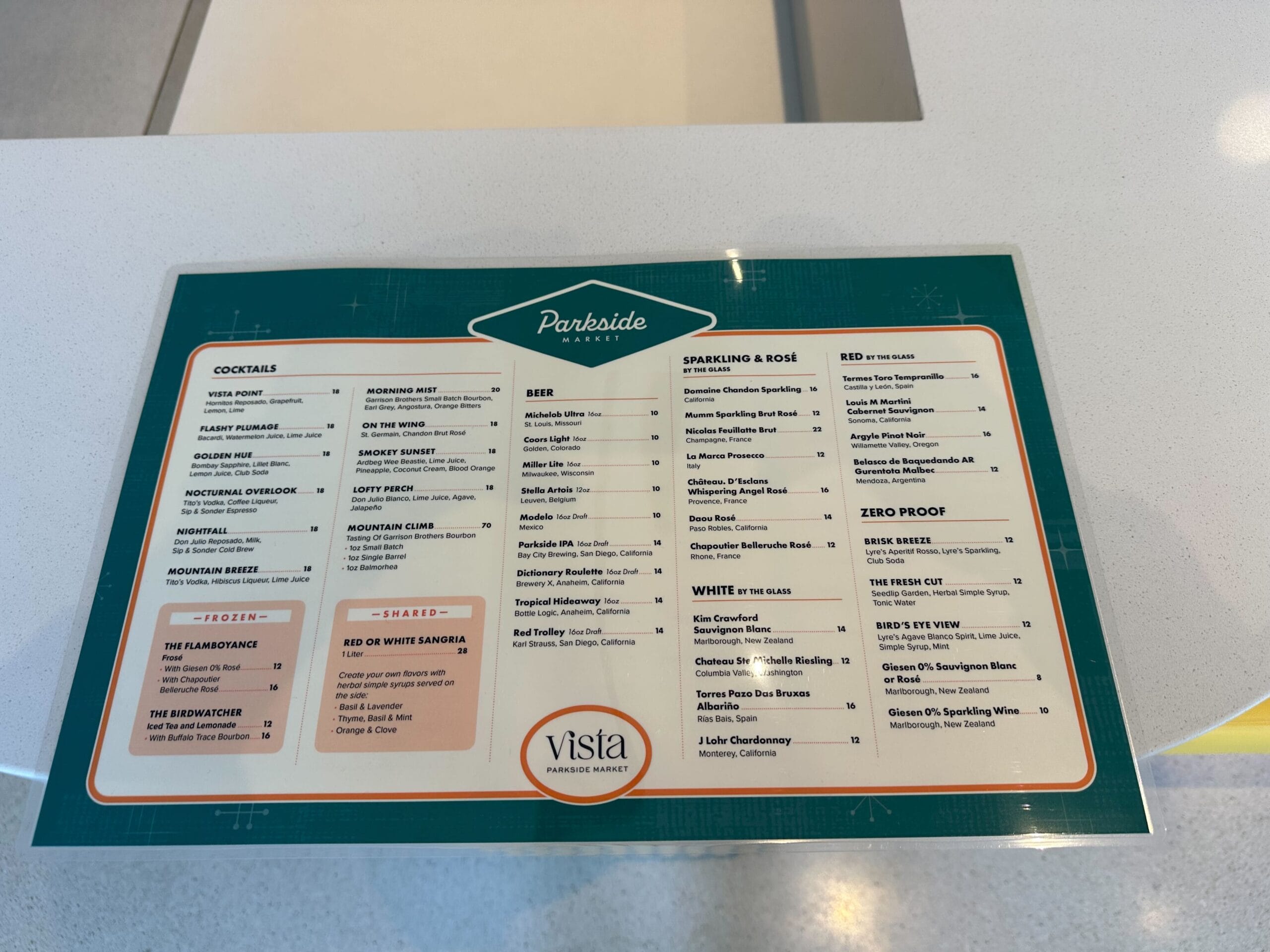 The menu on the countertop at Parlor Bar in Vista Paradise Resort features a delightful range of cocktails, beer, sparkling drinks, and non-alcoholic options—perfect for pairing with fresh selections from nearby Parkside Market.