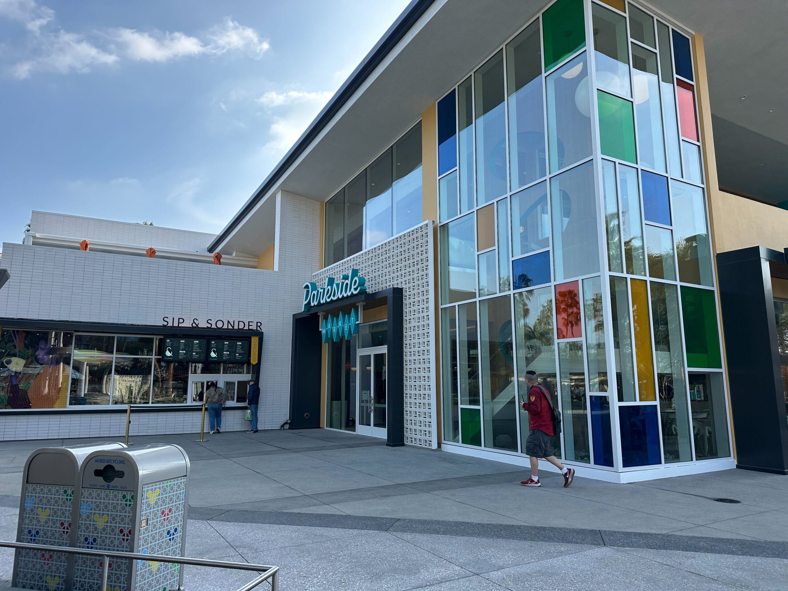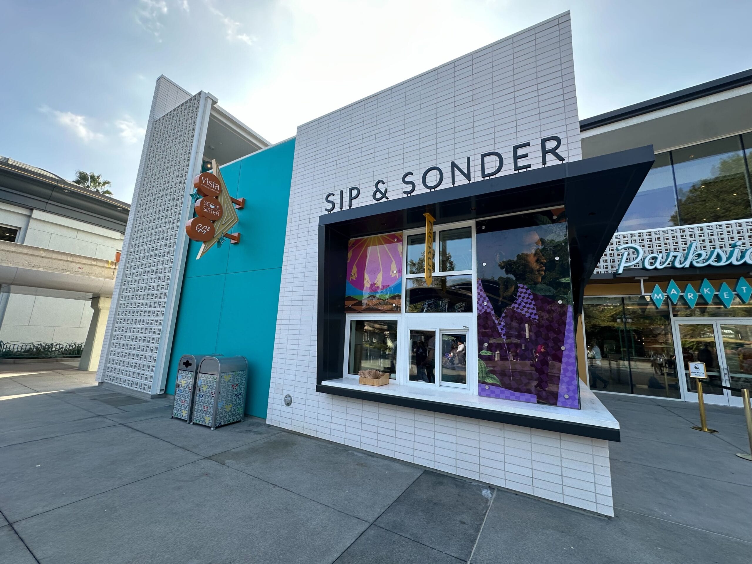 The image shows a white building with "Sip & Sonder" written on it, reminiscent of an inviting spot you might find in Disney Springs. There are two trash bins outside, a decorative window display, and signage for a waffle location nearby, adding to the charm like that of Parkside Market.