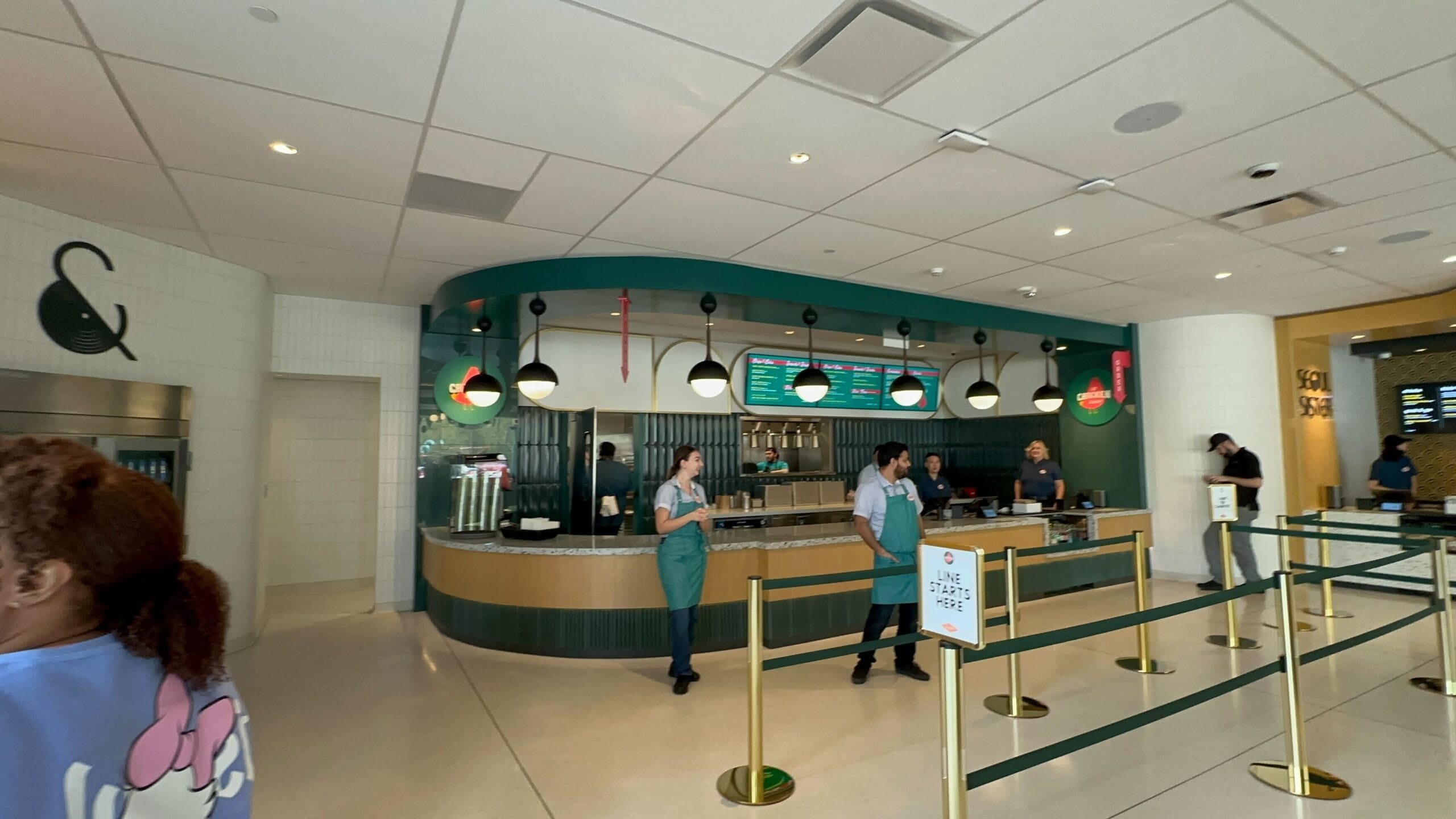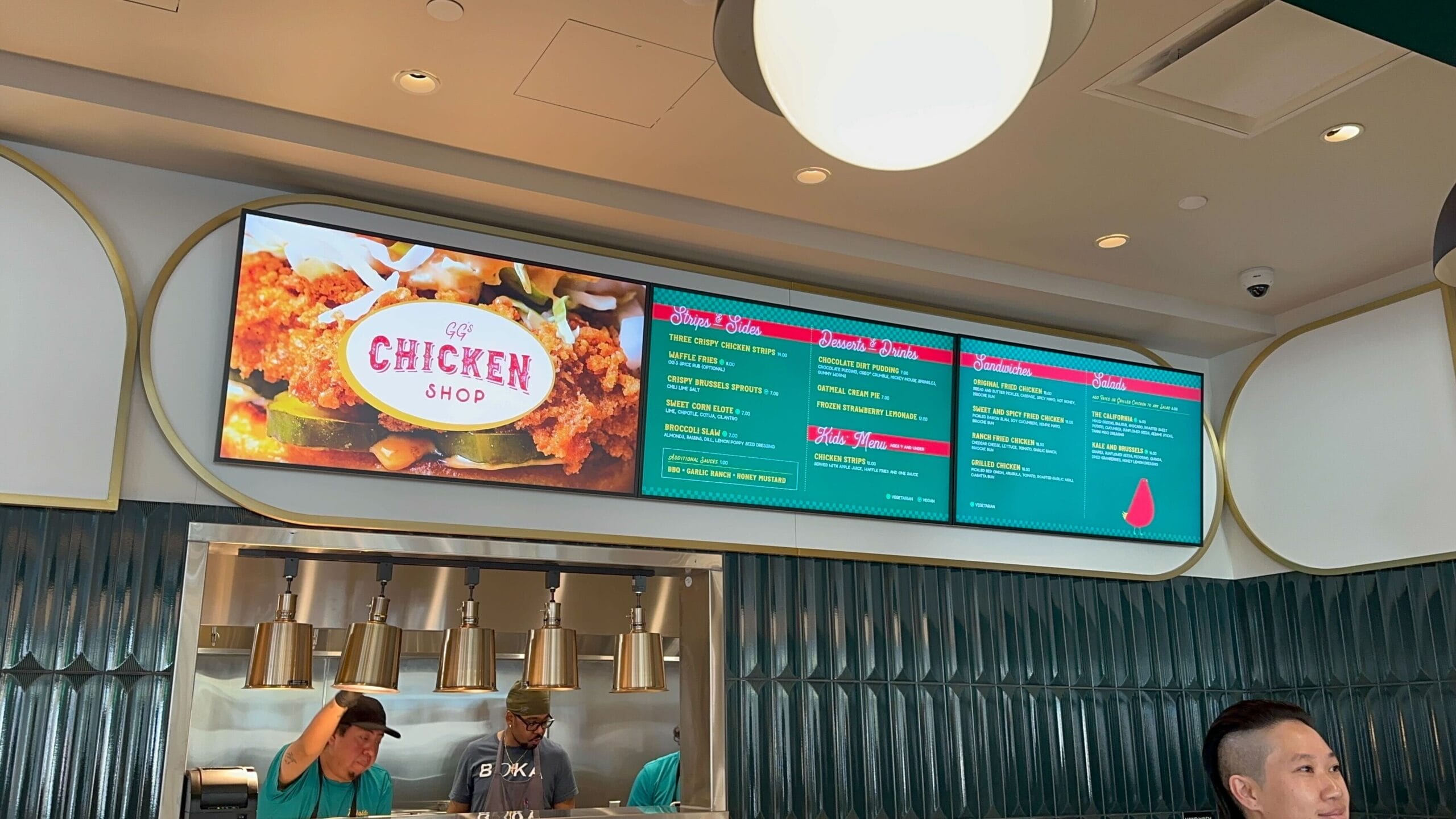 To the left of the Seoul Sister ordering area is the section for GG’S Chicken Shop. Both the walls and ceiling are covered in emerald green. The Cast Members taking orders are wearing matching green aprons.