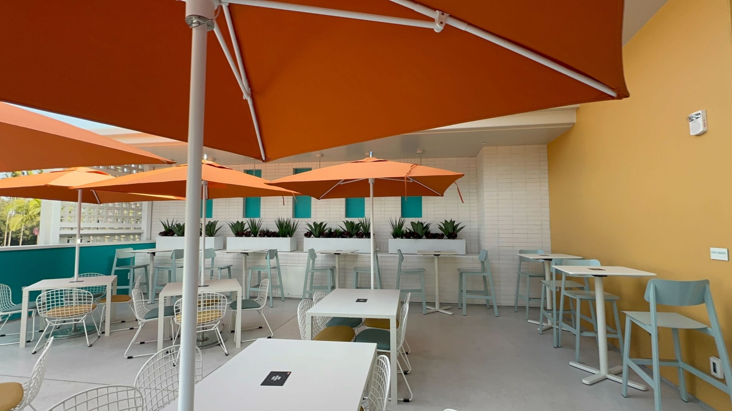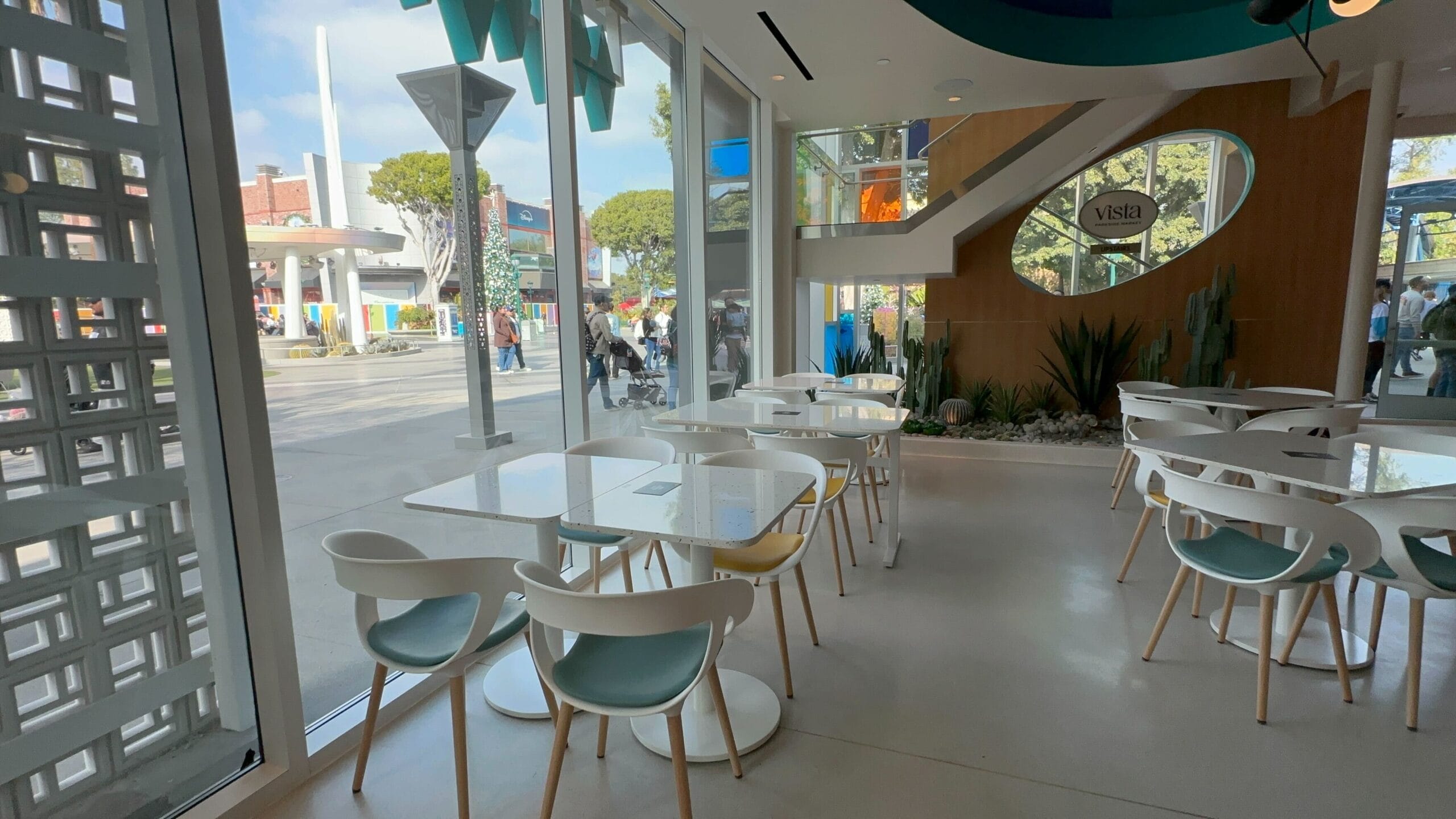 Additional tables run along the windows with teal and yellow seat cushions. Each table has a designated black square in the center for placing table trackers. Some cacti are planted in the rock garden below the stairs.