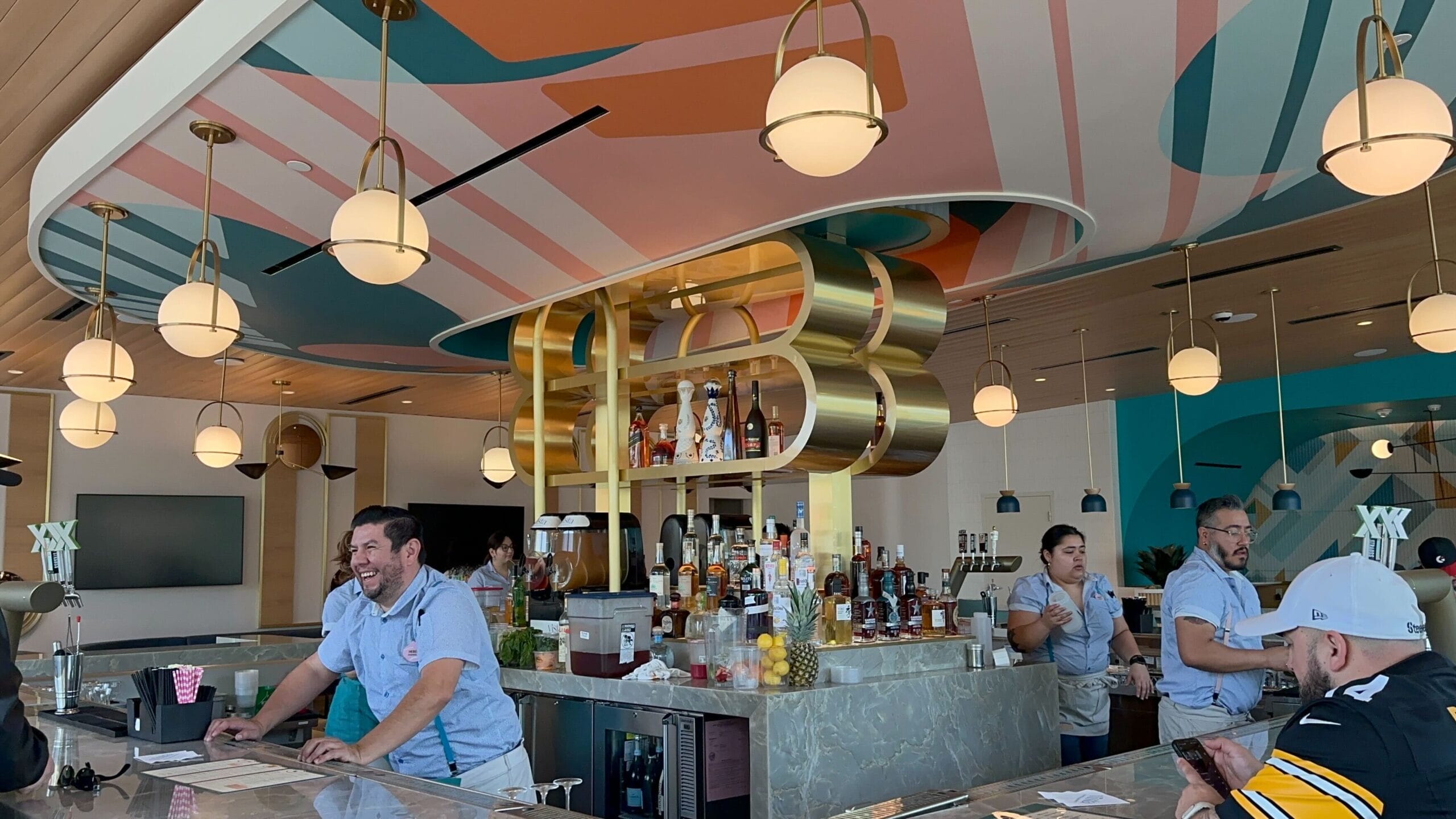 The bar has a brightly-painted ceiling mural in shades of teal, pink, white, and yellow. Sphere hanging lights surround the bar on all sides. The bar is a square and can be accessed on all four sides.