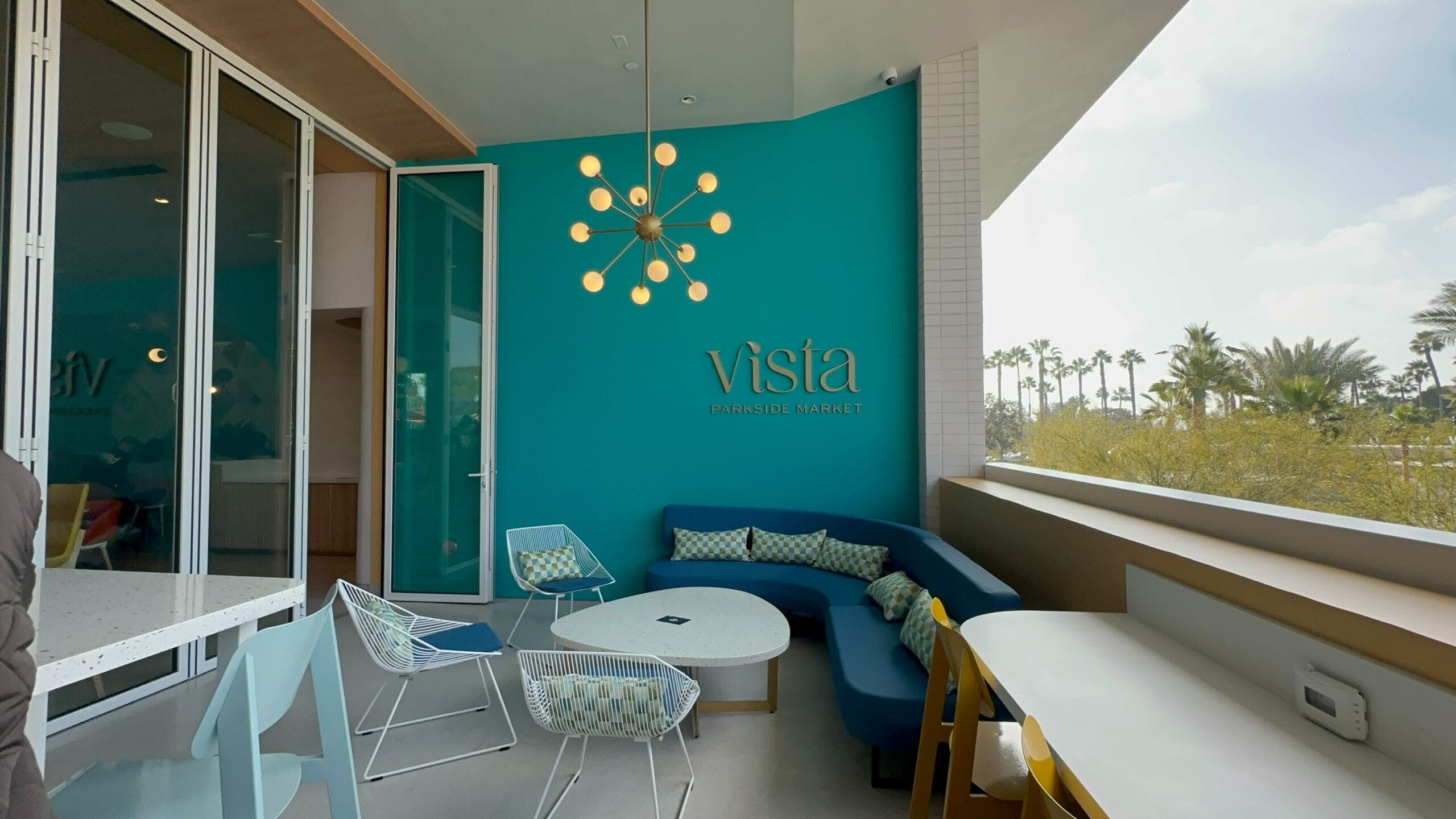 The final of the four concepts, Vista Parkside Market, is located on the second floor of the building. Stairs with a round Vista sign run against the colored exterior window.