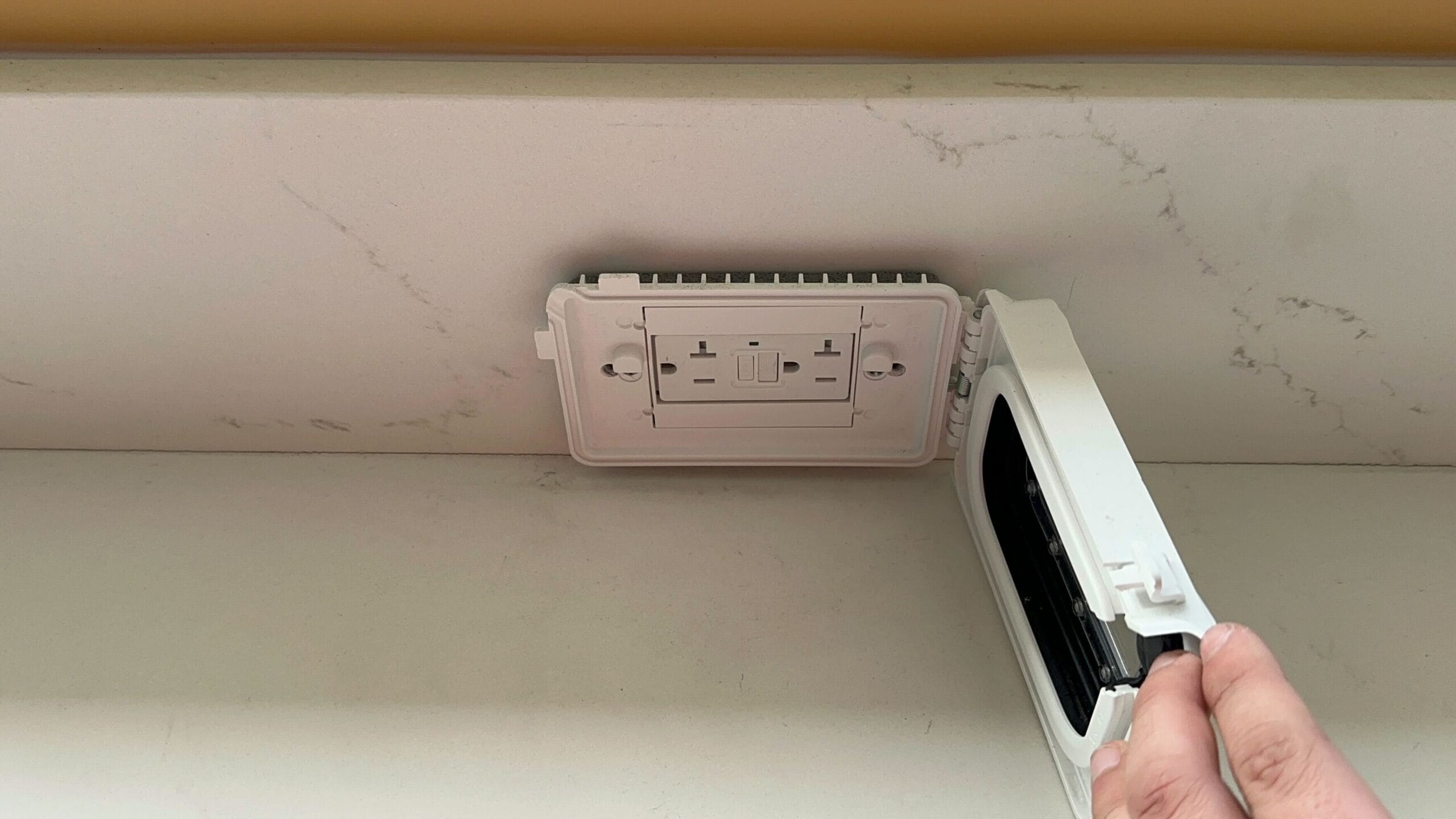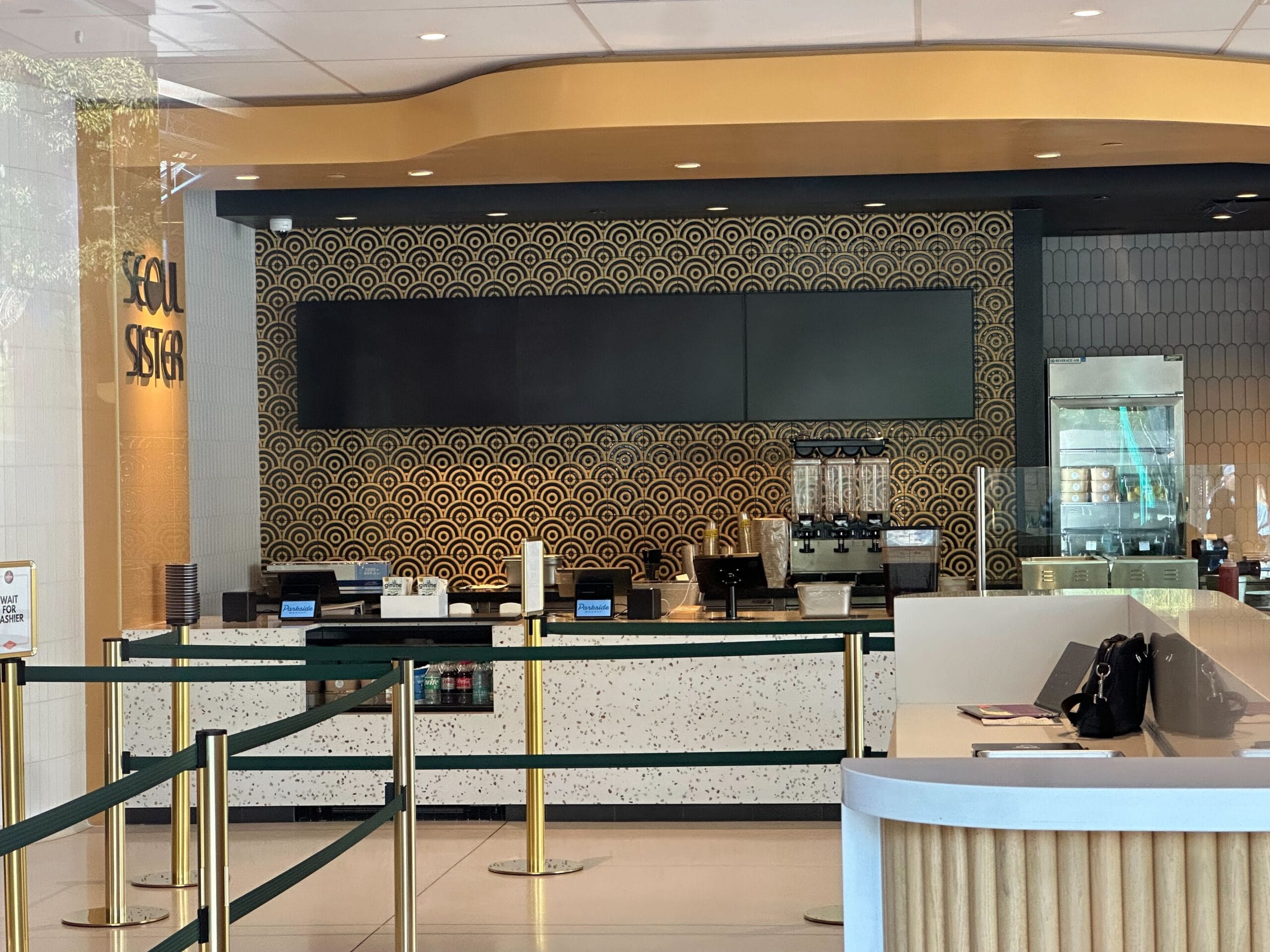A modern cafe counter at Disney Springs features a patterned wall, empty ordering stations, and a section for customer separation with green and gold barriers. A black purse rests on the white counter, inviting you to explore the full tour of this vibrant locale.