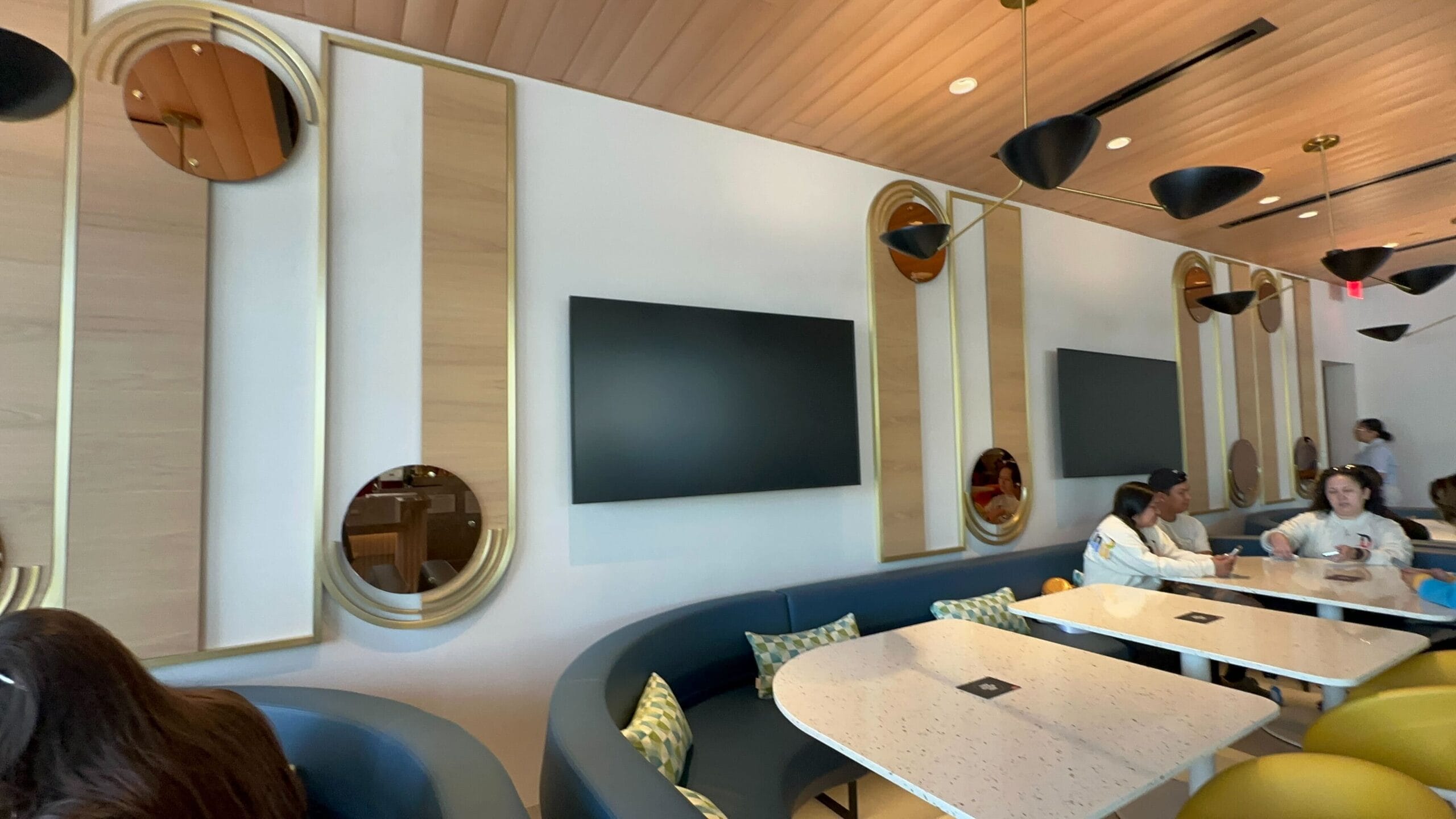 Some additional seating is found in the area around the bar, including curved booths underneath a wall of TVs and a circular table under a large teal archway.