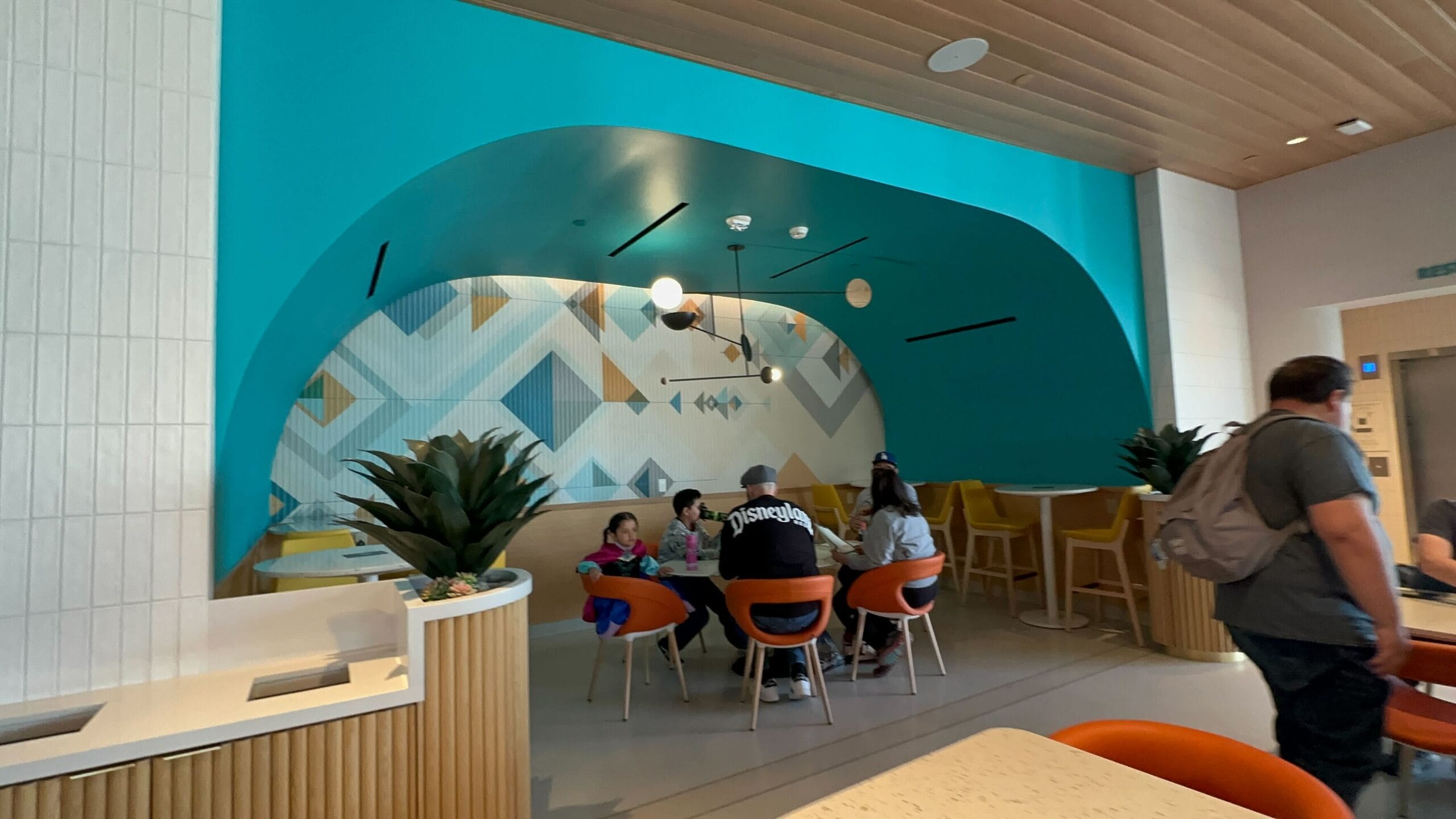 At Disney Springs' chic Parkside Market, people are seated at a modern bar with teal chairs, a wooden ceiling, and large windows. Hanging lights provide elegant illumination for those exploring the venue on their full tour.