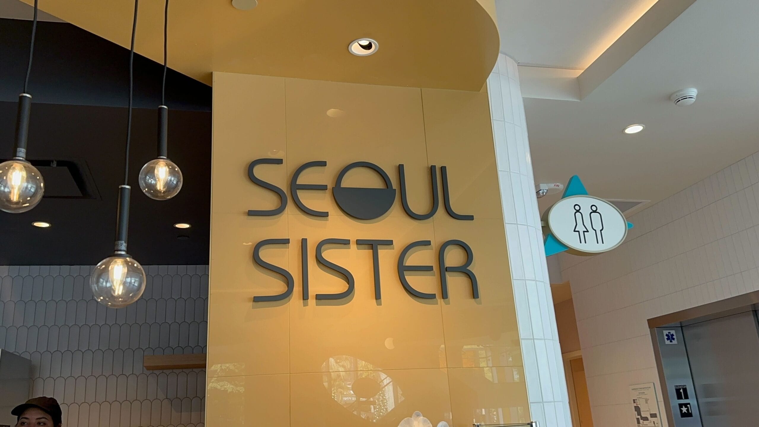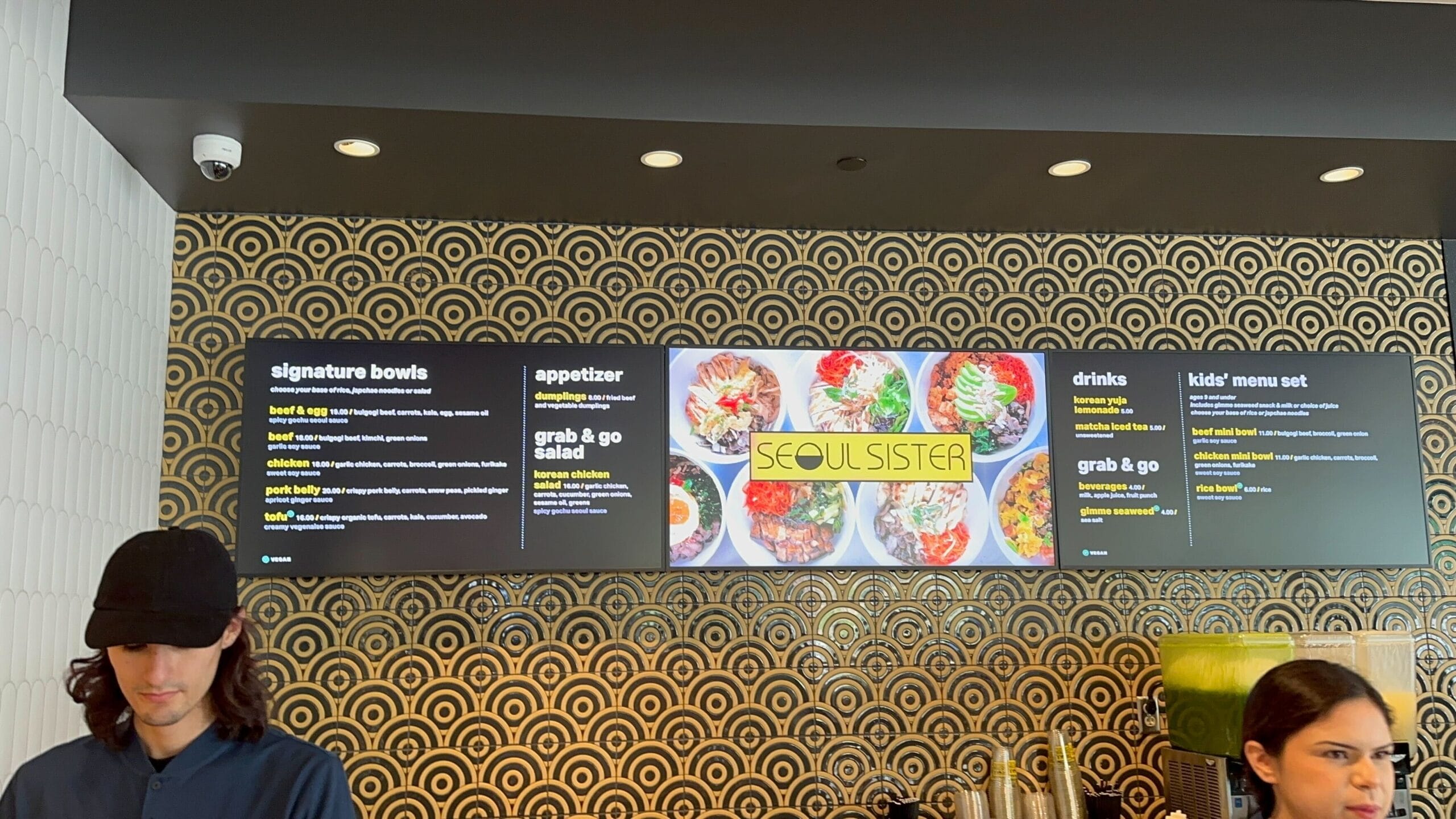 The Seoul Sister section specializes in customizeable bowls. The back wall has yellow and black striped tiles in a circular shape.