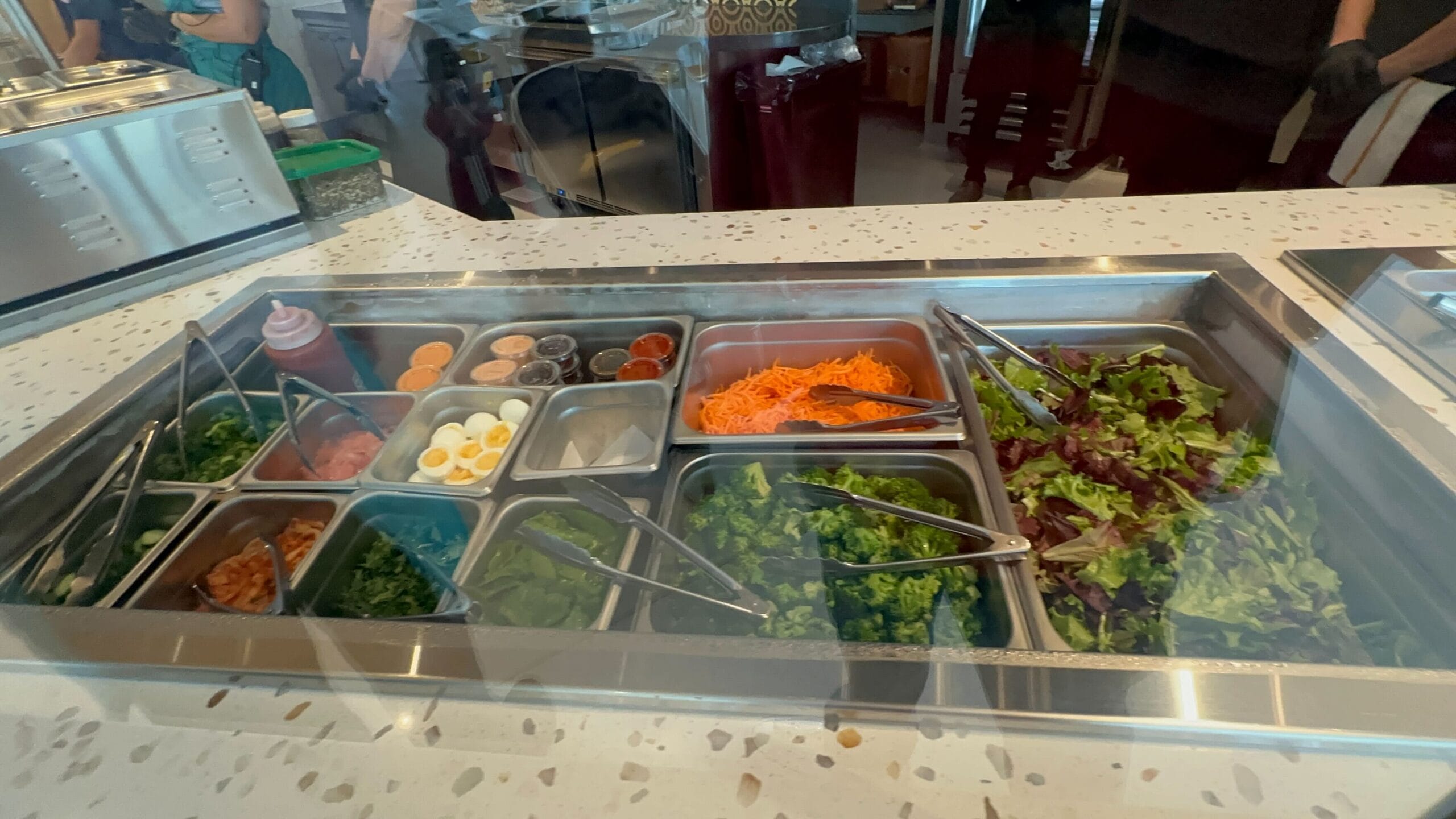 The kitchen’s logo is placed on both corner walls. Behind the serving glass, guests can see some of the many options available to be placed in each bowl.