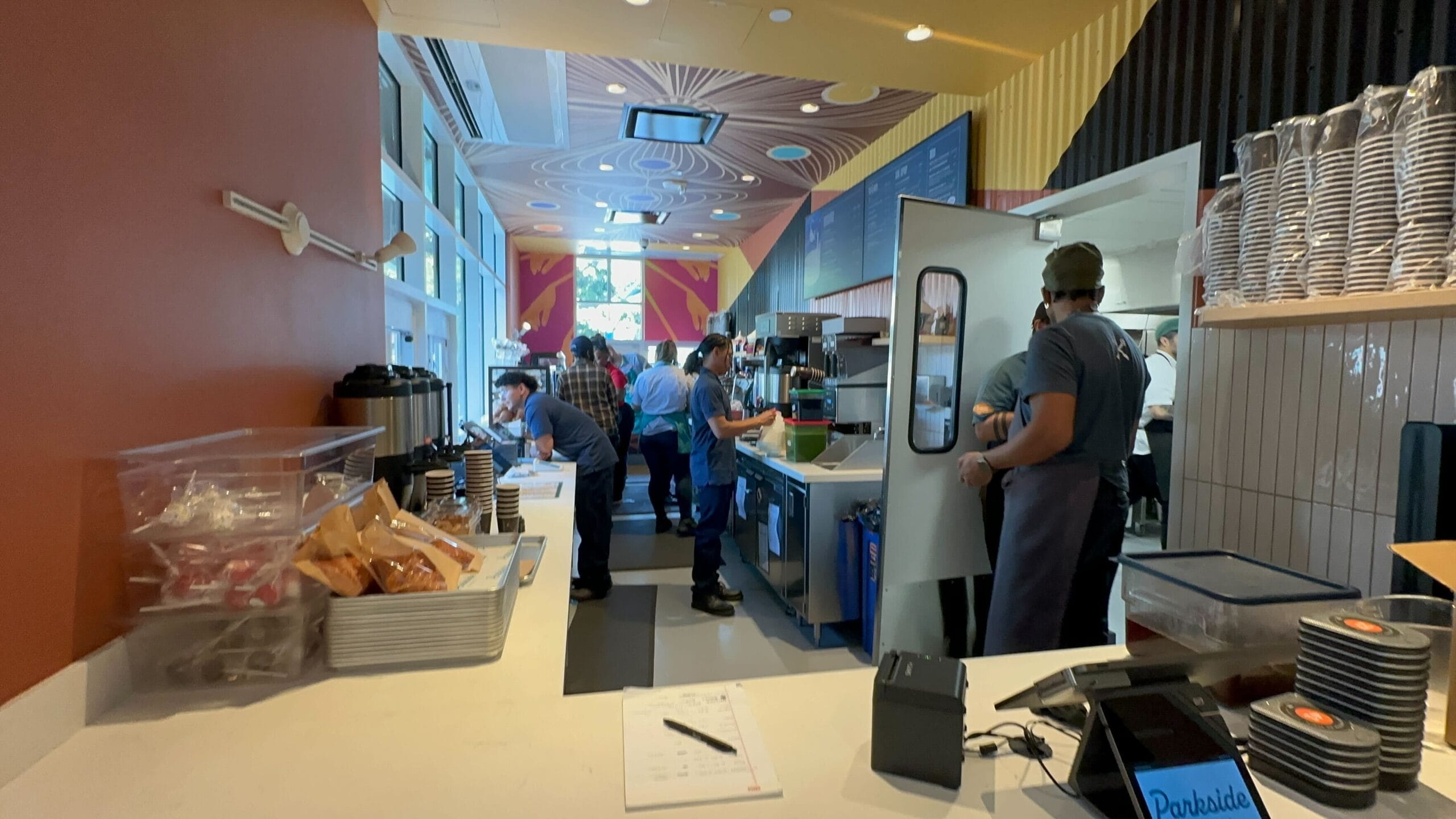 Inside the Parkside Market chicken shop, menu boards hang above the bustling counter where staff work efficiently. The lively atmosphere feels like a mini tour of culinary delights right in the heart of Disney Springs.