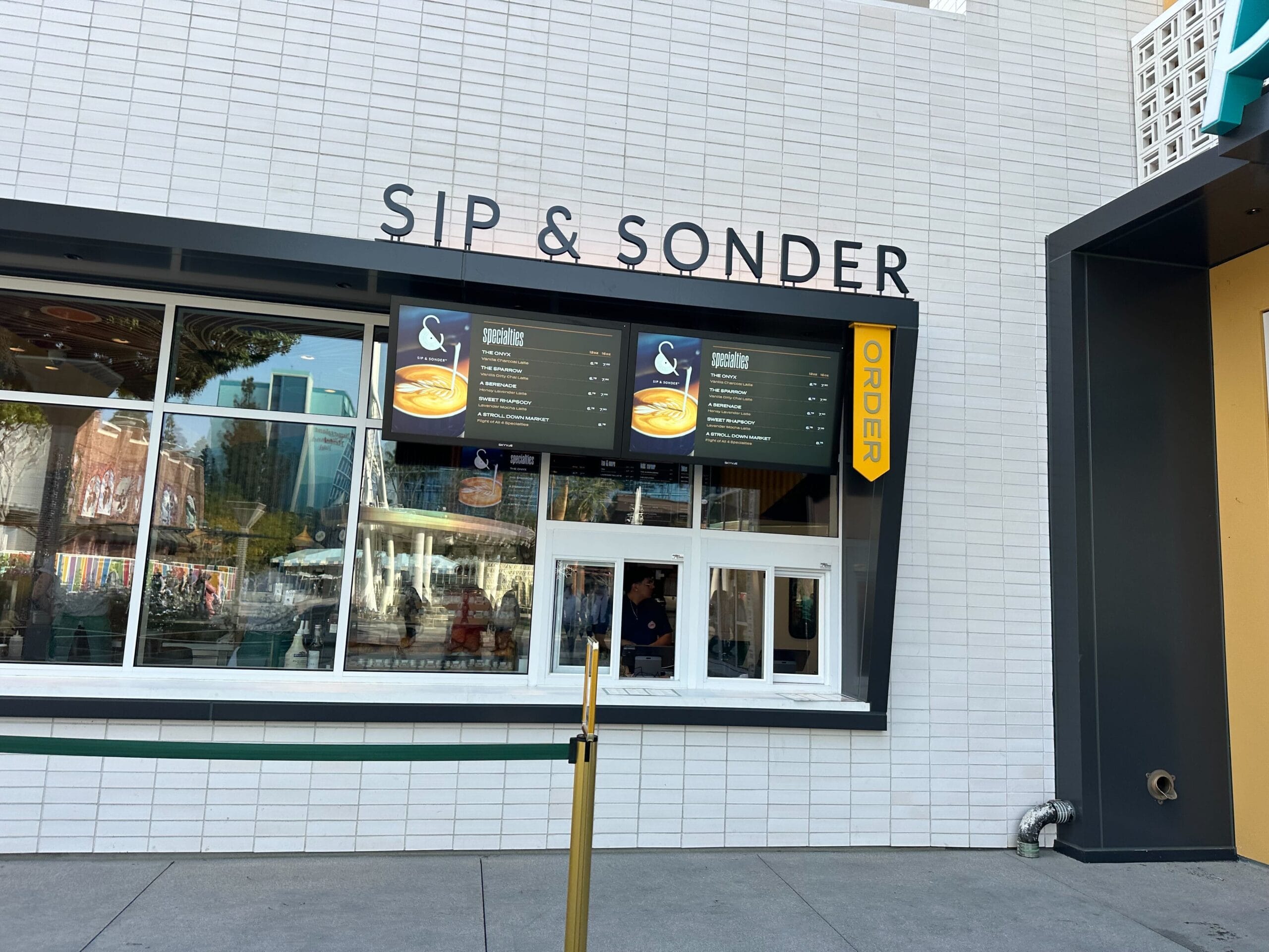 Outside the main building, guests can visit the Sip & Sonder outdoor window. Guests enter and place their order on the right side, which has a bright yellow “Order” sign in the top right corner.