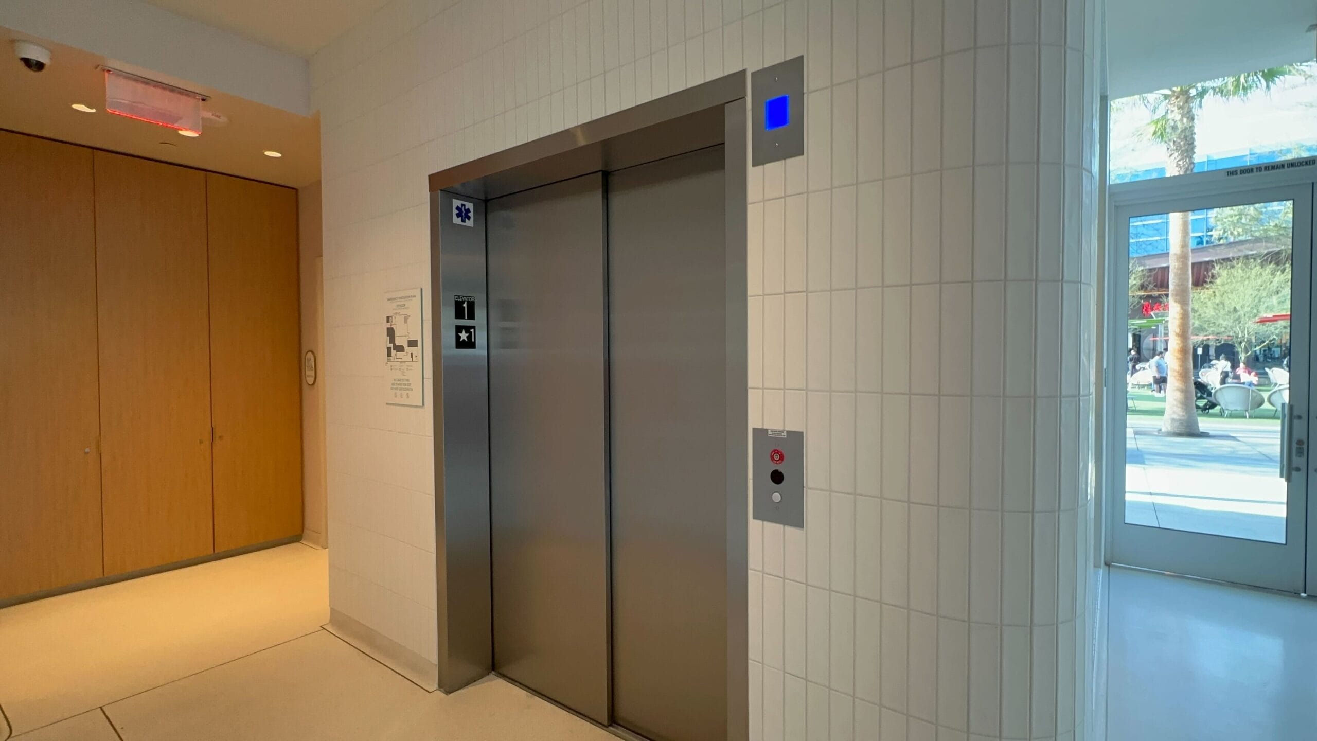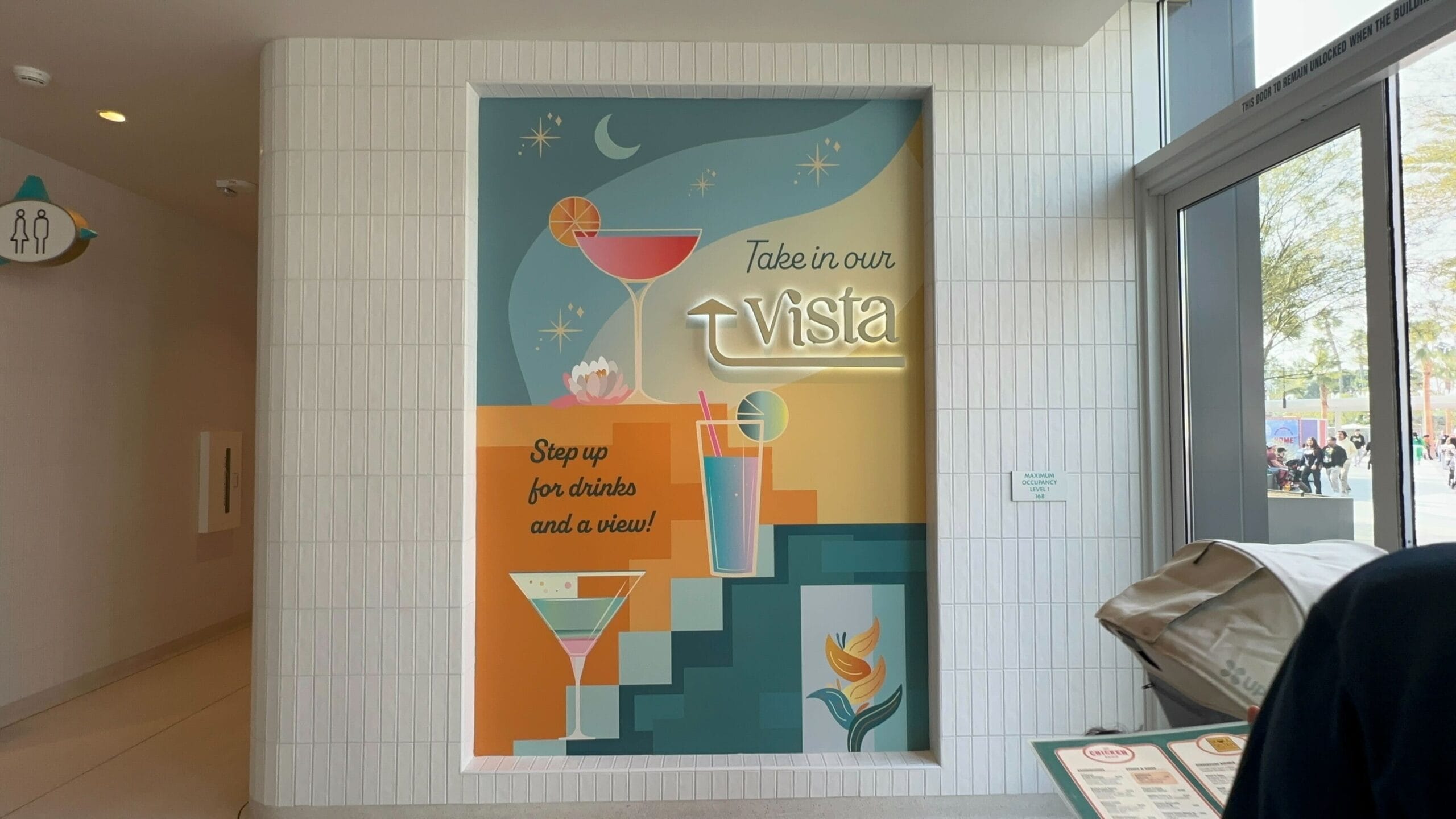 The building also has an elevator taking guests upstairs. A bright mural is on the nearby corner wall, showing retro-style drinks and pointing guests to “Take in our Vista” upstairs.