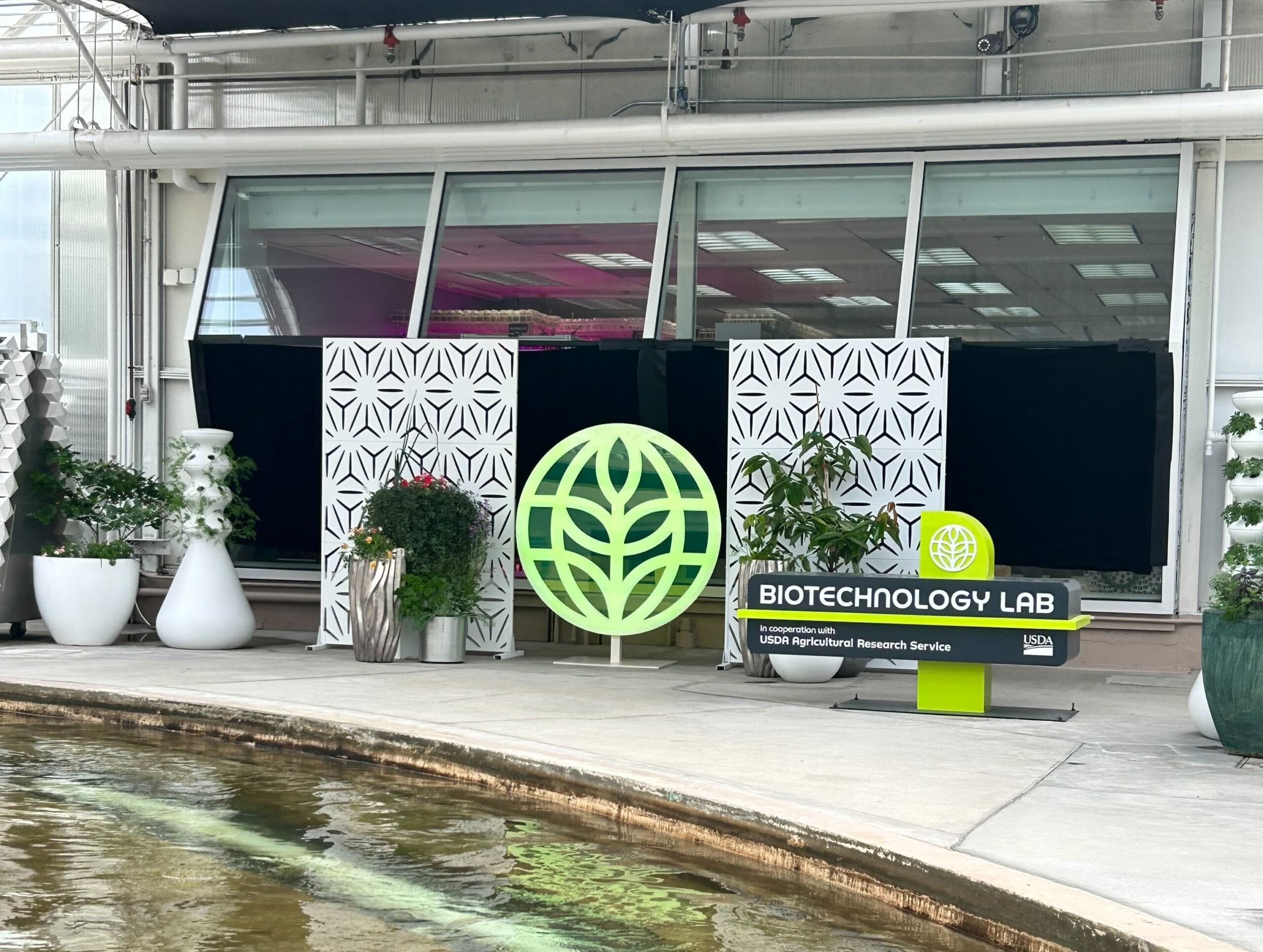 The entrance to the Biotechnology Lab, reminiscent of EPCOT’s Living with the Land, features a large green leaf logo, decorative panels, lush plants, and a USDA Agricultural Research Service sign.