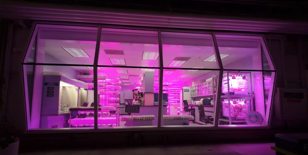 A Biotechnology Lab with large windows, illuminated by bright pink lights, showcases shelves, tables, and equipment inside. It captures the innovative essence of EPCOT’s vision for Living with the Land.