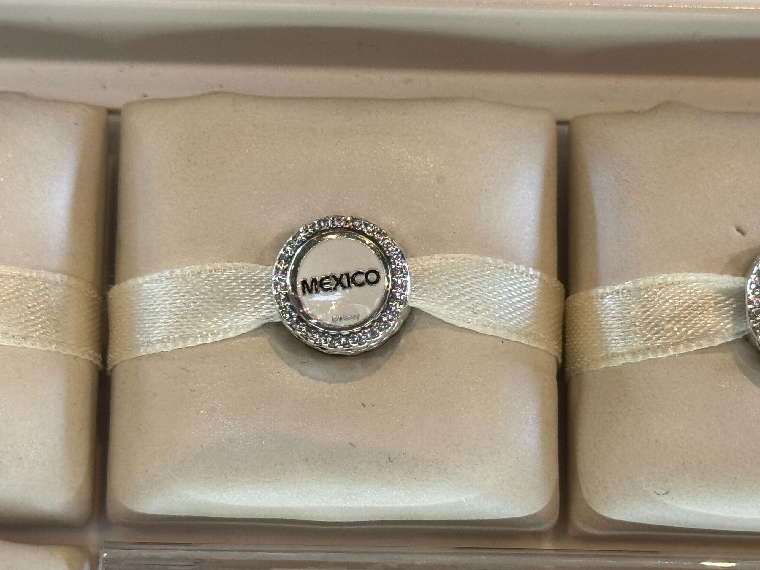 The charms are all silver circular sliders. Mickey is pictured on one side against a blue background. On the Mexico charm, he wears a black and gold mariachi uniform, including a sombrero. The other side is white with “Mexico” in black letters.