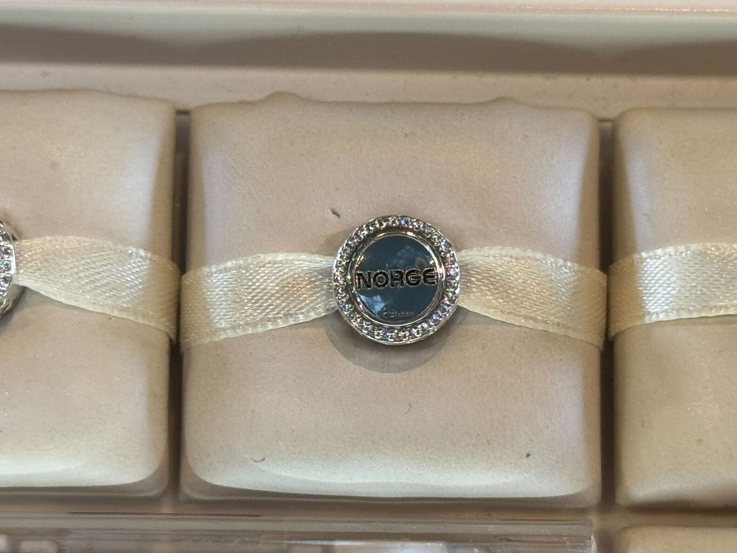 Mickey is dressed like a Viking on the Norway charm, with a horned helmet, fur cape, and brown shirt. The other side is blue with “Norge,” the Norwegian name for Norway, in black letters with white borders.