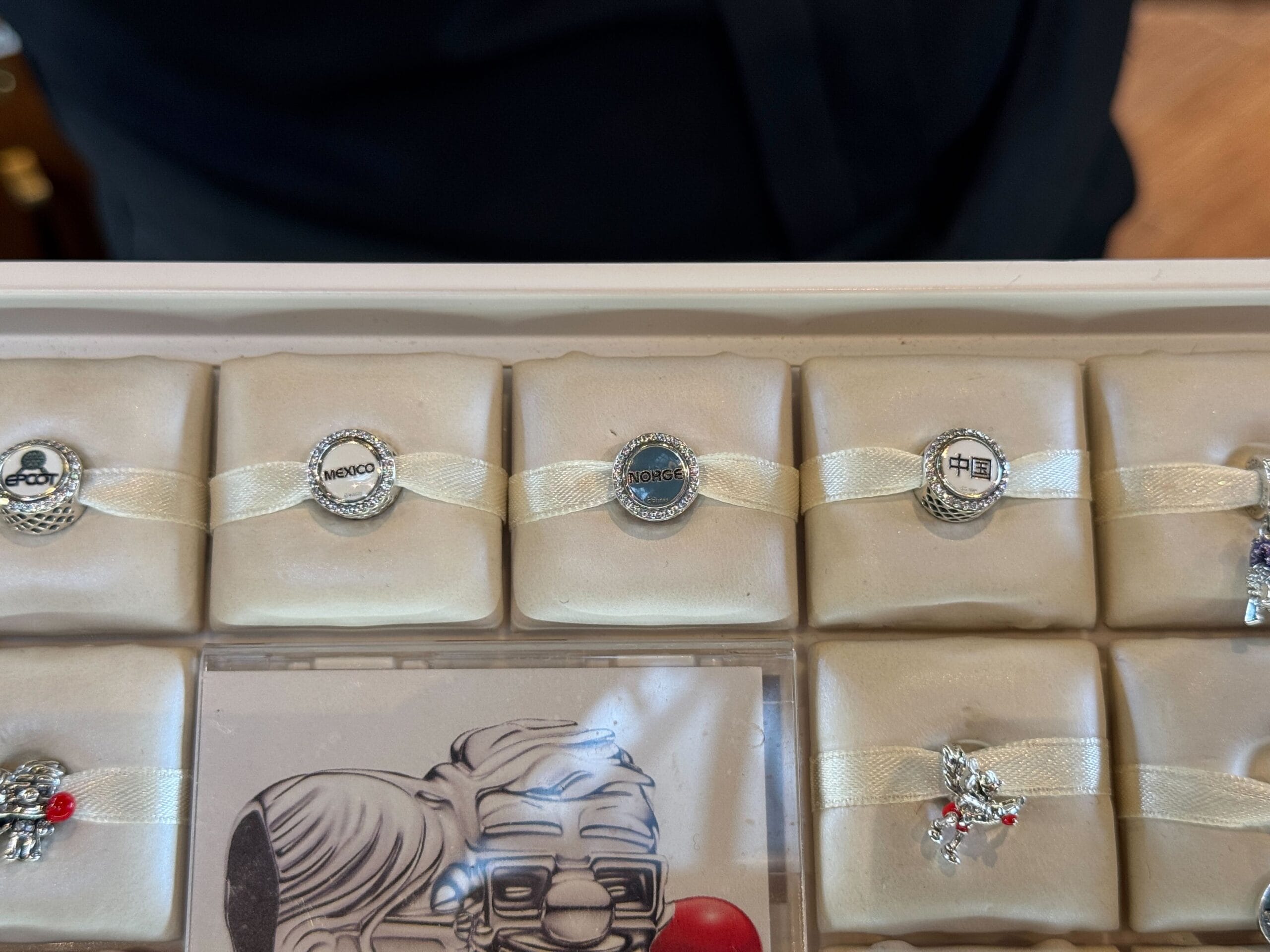 Each charm comes in a blue box featuring artwork of World Showcase.