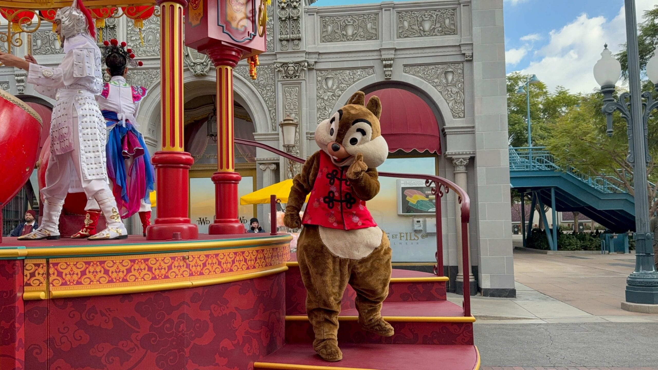 Chip and Dale follow behind the Mulan float. Chip stands on the stairs behind the drummers, while Dale walks behind the float holding a lantern. Chip and Dale swap positions after every performance of the processional, so Dale will have his time on the float too.