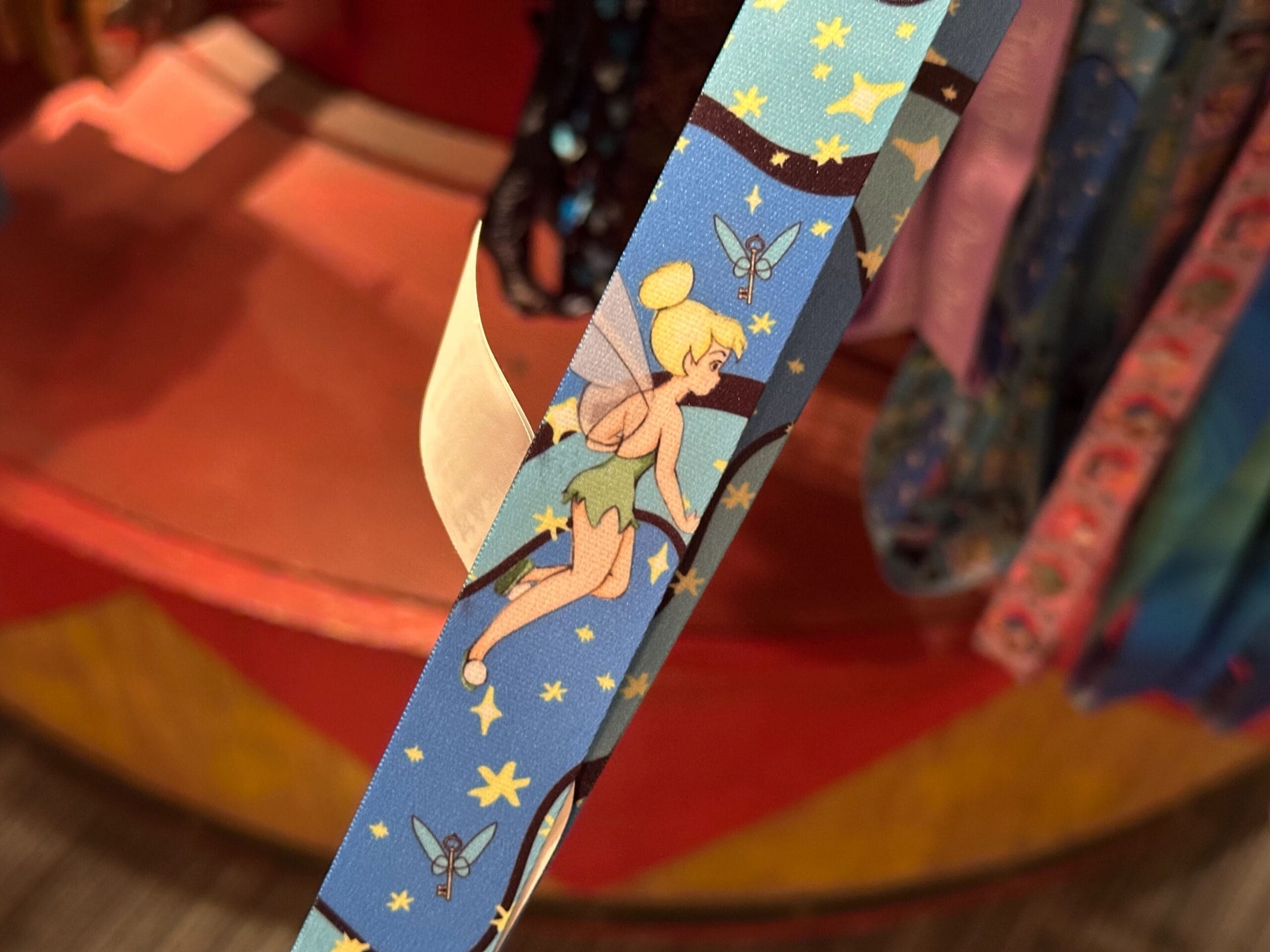 Like the Mickey and Minnie lanyards, this new design with Tinker Bell has a reversible design. One side is light blue with icons related to Tinker Bell in yellow, blue, and green squares. Some of the icons include Tinker Bell’s green dress, a keyhole, and Big Ben. The reverse side shows Tinker Bell flying between a sky of stars and winged keys.