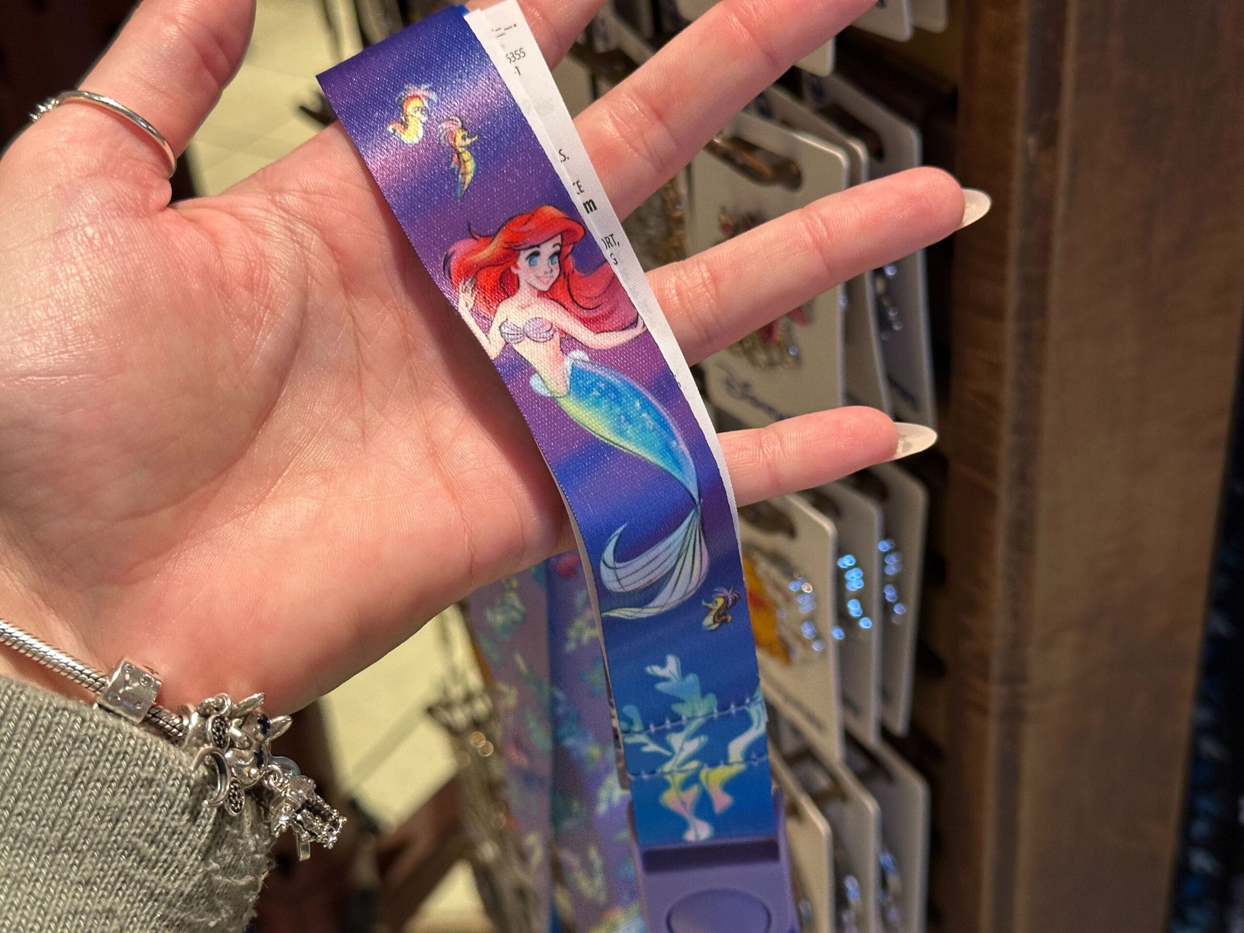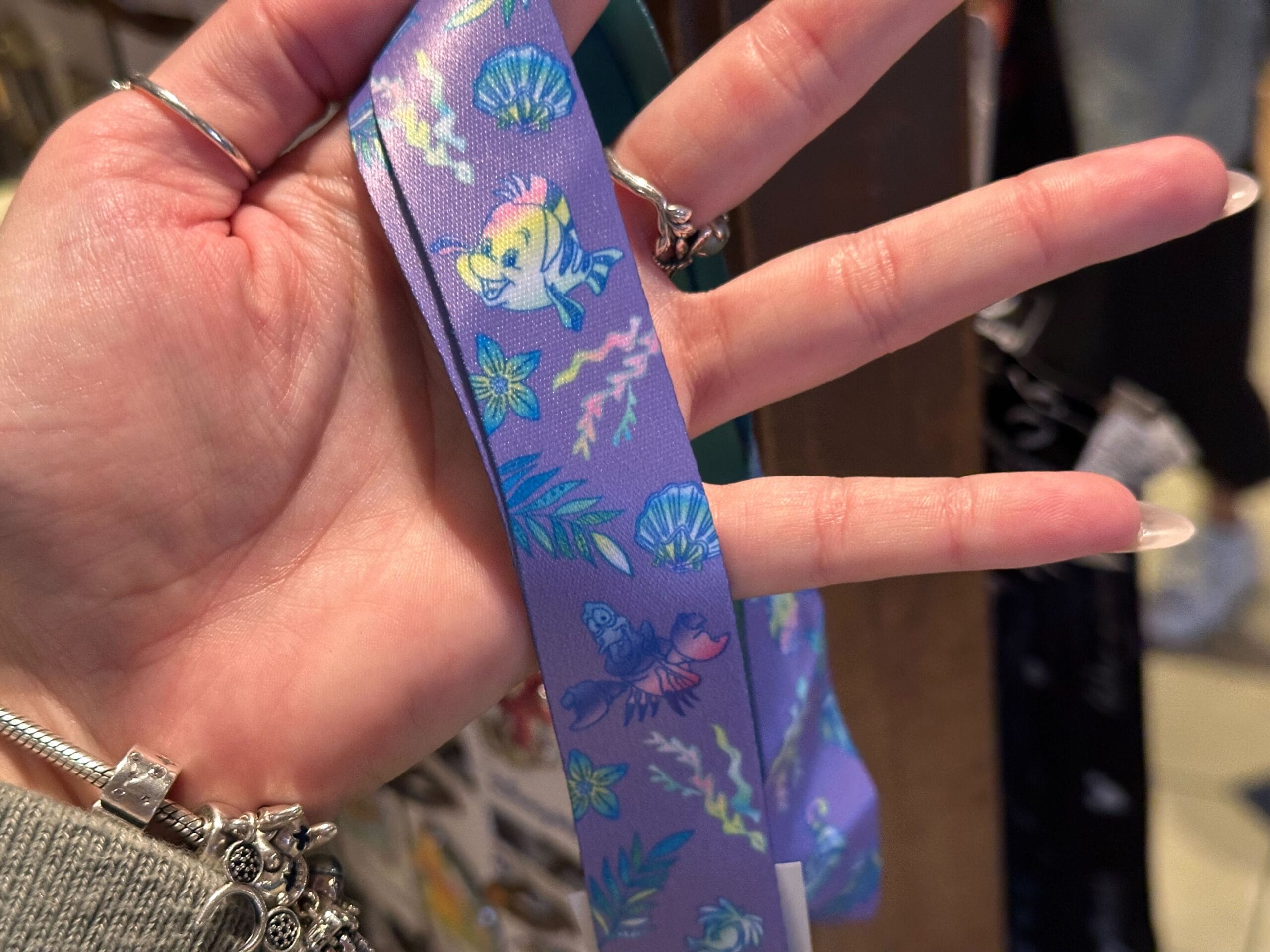 In addition to new pins, we also found some new lanyard designs for wearing them to the parks. This lanyard is blue and purple to resemble the ocean, with Ariel flipping her fins on one side. Flounder and Sebastian are also found between a scattering of shells and seaweed.