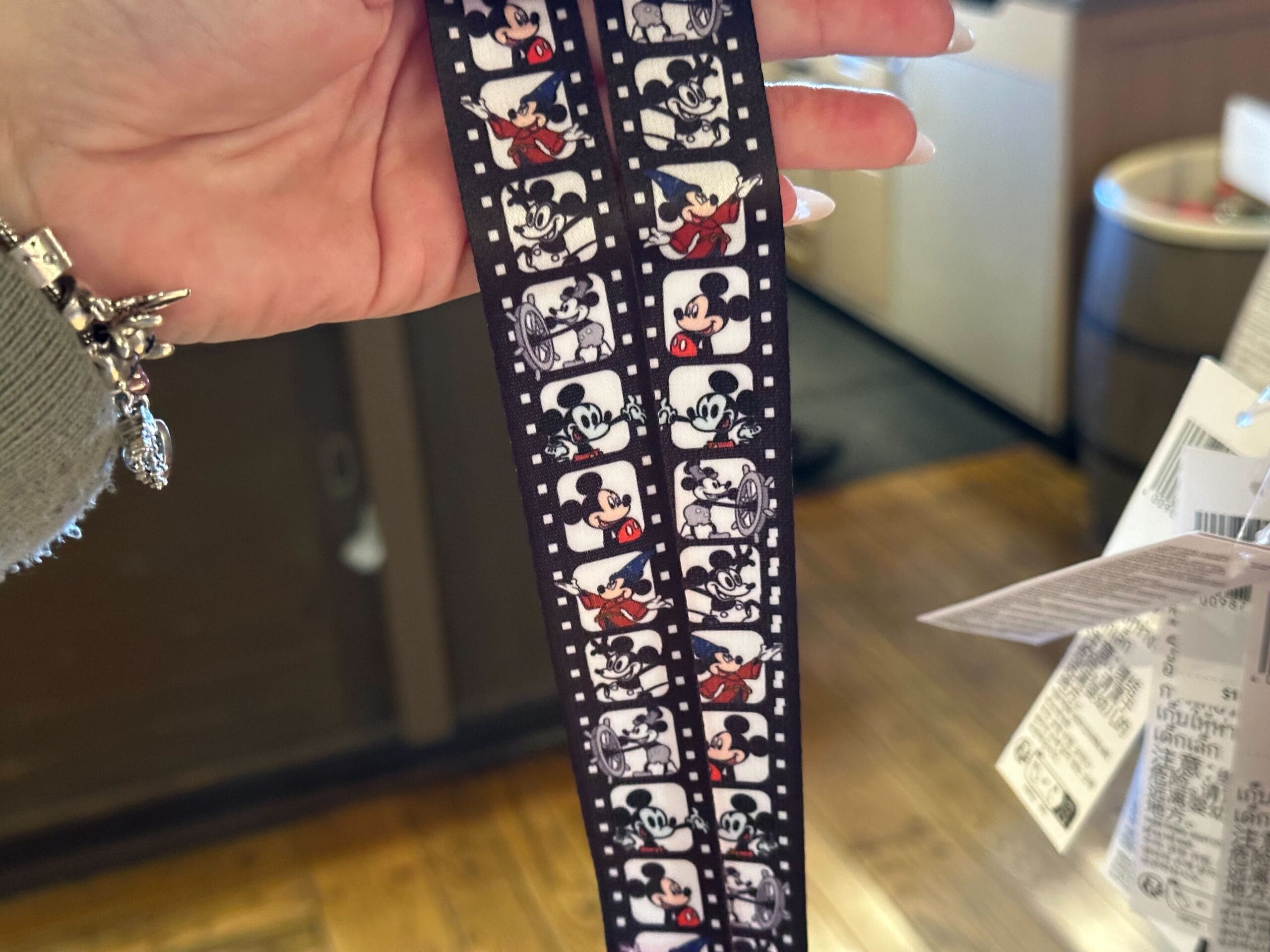Similar to the Minnie lanyard, this Mickey Mouse lanyard is also reversible. One side has a yellow band and star pattern showing Mickey near the clip. The flip side has a film reel like the Minnie lanyard, showing Mickey’s appearances in cartoons over the years.