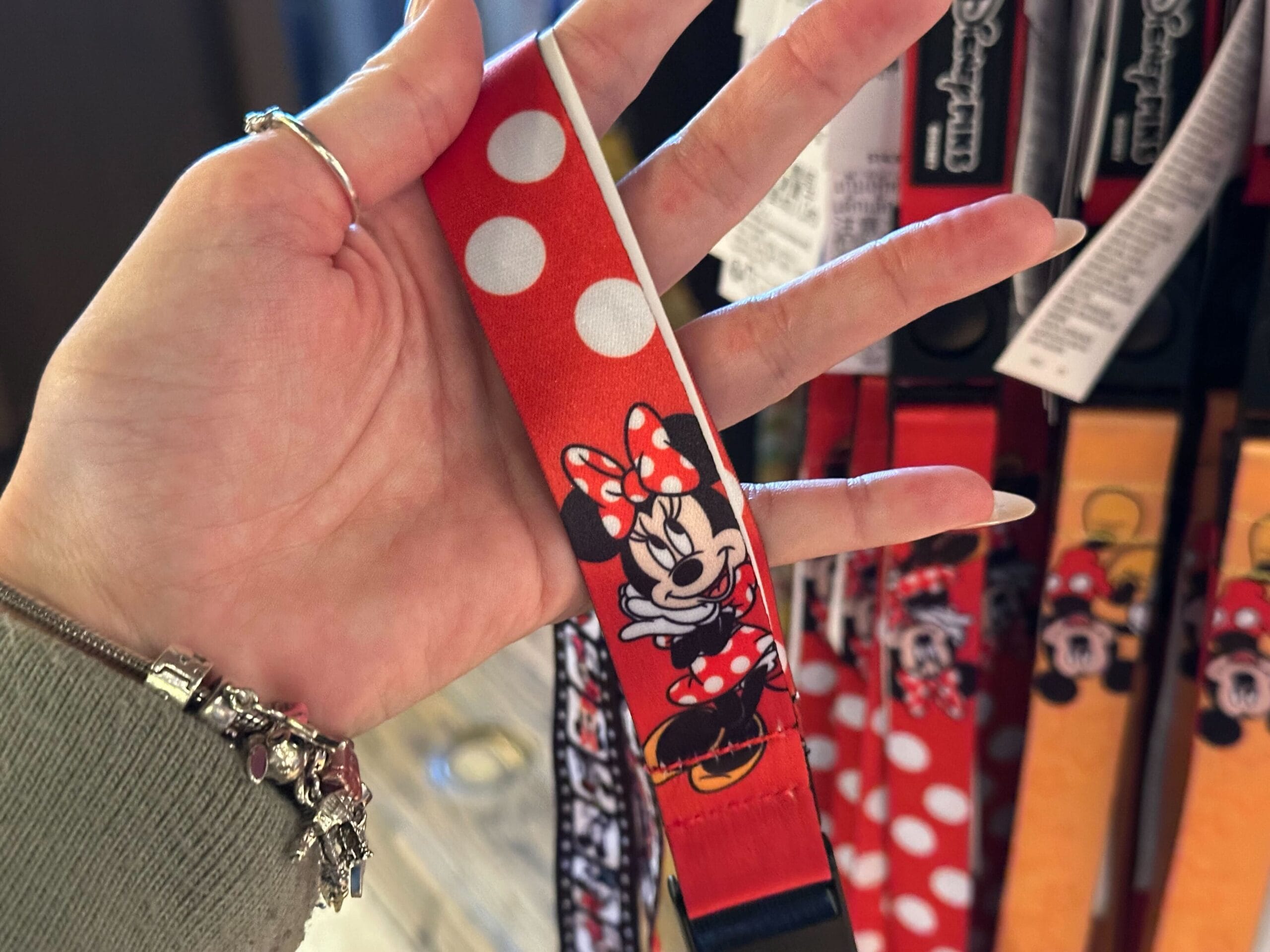 This Minnie Mouse lanyard is reversible, with a different pattern on each side. One side has a small picture of Minnie near the clip and a red band with white polka-dots. The opposite side has a film reel showing Minnie in her different cartoon appearances over the years, including her original black-and-white look all the way up to the modern shorts.