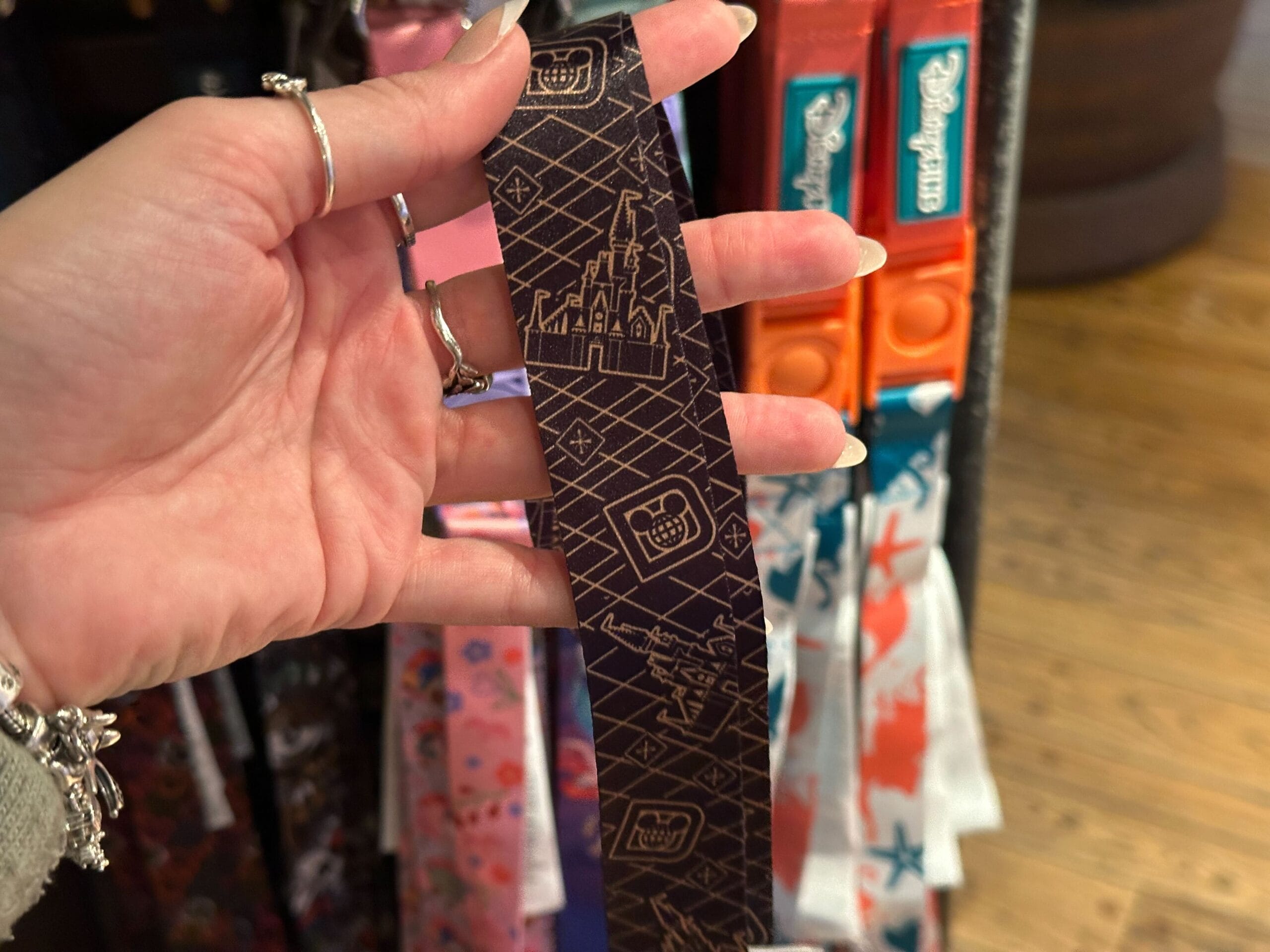 The next lanyard is the simplest and cheapest of these new designs. The main strap is black with gold pinstripes in a diamond pattern. The large “D” from the retro Walt Disney World wordmark is placed between outlines of Cinderella Castle, both also in gold.