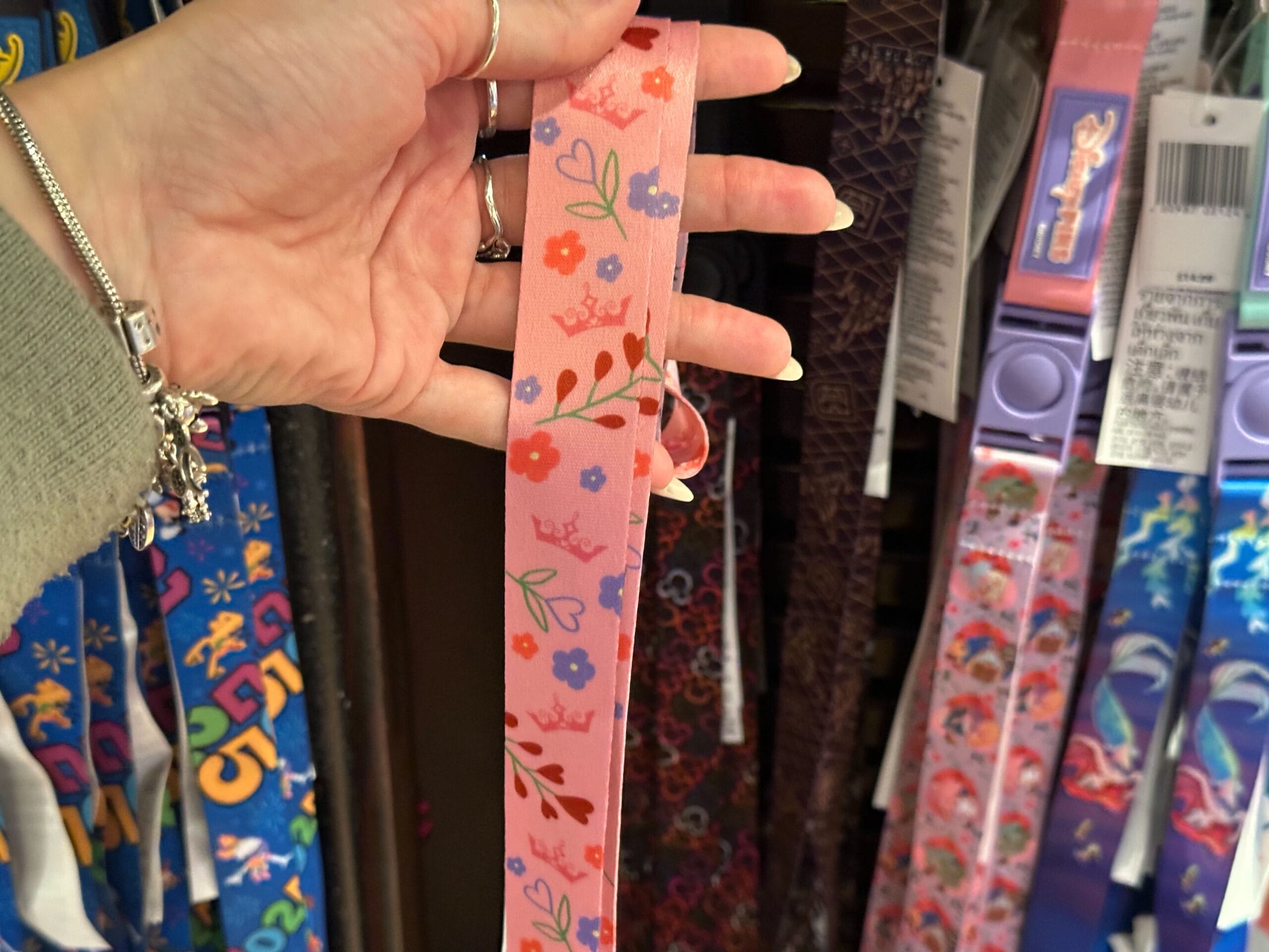 This new purple lanyard was likely added for Valentine’s Day 2025, as it features Disney royal couples standing together inside pink hearts. Some of the many couples shown include Belle and the Beast, Rapunzel and Flynn Rider, Tiana and Naveen, and Cinderella with Prince Charming. The opposite, pink side of the strap has a simpler design of heart-shaped red and purple flowers with princess tiaras.