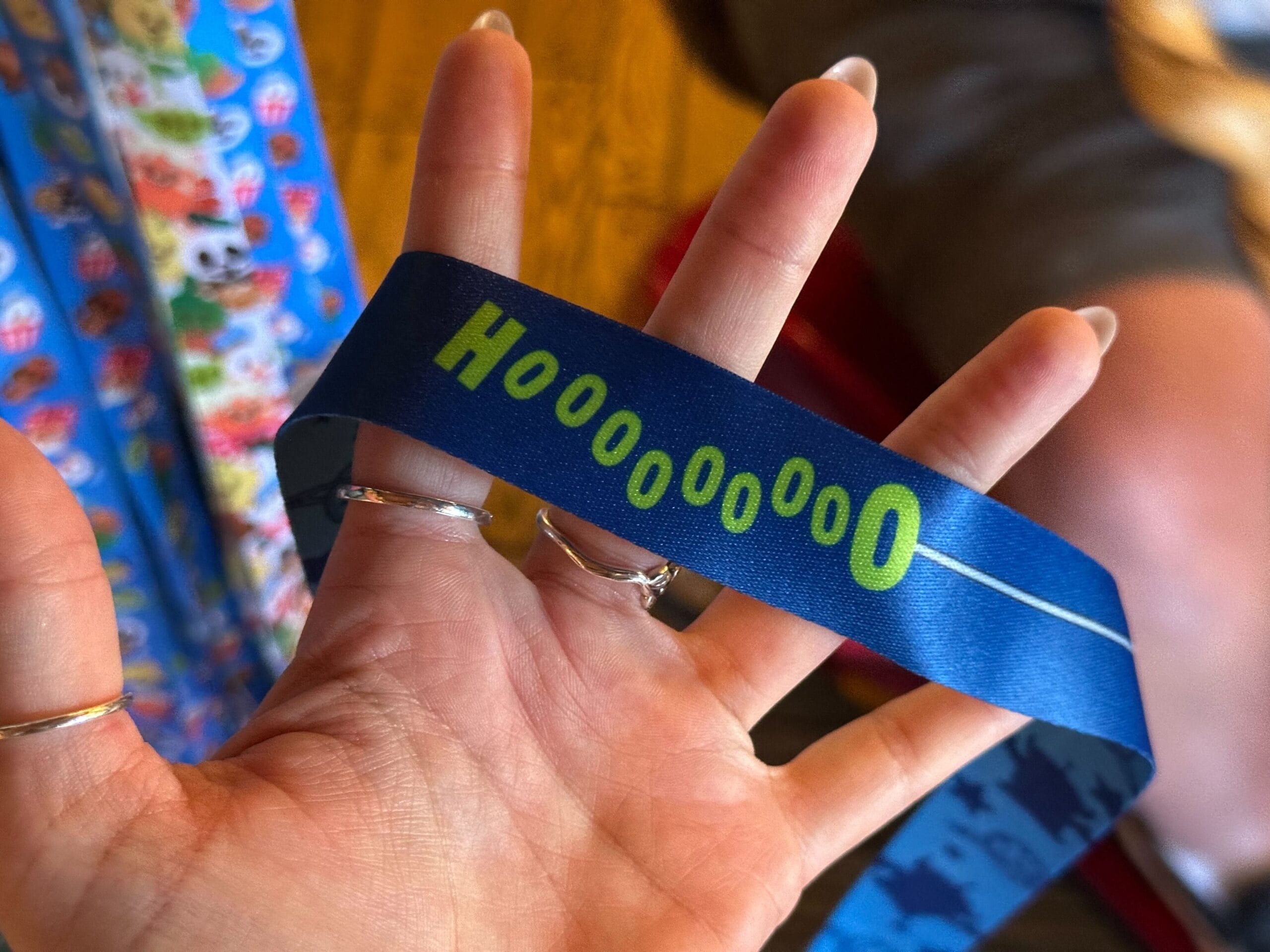 Around the neck portion of the lanyard, bright green text says “Ooooh” as the green aliens do. The reverse side of the band is the same blue base color, but it has a pattern of the Pizza Planet logo and green alien silhouettes in dark blue.