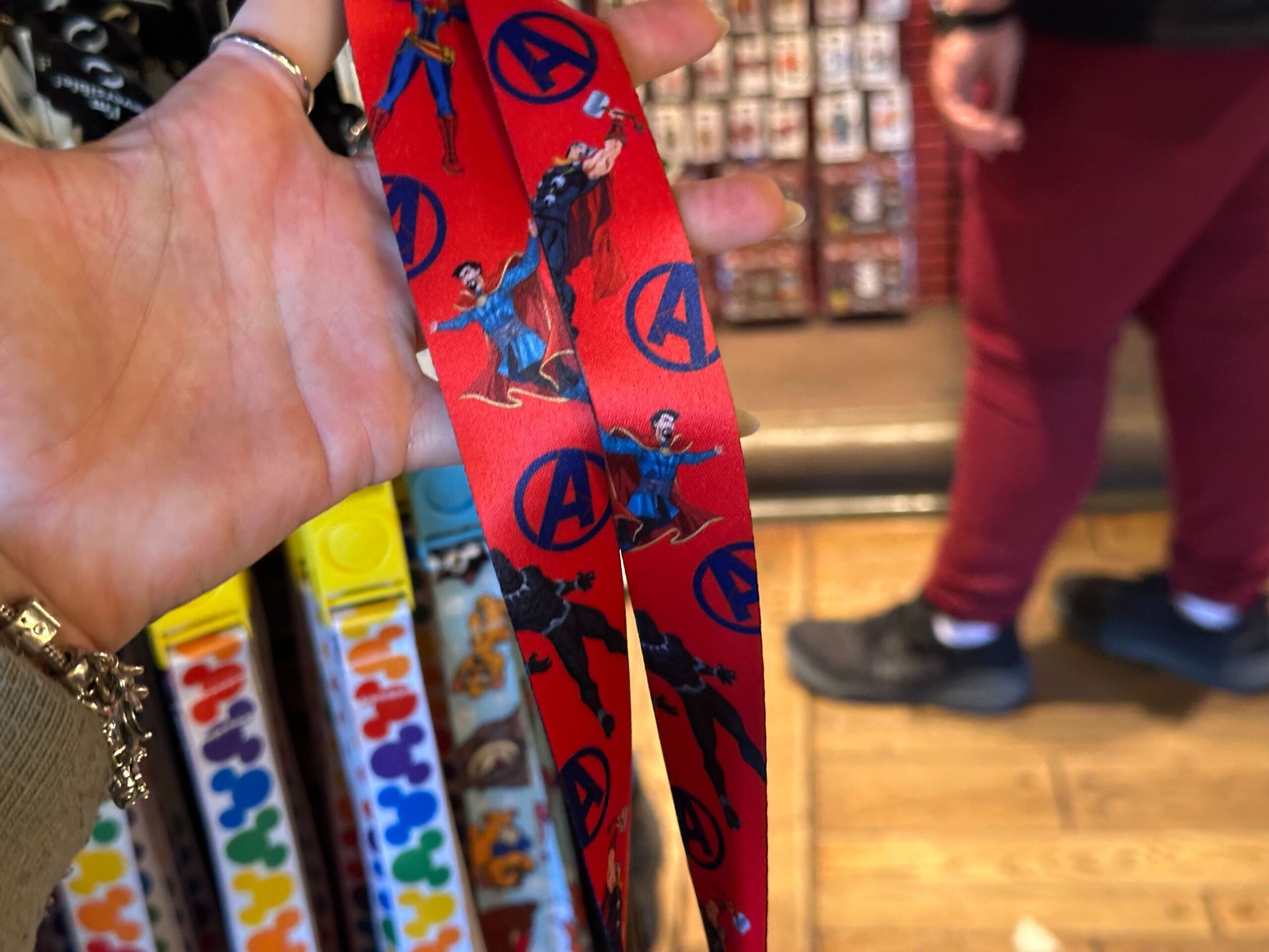 For all the Marvel lovers, this new lanyard features some of the many characters from the Marvel films. One side is dark blue with Iron Man, Captain Marvel, Thor, Doctor Strange, Black Panther, and Captain America. Above the characters, the mystic symbol found on Doctor Strange’s eye necklace is repeated in light blue.