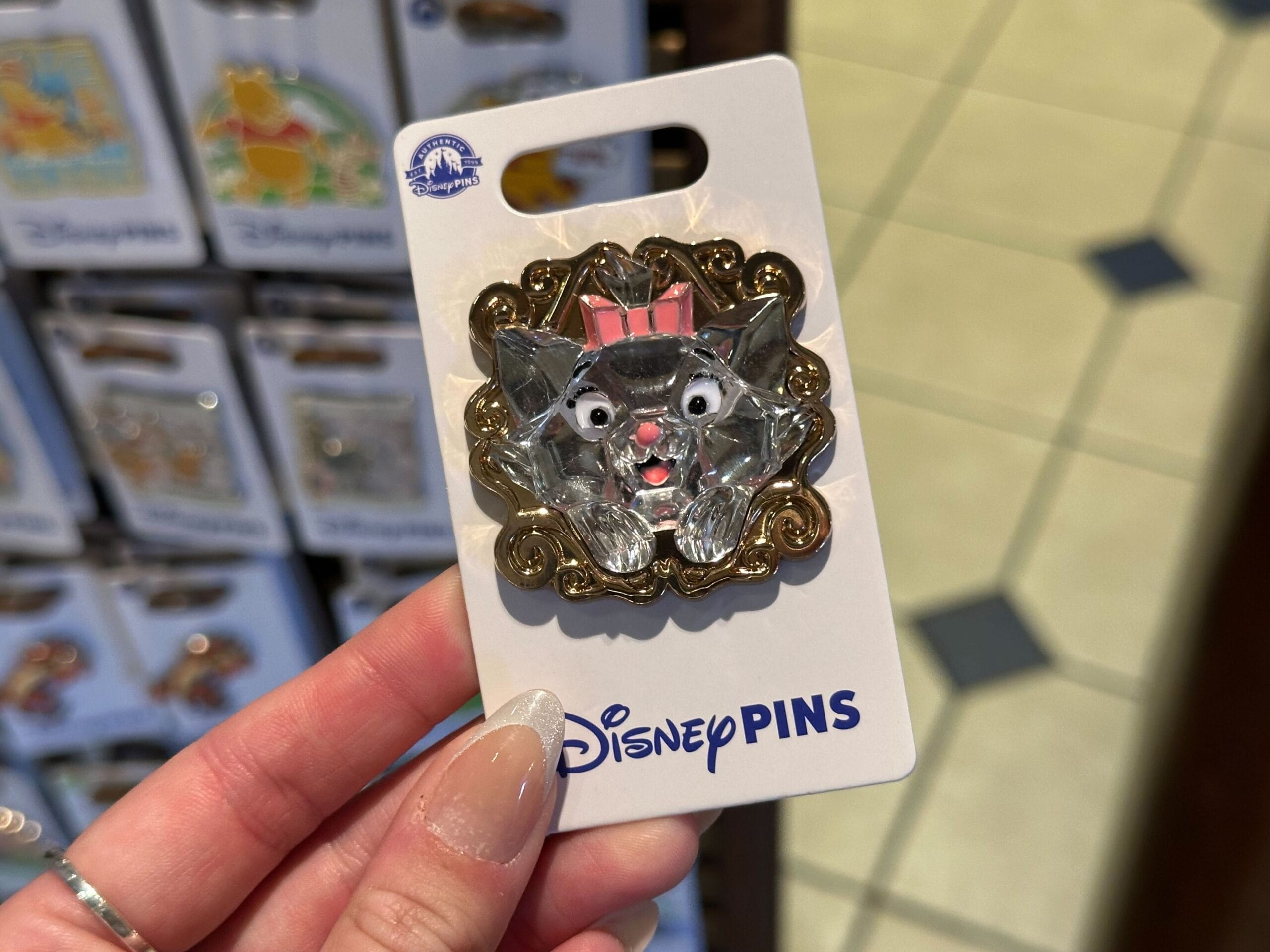 Similar in style to Stitch is this pin of Marie from “The Aristocats.” Marie is also made of semi-transparent plastic over a reflective base, with her bow and mouth adding a spot of light pink.