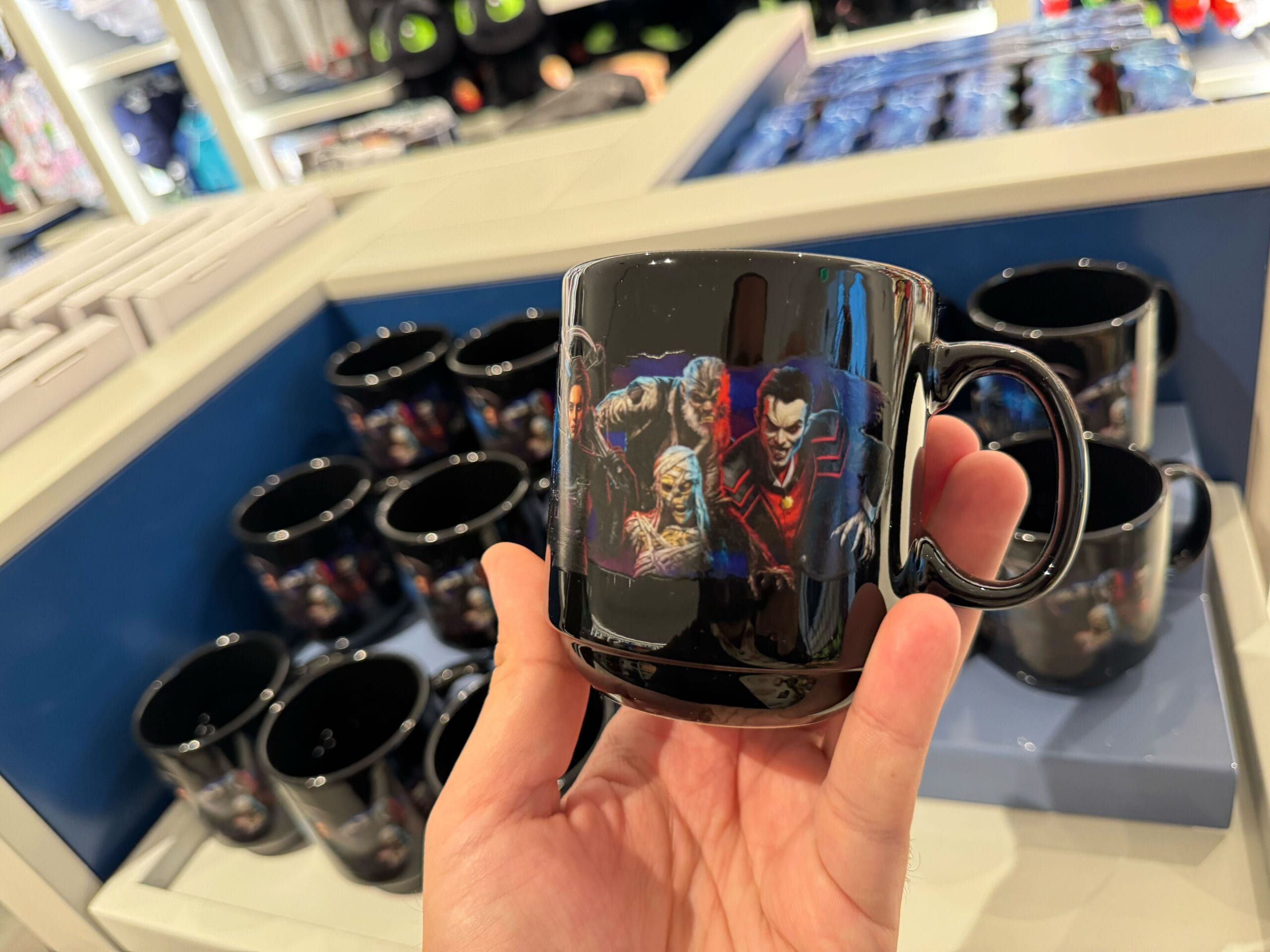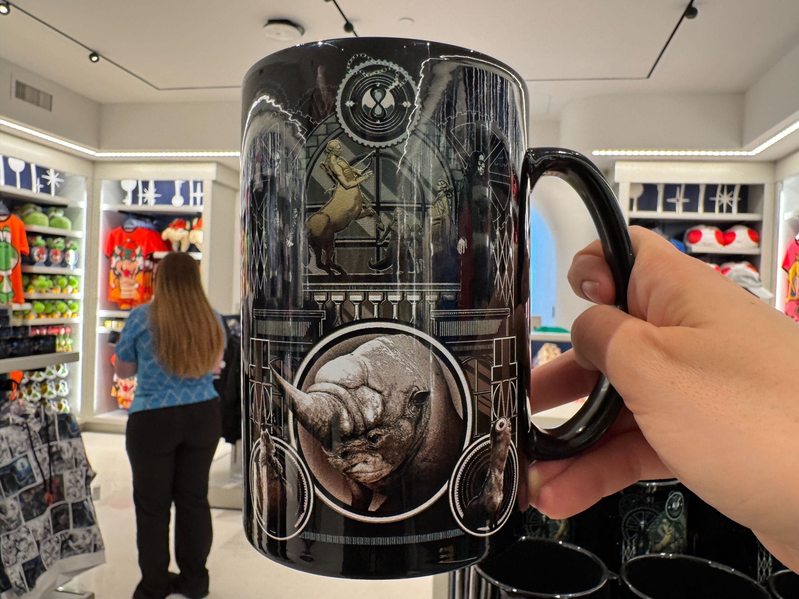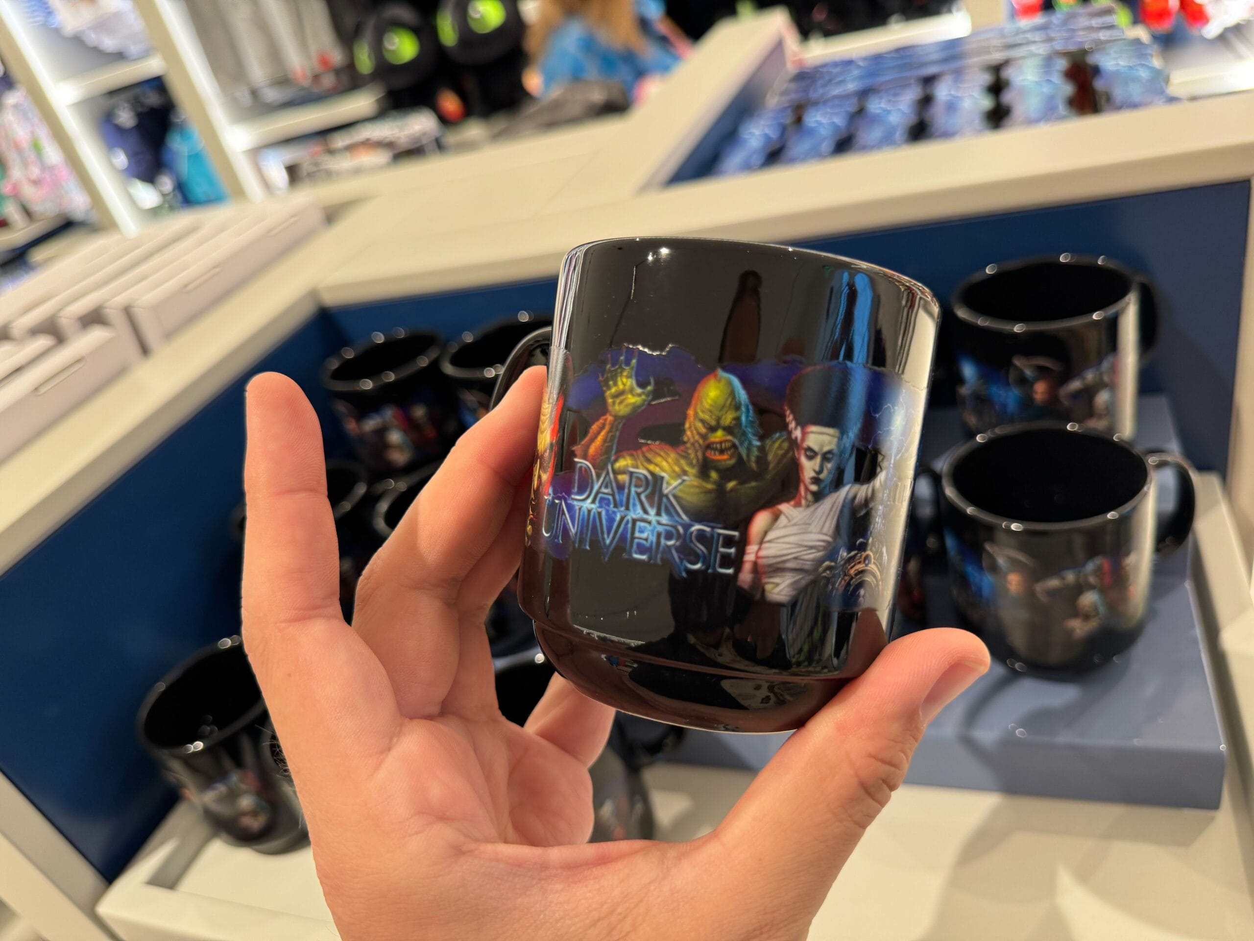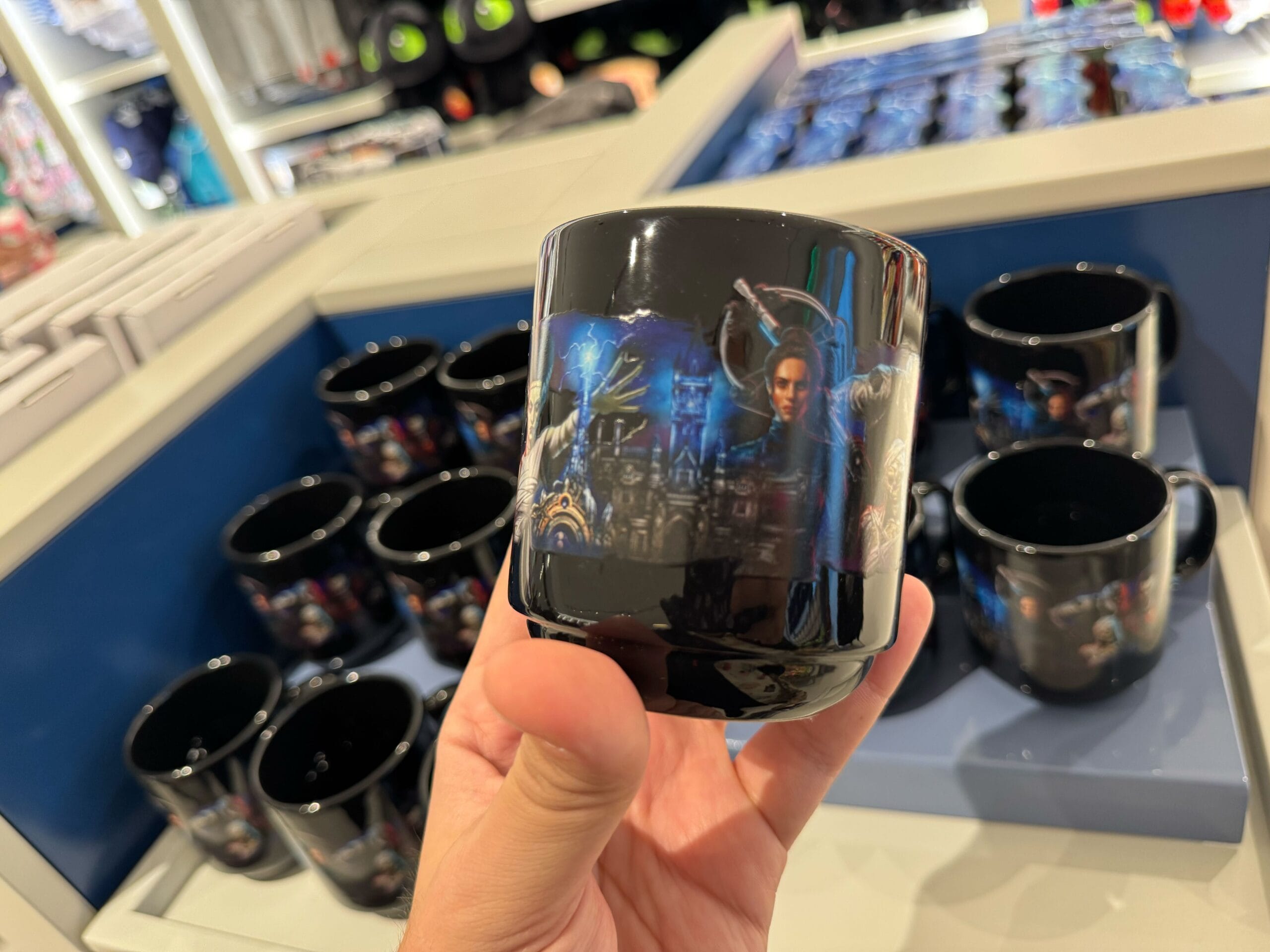 The mug is light beige with a speckled pattern. It has a golden handle. The Epic Universe logo is on the side. The interior has the celestial pattern in orange. It’s microwave and dishwasher-safe.