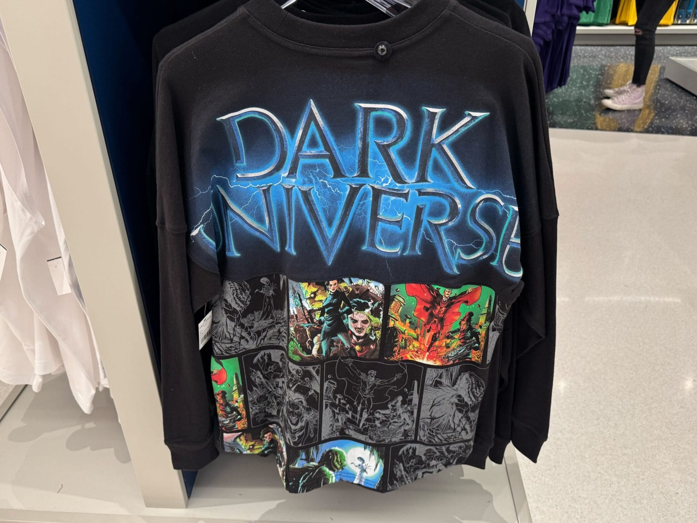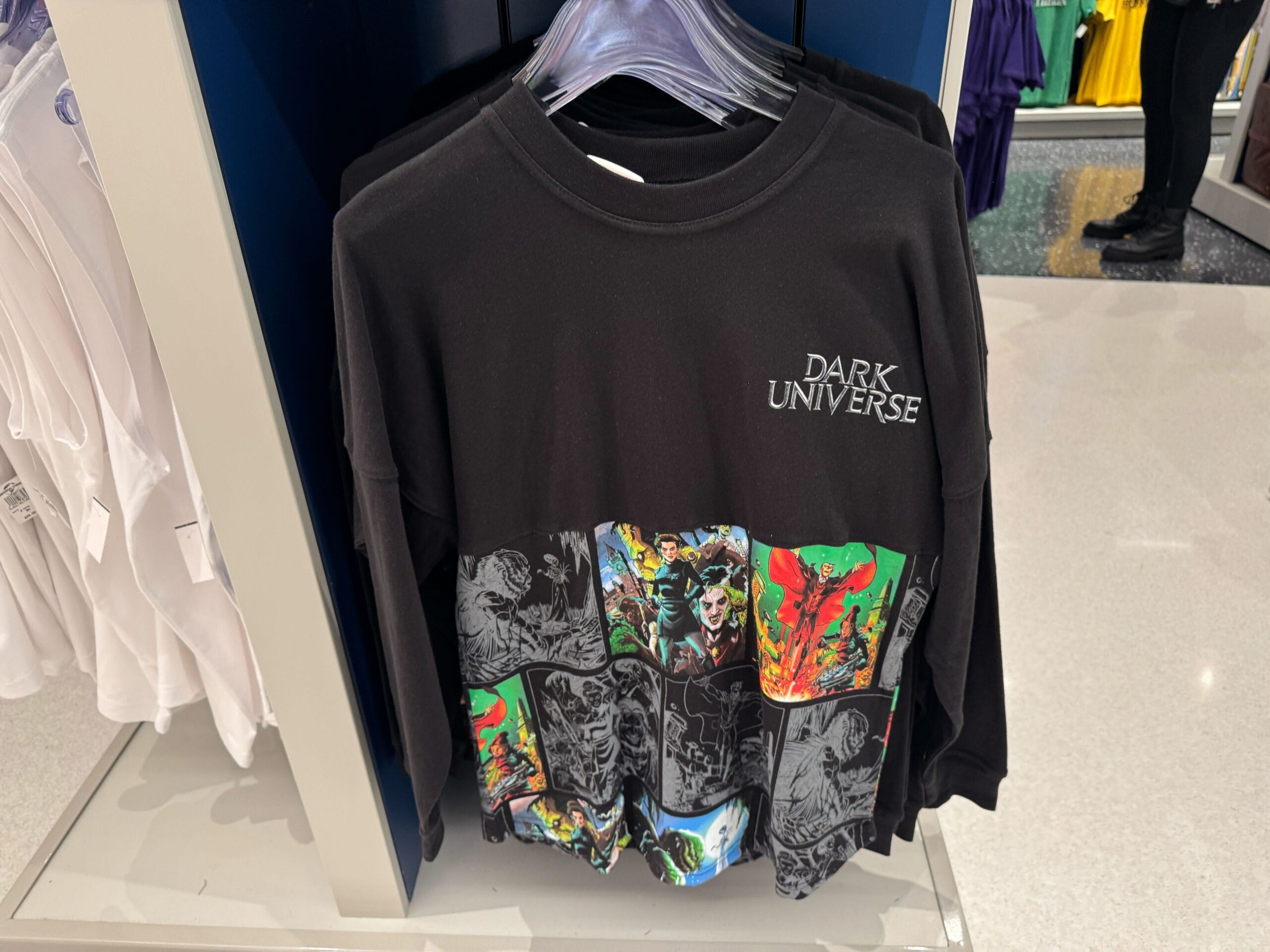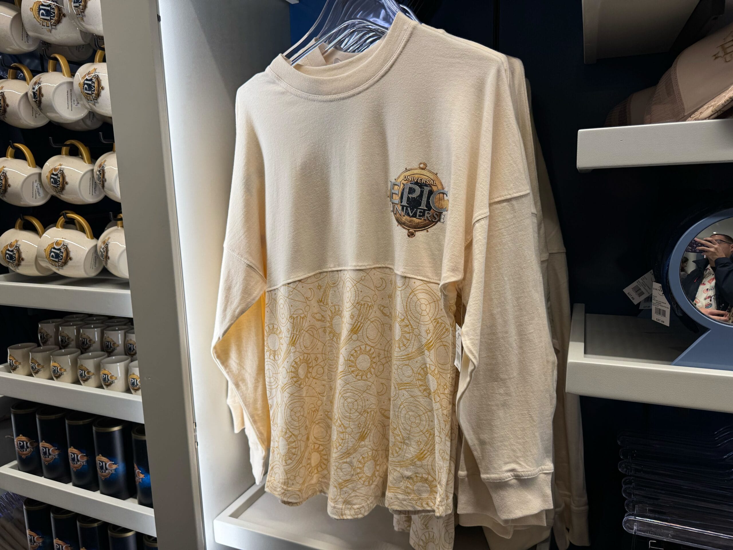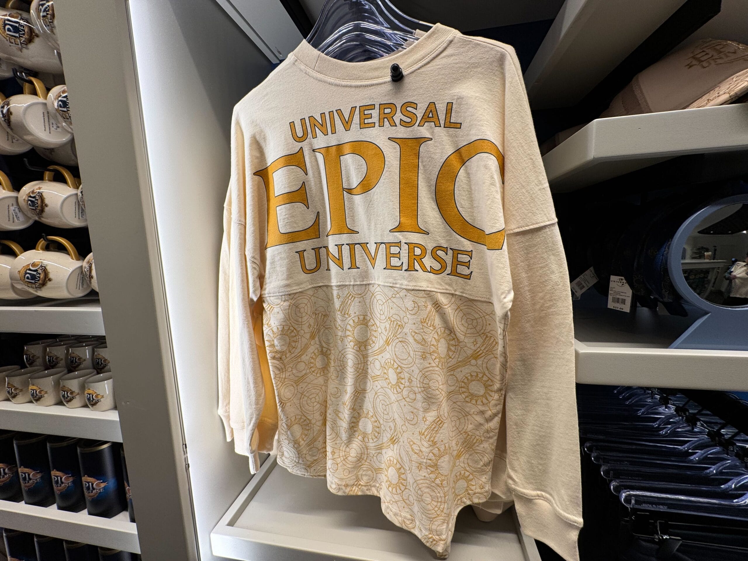The new Spirit Jersey is light beige with an orange celestial design across the bottom. The Epic Universe logo — silver letters against a gold window frame and blue starry sky — is on the left breast.