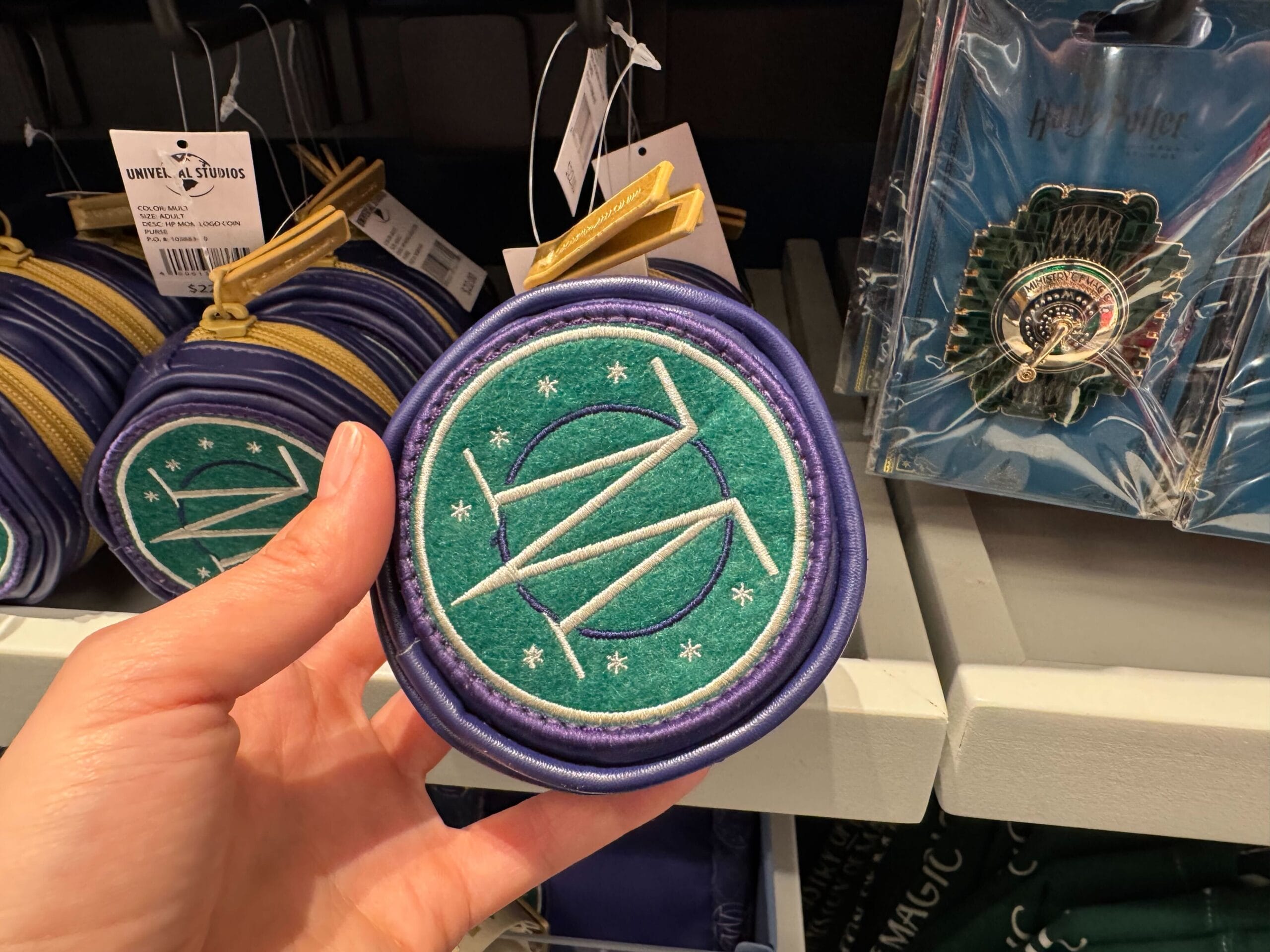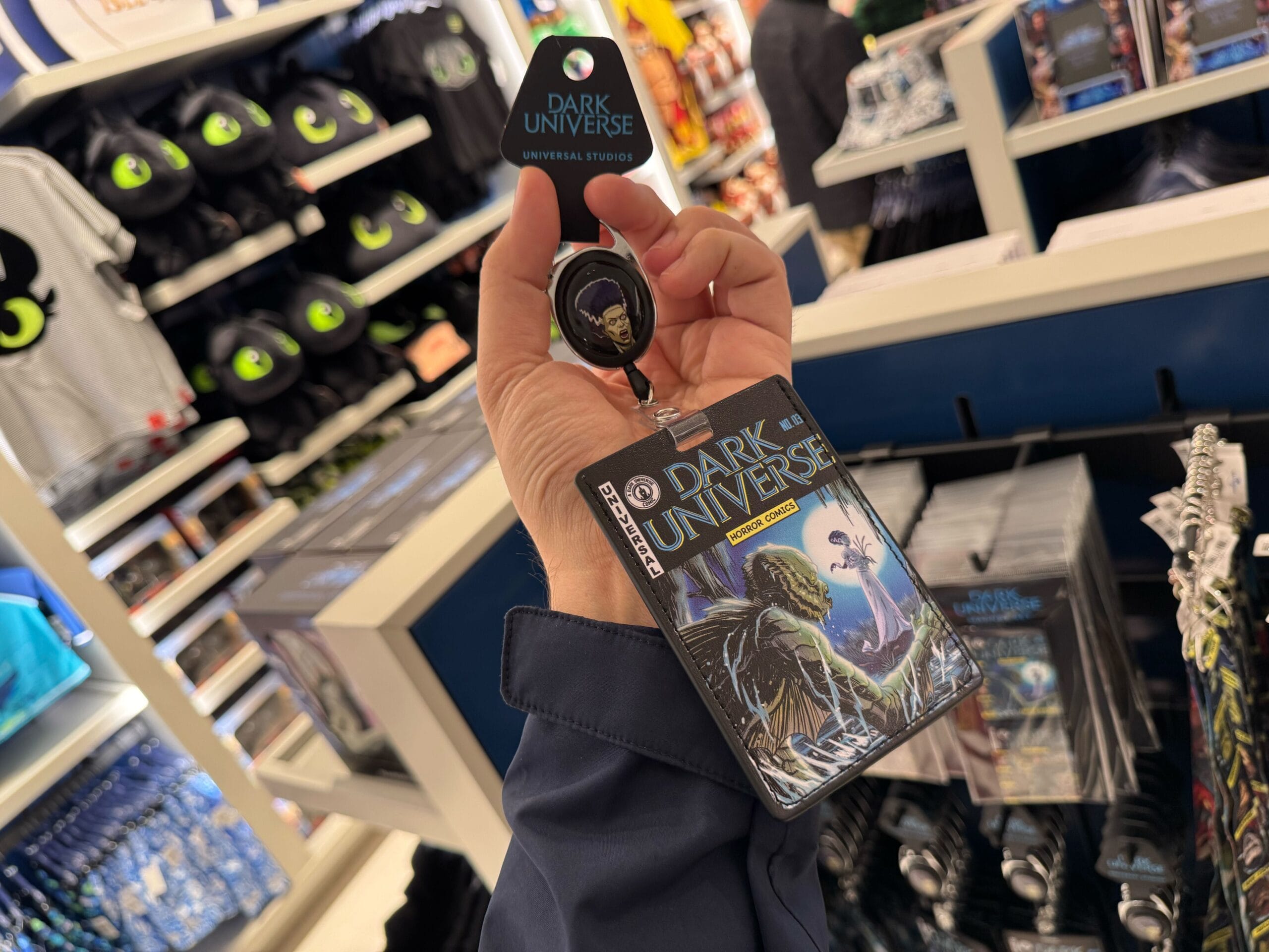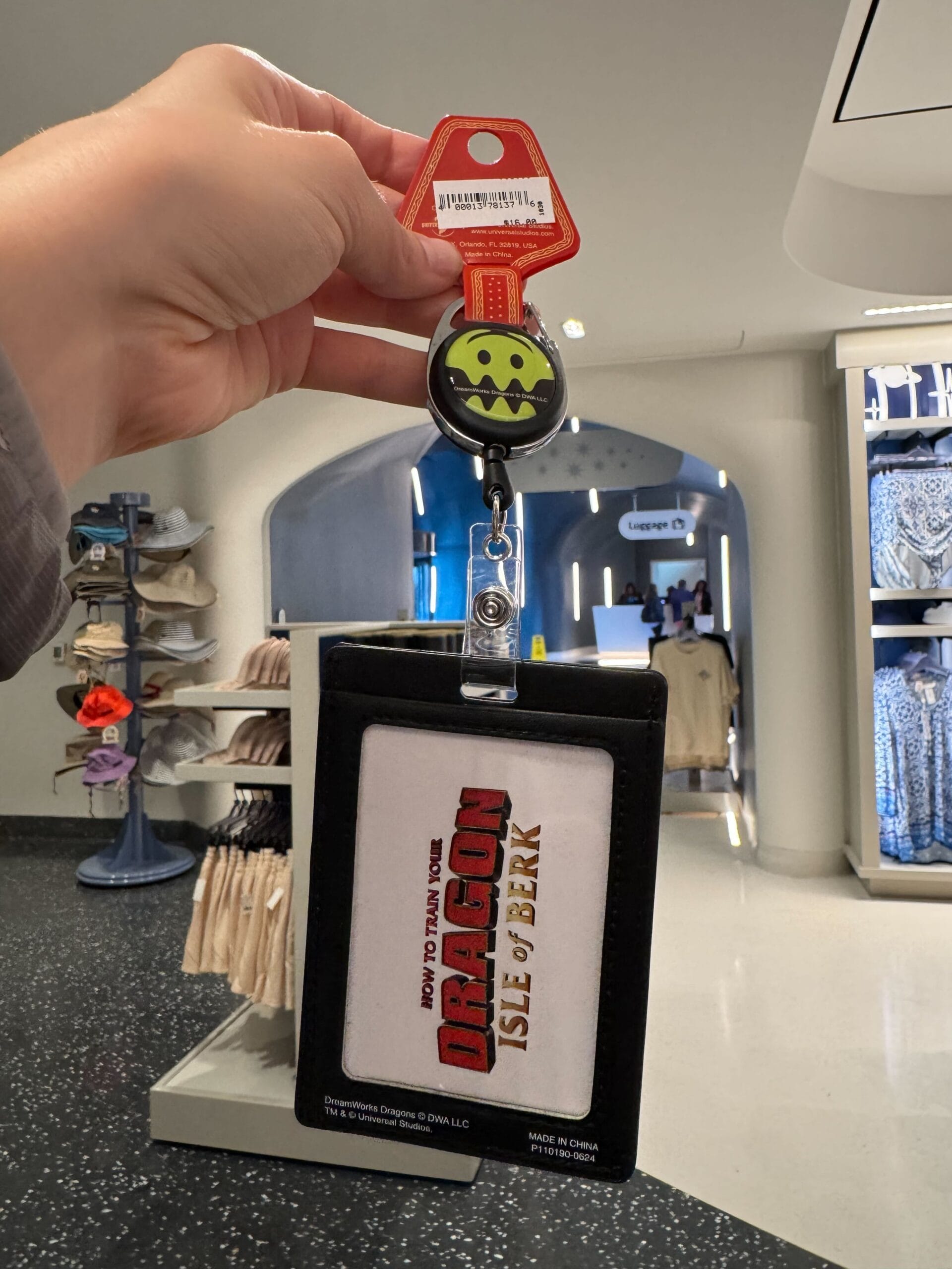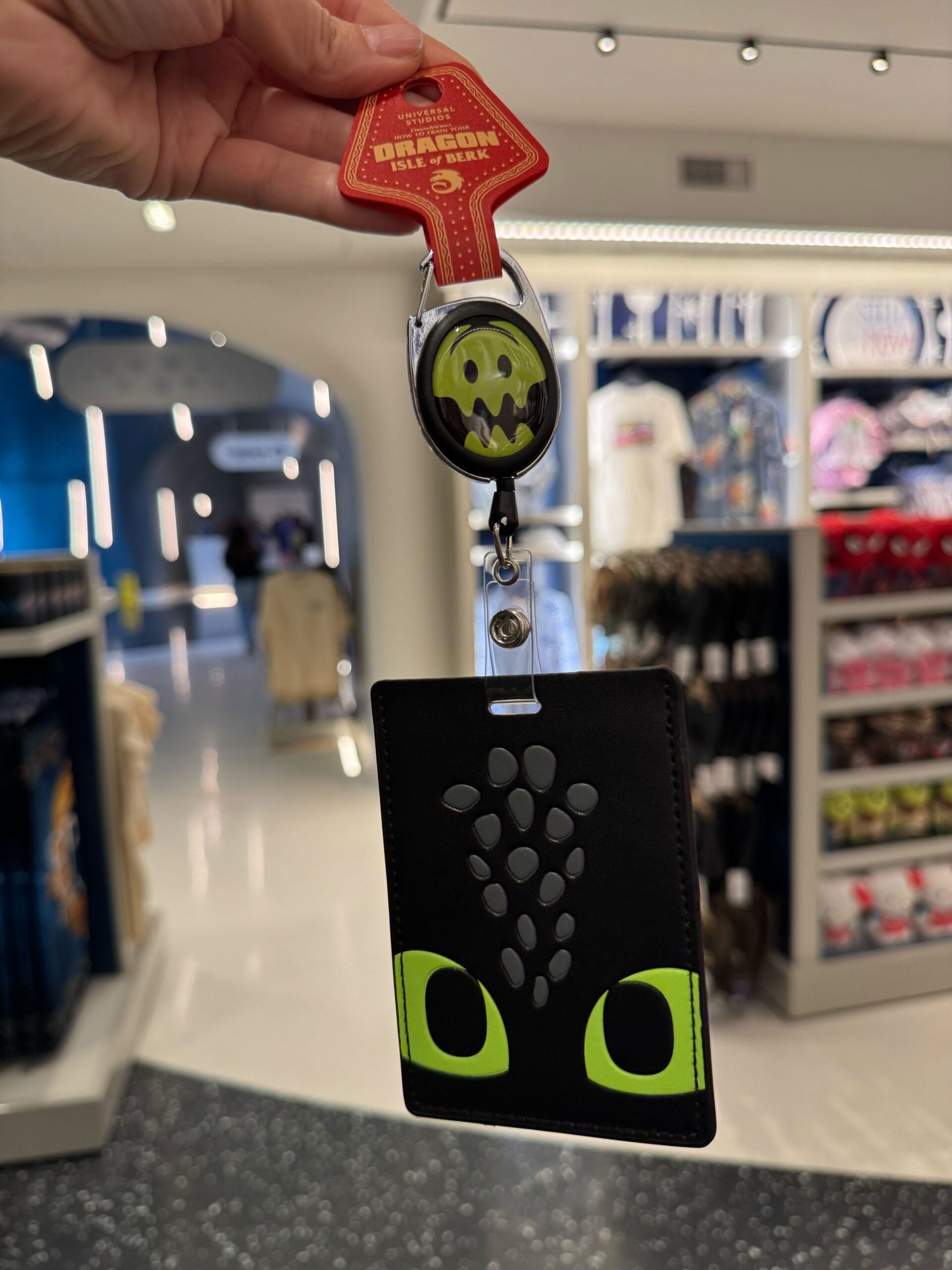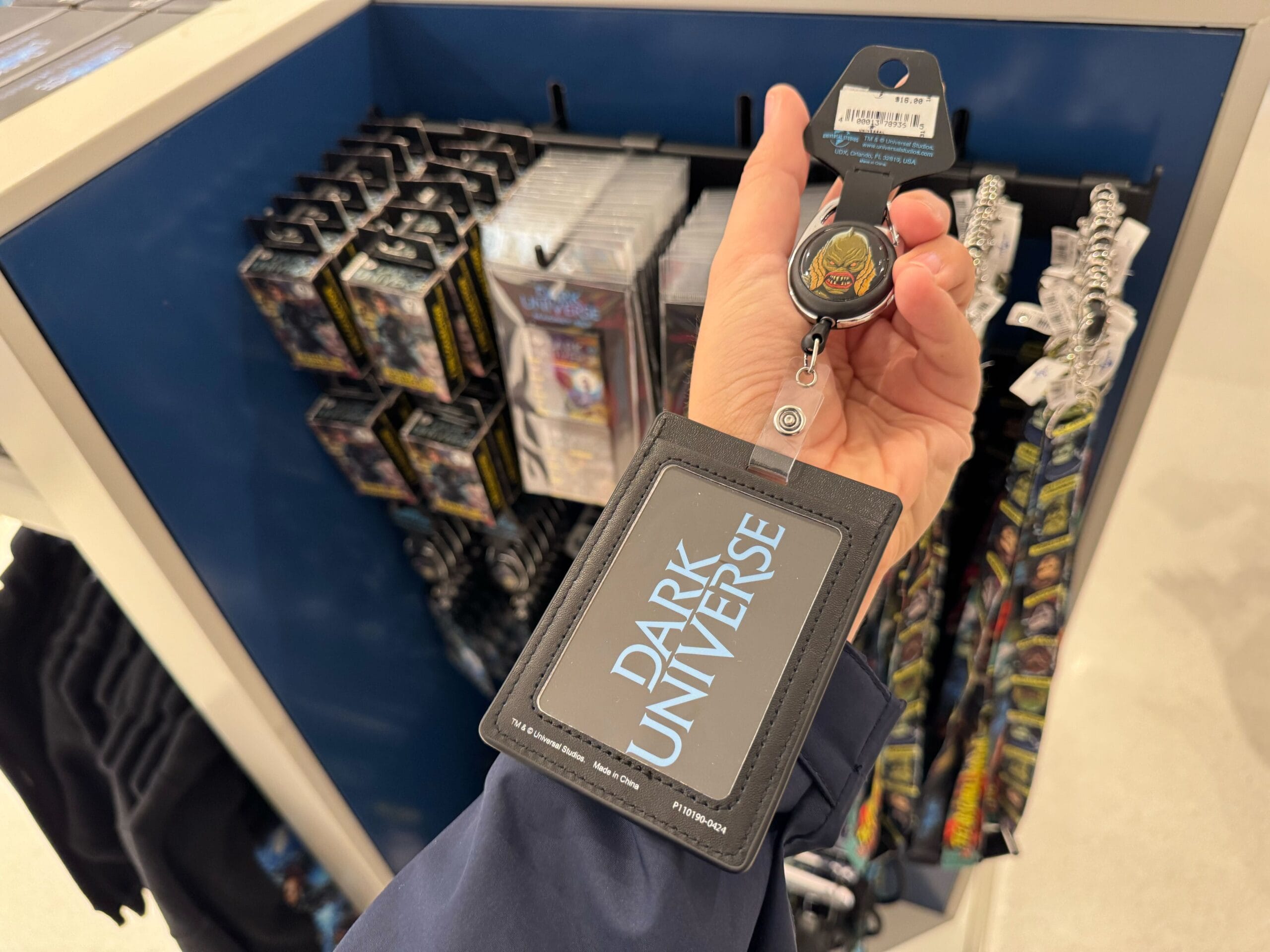This pleather cardholder is dark blue. The front features the Epic Universe logo. The back has a transparent slot for an ID. It’s on a detractable clip featuring the logo.