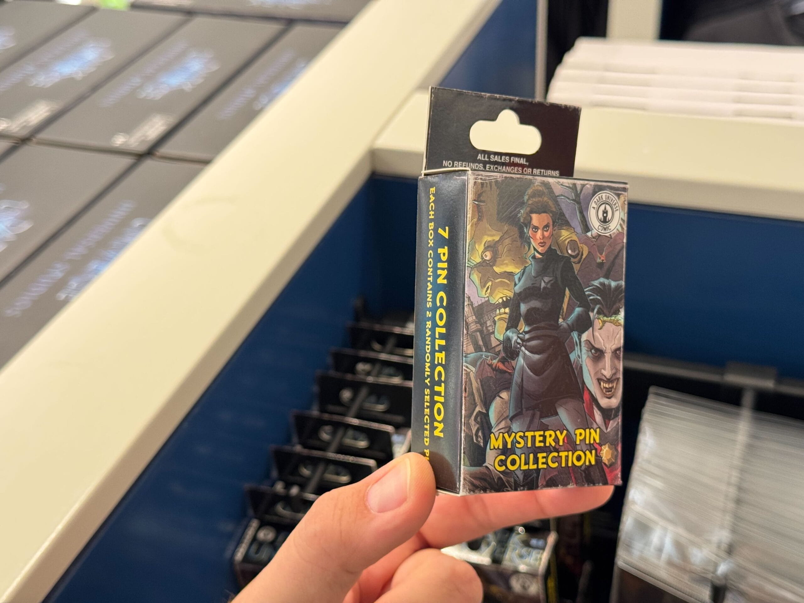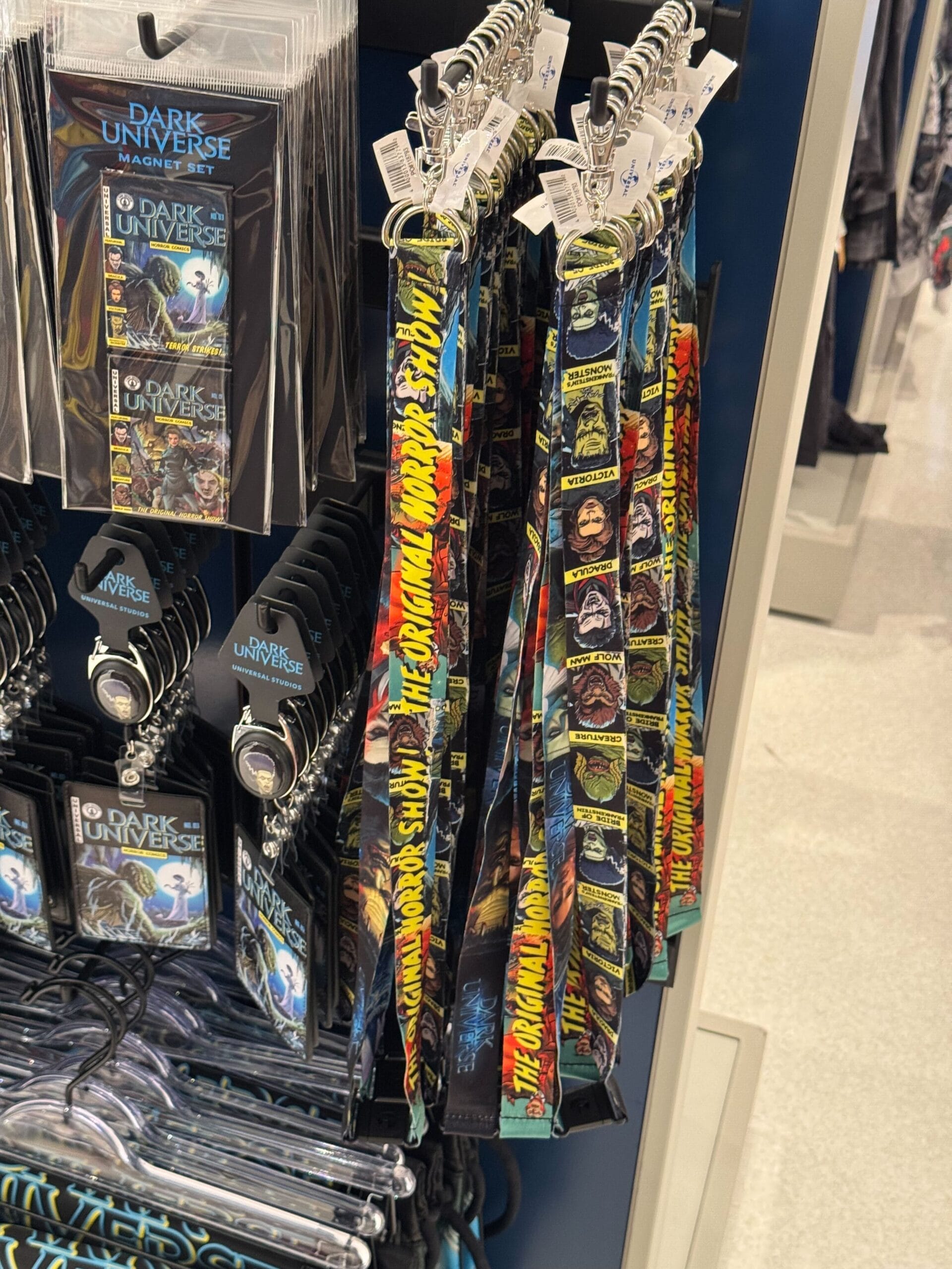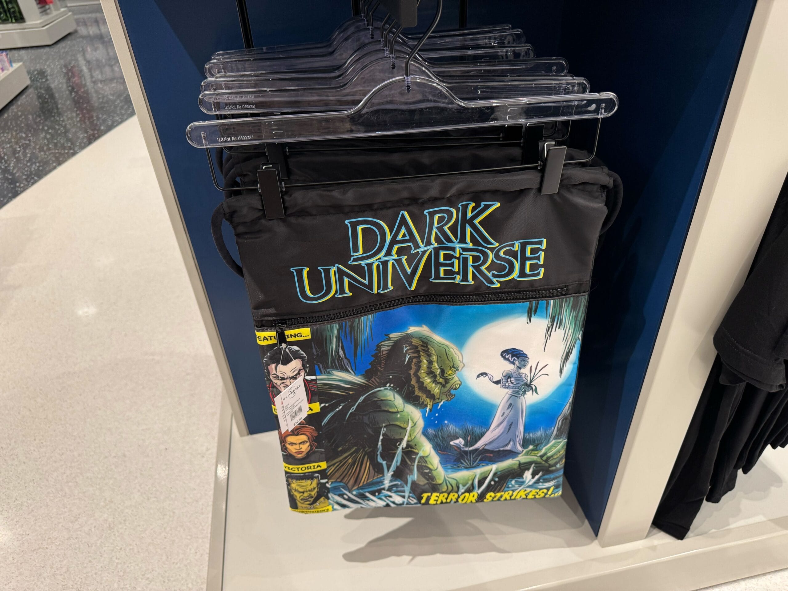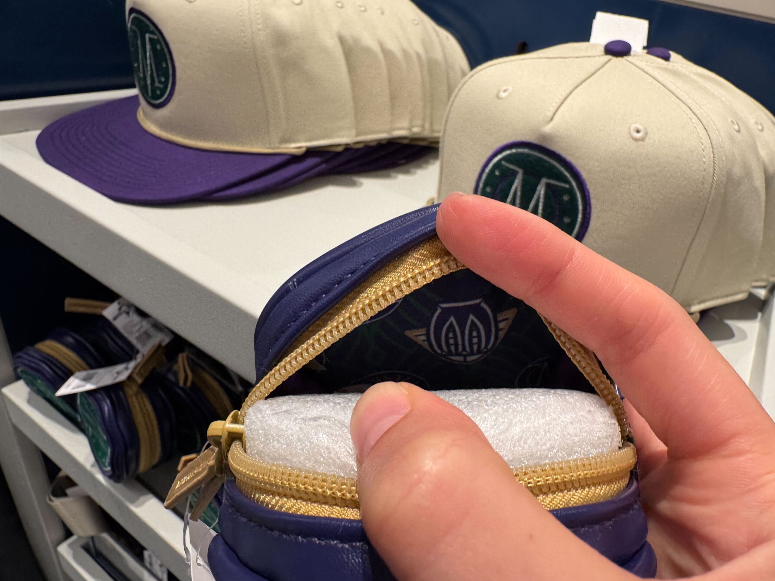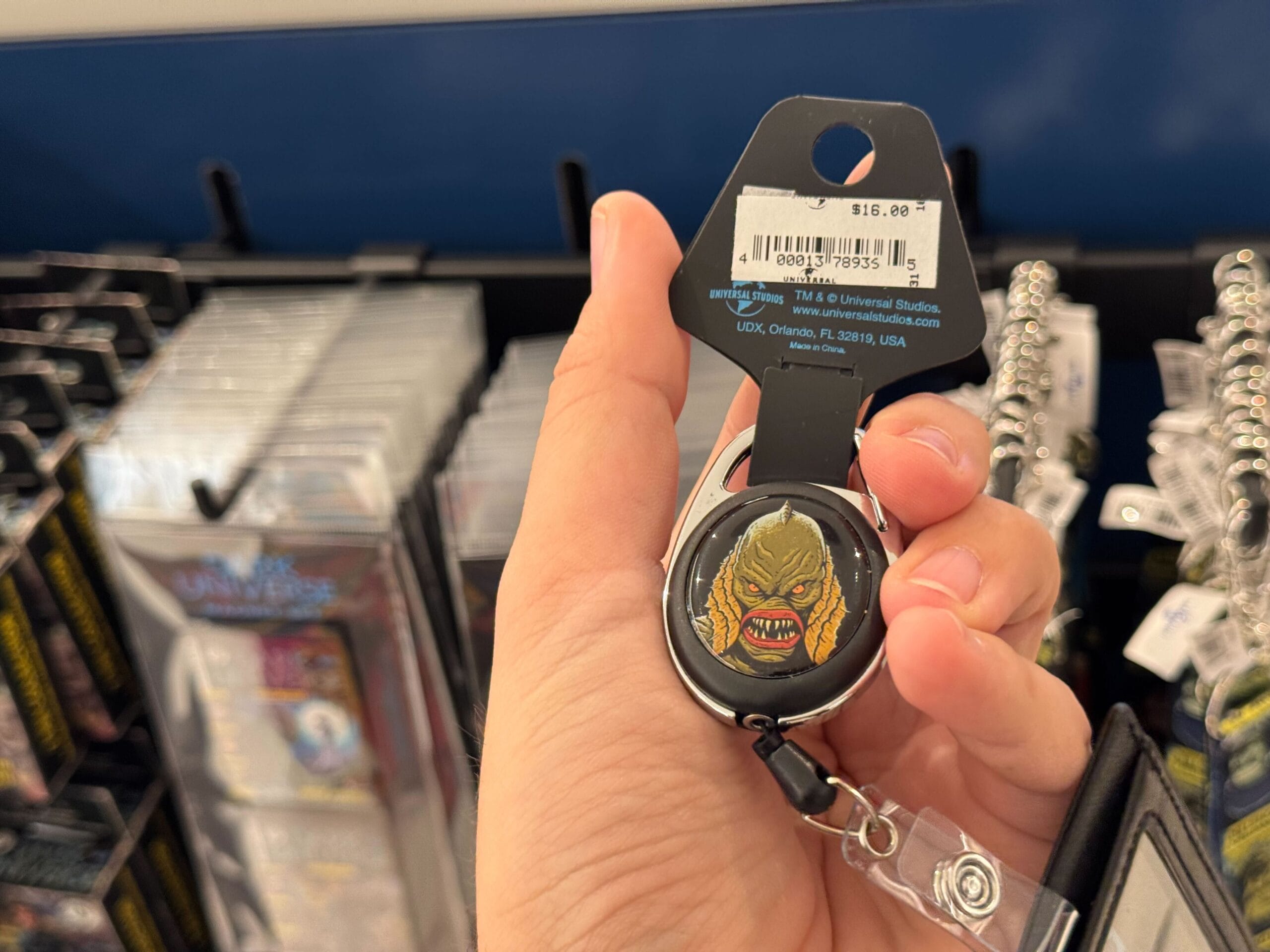 This pleather cardholder is dark blue. The front features the Epic Universe logo. The back has a transparent slot for an ID. It’s on a detractable clip featuring the logo.