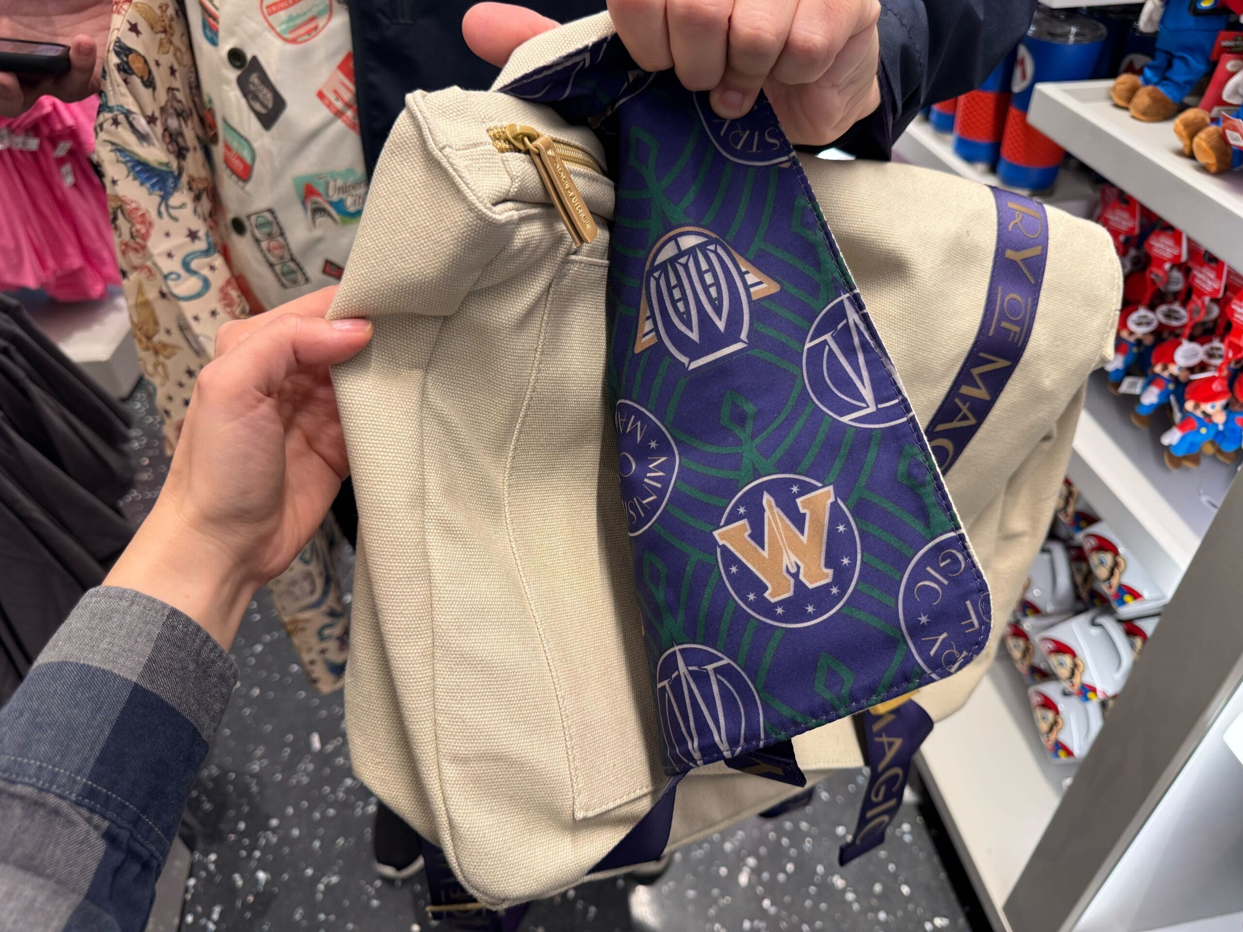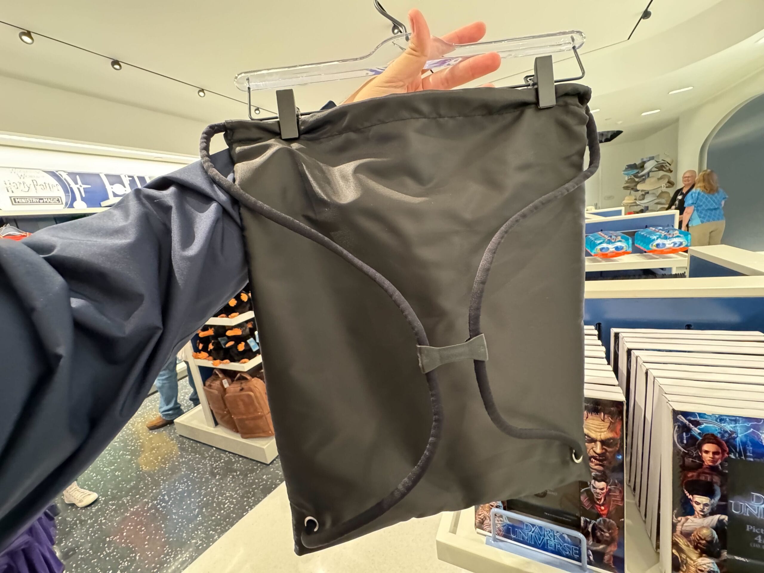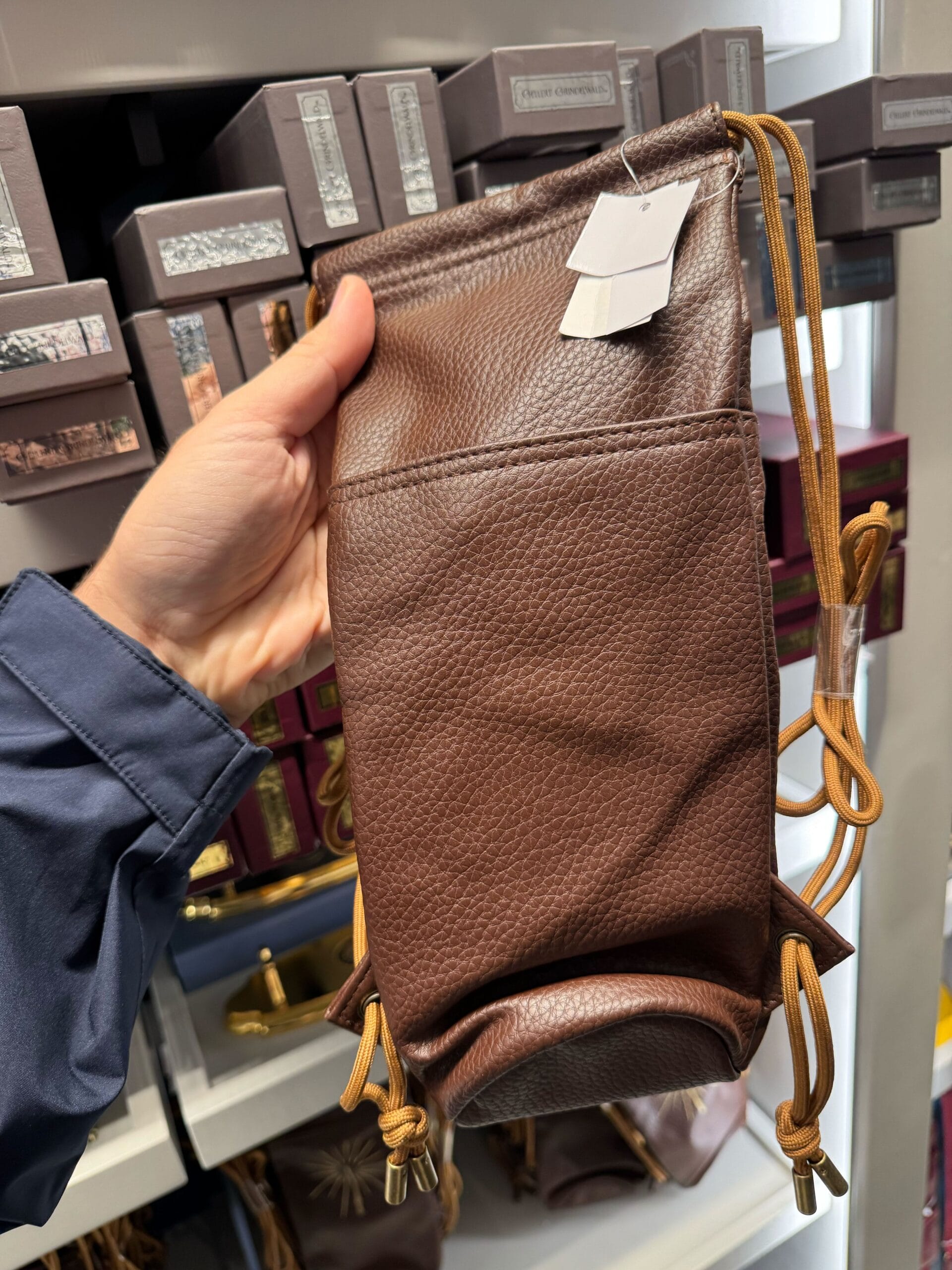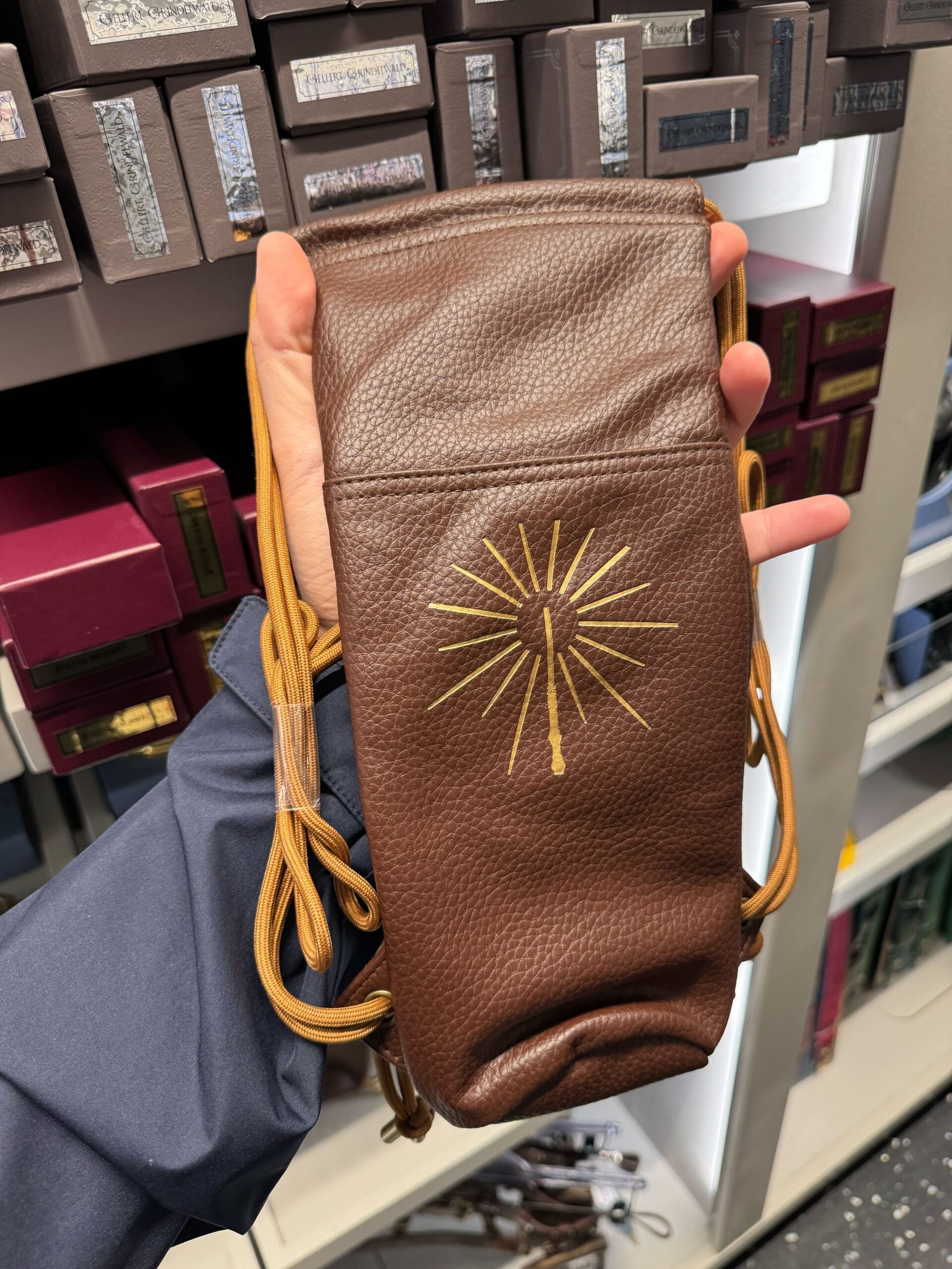 This bag features the same wand logo. It’s brown with exterior pockets and a drawstring pocket. The drawstrings are orange. It looks to be the right size to carry a wand box or a water bottle.