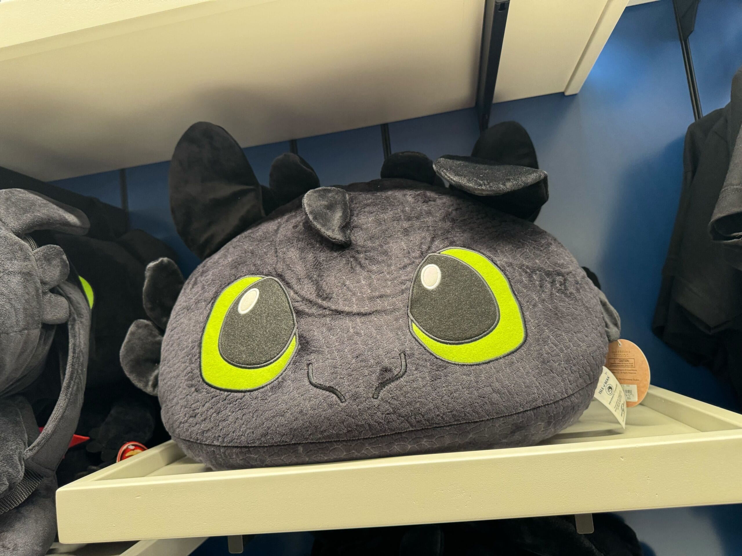 The pillow is Toothless’ head, with scale details, embroidered eyes, and nostrils.