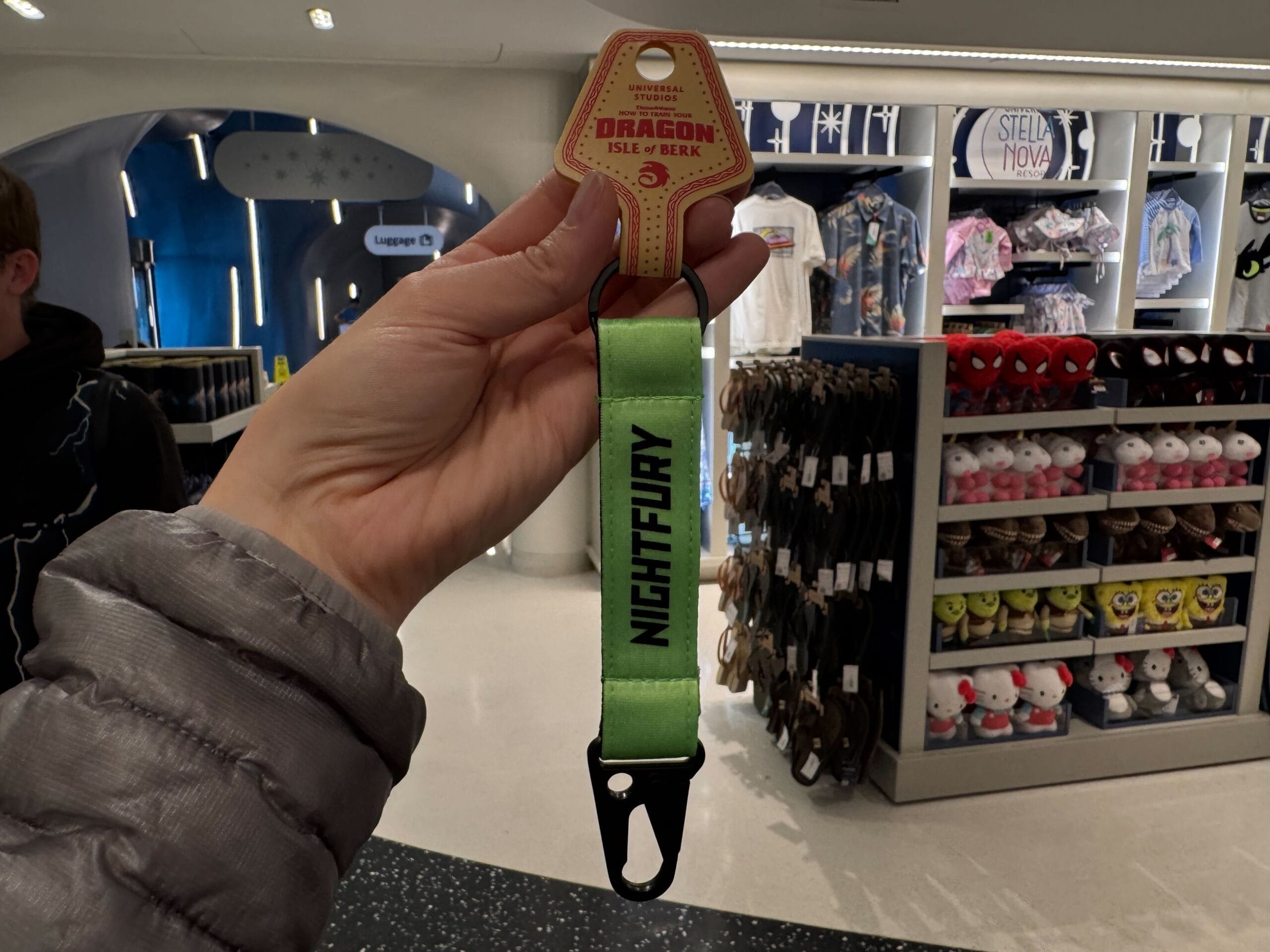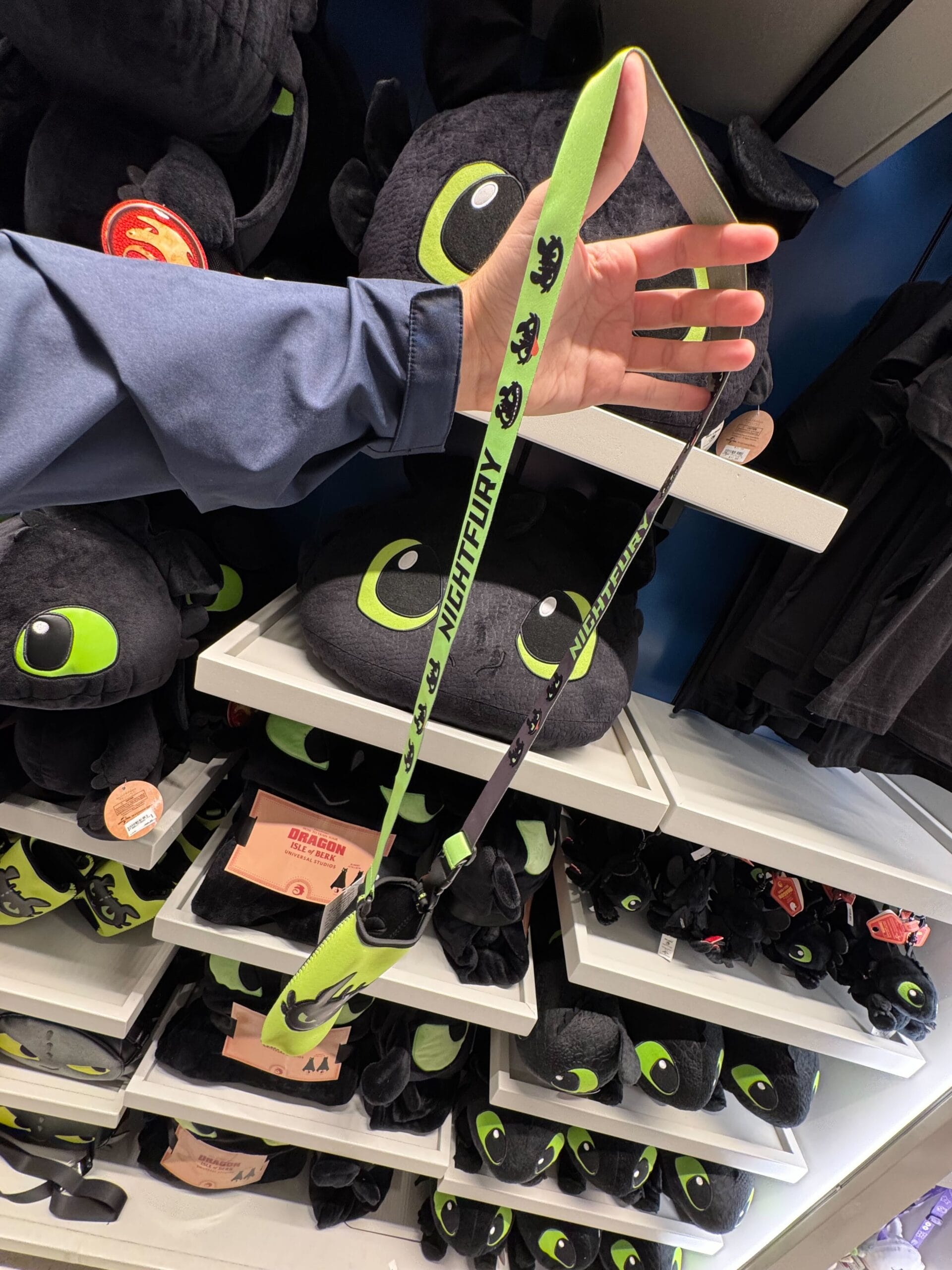 The lanyard is green on one side with Toothless’ face, “Night Fury,” and “Isle of Berk” in black.