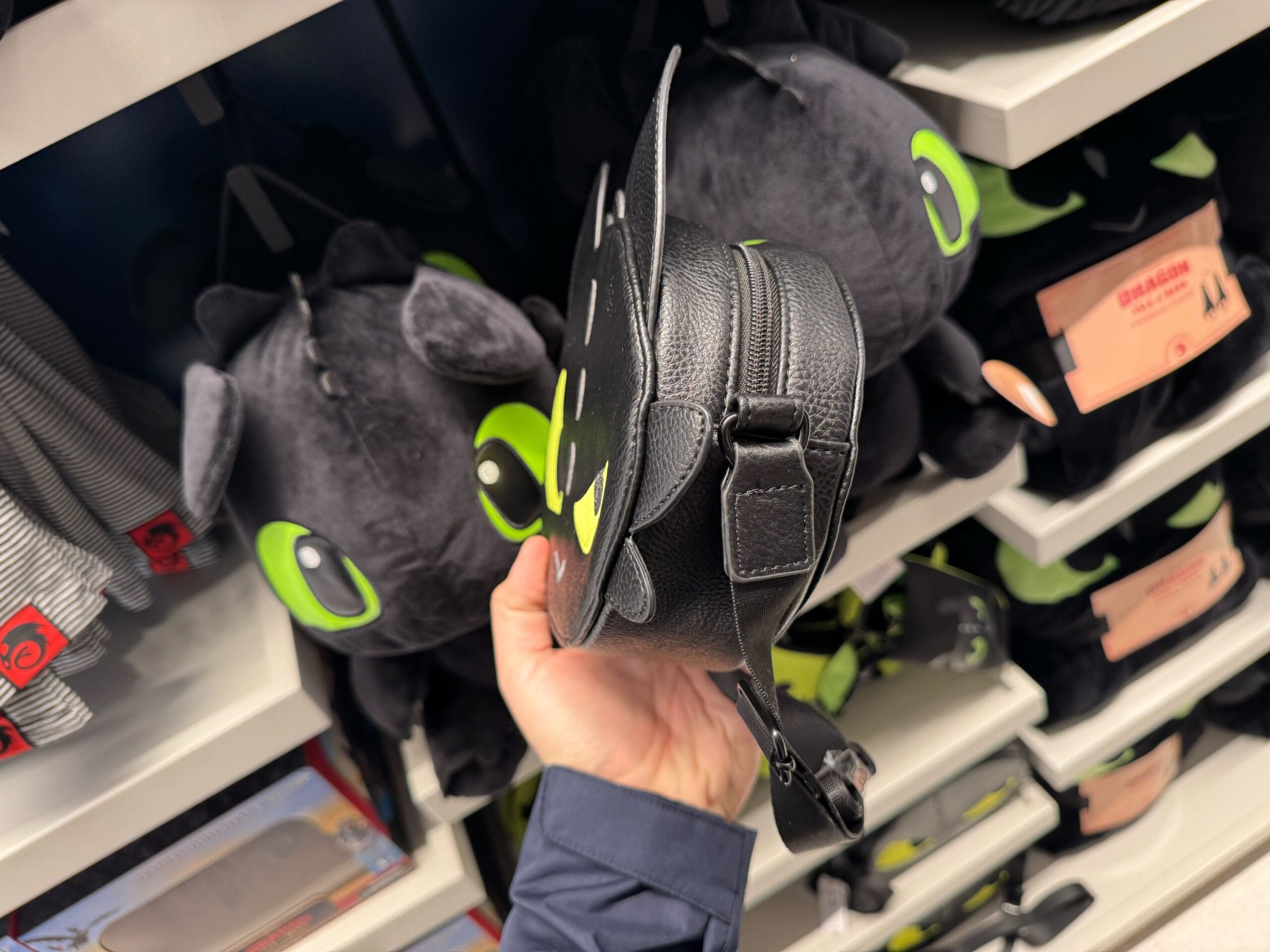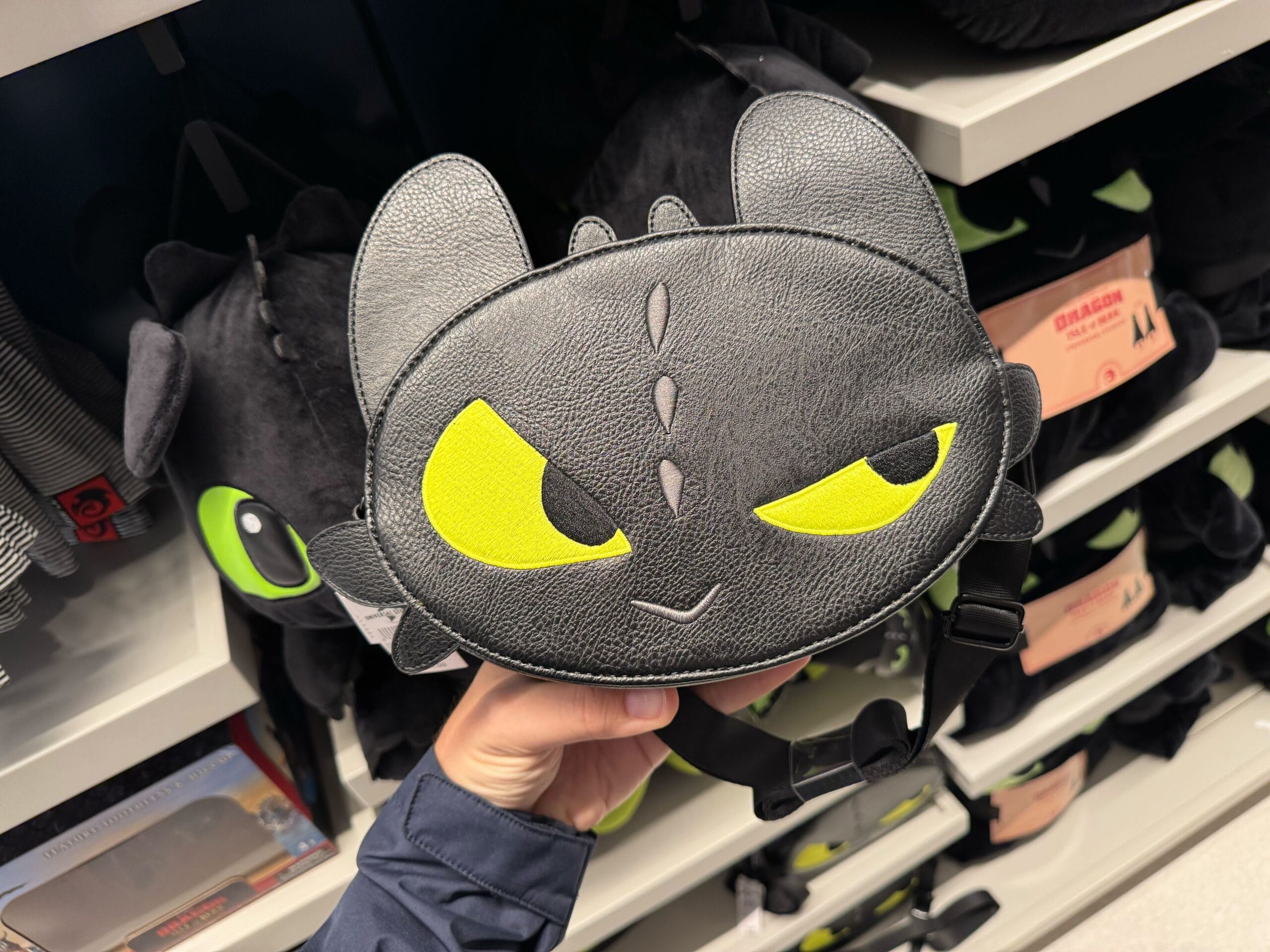 This pleather oval-shaped purse resembles Toothless’ head. His eyes and other facial features are embroidered on the front. Spikes stick out of the sides.